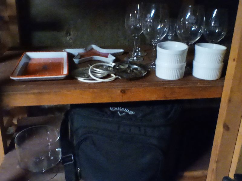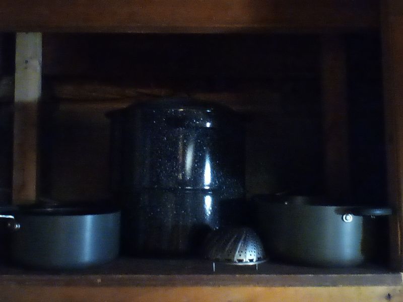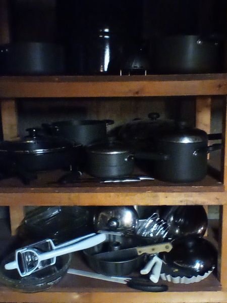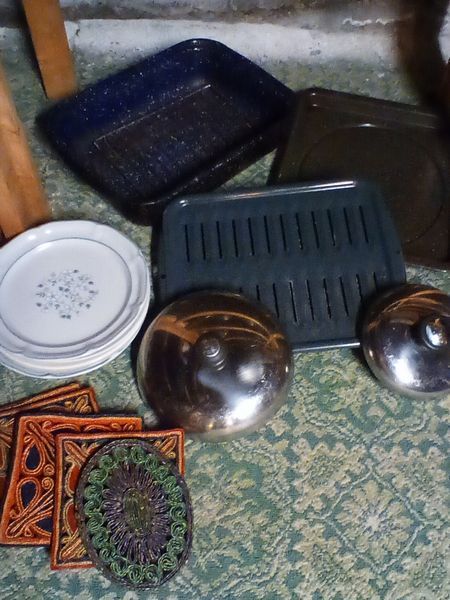 Cookware and Kitchen Items. Assort pots & pans with lids, incl very lg steamer pot with lid; Calaway travel bag with contents. See photos for details of items incl. Loc in basement. Shelving not incl.