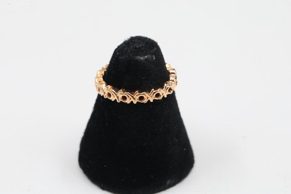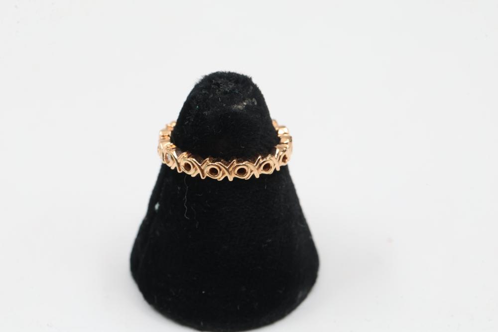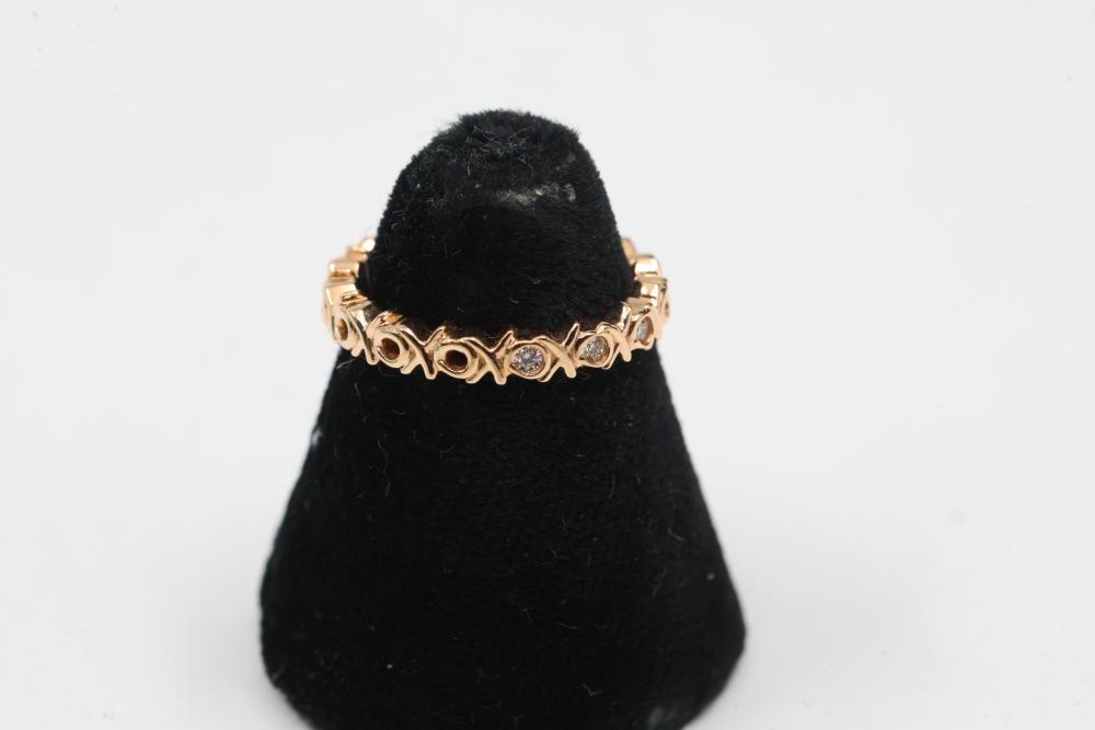 New 18K Rose Gold & Diamonds Tiffany & Co. Paloma Picasso Graffiti Narrow Love Kisses Ring. Designed by Paloma Picasso, this ring features a graffiti-inspired design with "love" and "kisses" motifs. Crafted in 18K rose gold, it is a striking addition to any jewelry collection. Size 5.25. Total weight being 3.5 grams. Retail value of $2,500.