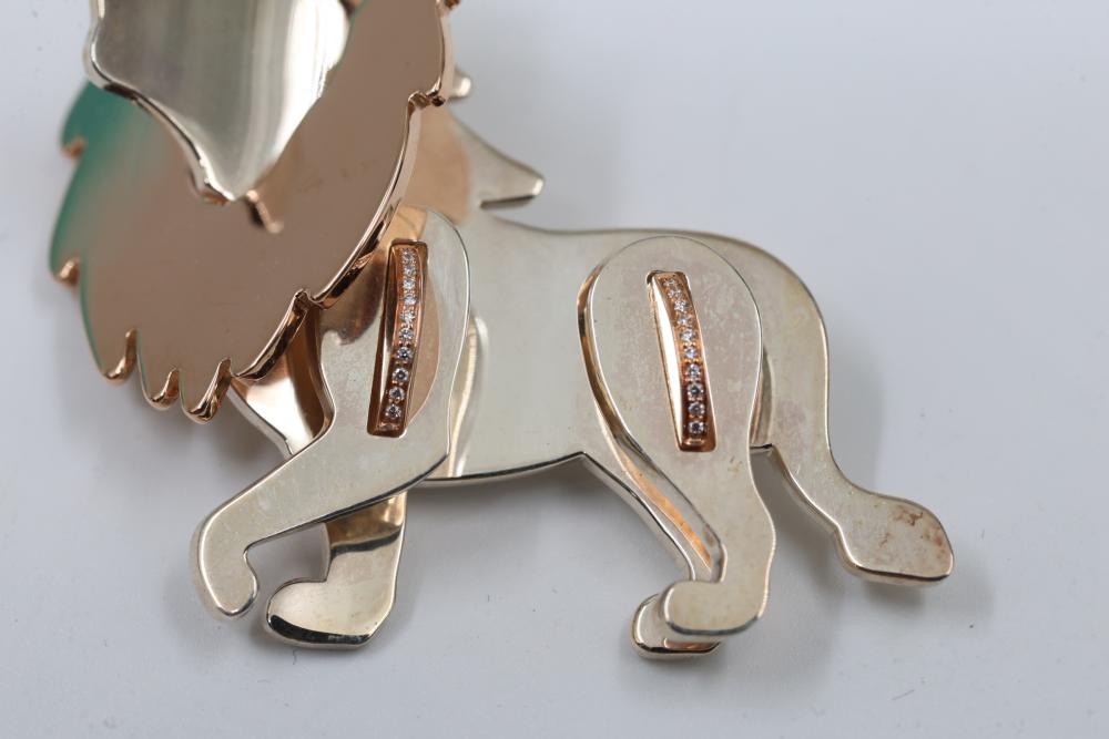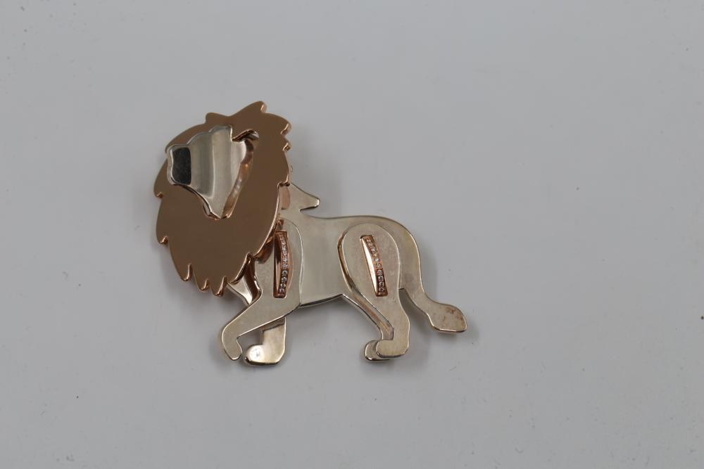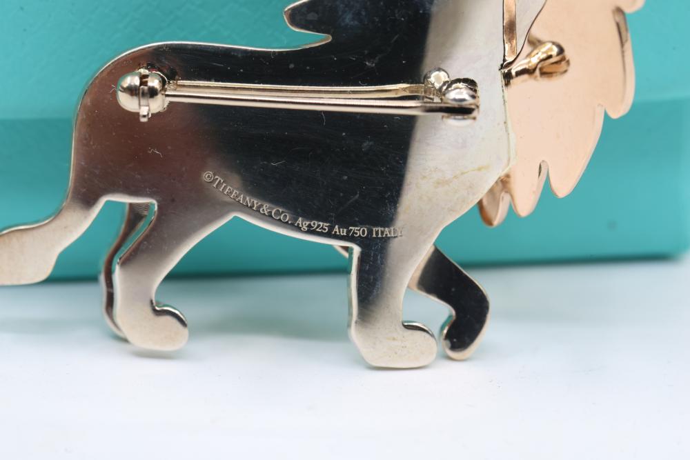 New Tiffany & Co. Sterling Silver and 18K Gold Lion Brooch with Pouch. Features a lion design crafted in sterling silver with 18K gold & Diamond accents. Includes the original Tiffany & Co. turquoise pouch. Total weight being 22.8 grams total. Retail value of $2,250.