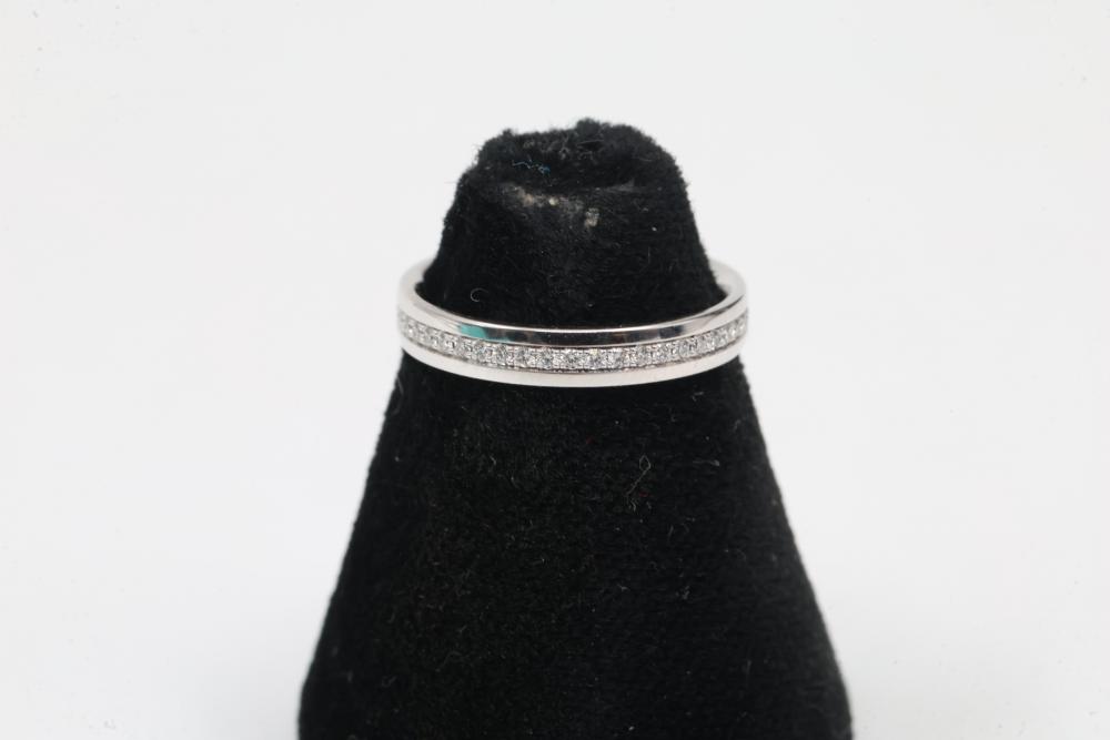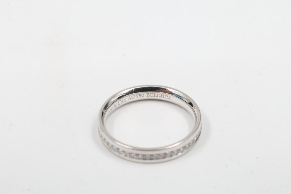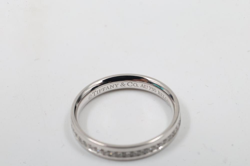 New Tiffany & Co. 18K White Gold Full Circle Metro Diamond Wedding Band Ring in Original Box. Features an 18K band adorned with diamonds, inscribed with hallmarks. Includes the original Tiffany & Co. blue box with the interior black velvet insert. Size 4.5. Total weight being 2.6 grams. Retail value of $4,000.