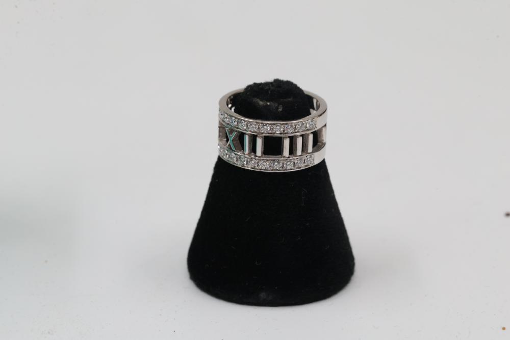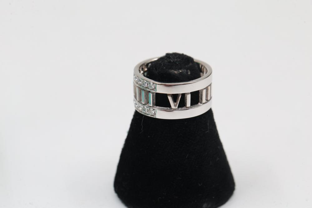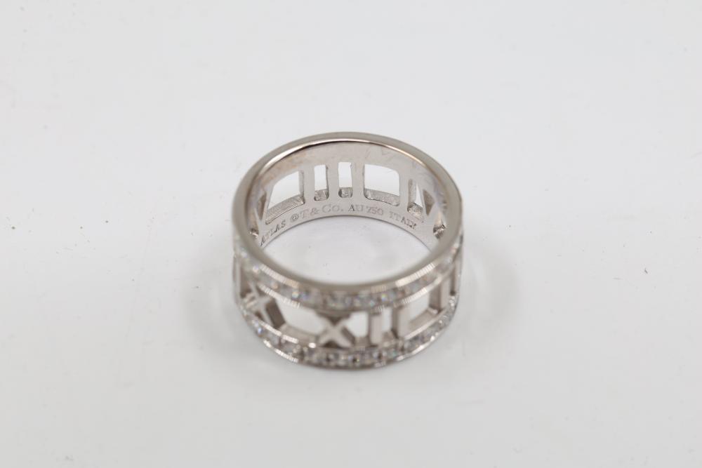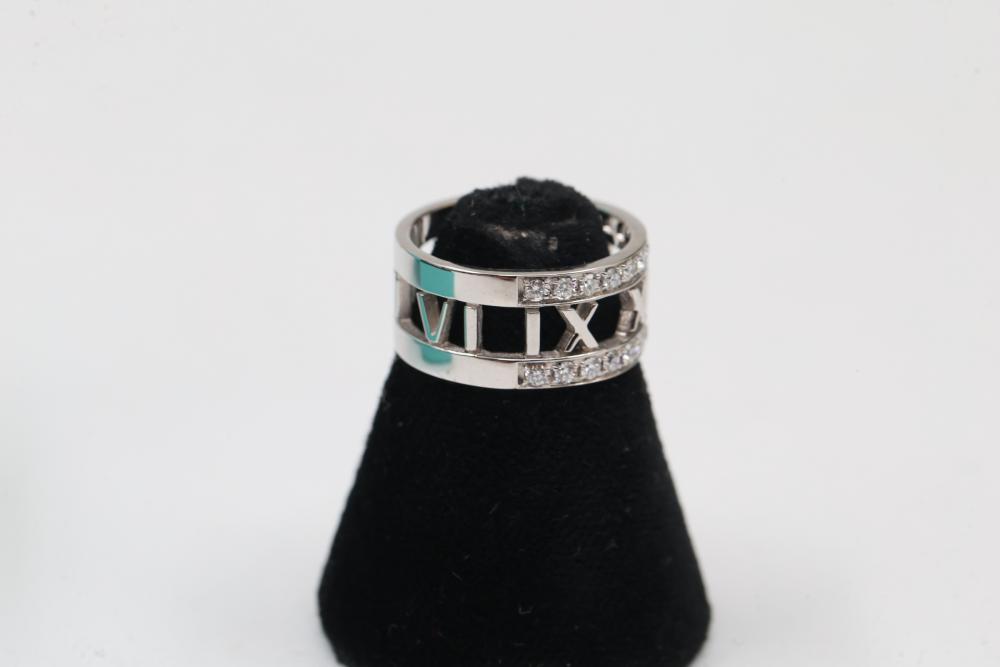 New Tiffany & Co. Atlas Roman Numerals Ring in 18K White Gold with Diamonds. Features an openwork design of Roman numerals highlighted with diamond accents. Hallmarked with the brand name and metal purity. Comes with a Tiffany & Co. turquoise case. Size 5. Total weight being 5.4 grams. Retail value of $5,000.
