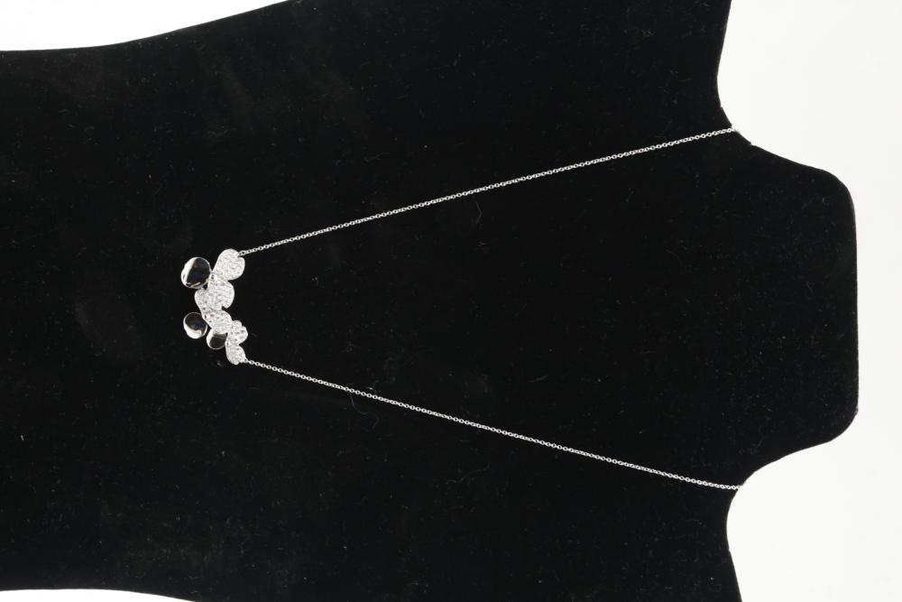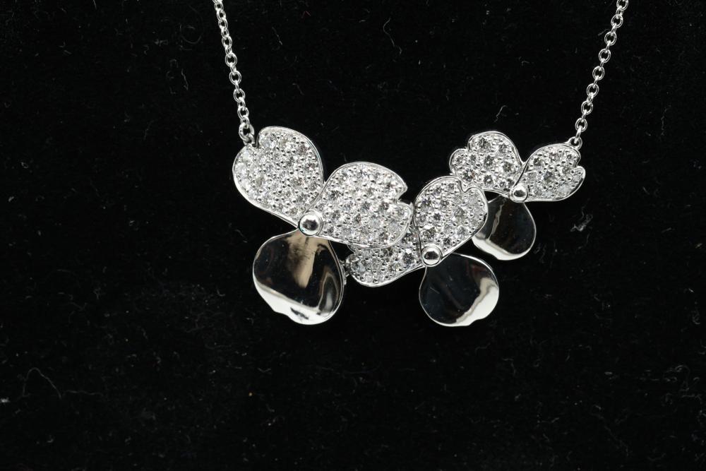 New Tiffany & Co. Platinum Necklace With Diamond Floral Pendant from "Paper Flowers" Collection. Crafted from PT950 platinum with a delicate chain and showcasing a floral motif encrusted with diamonds. The necklace includes original Tiffany & Co. packaging. Total weight being 9 grams total. Retail value of $7,000.