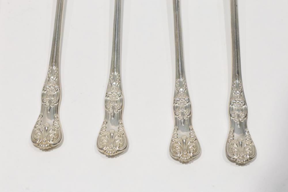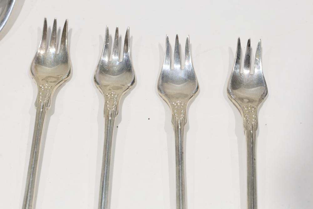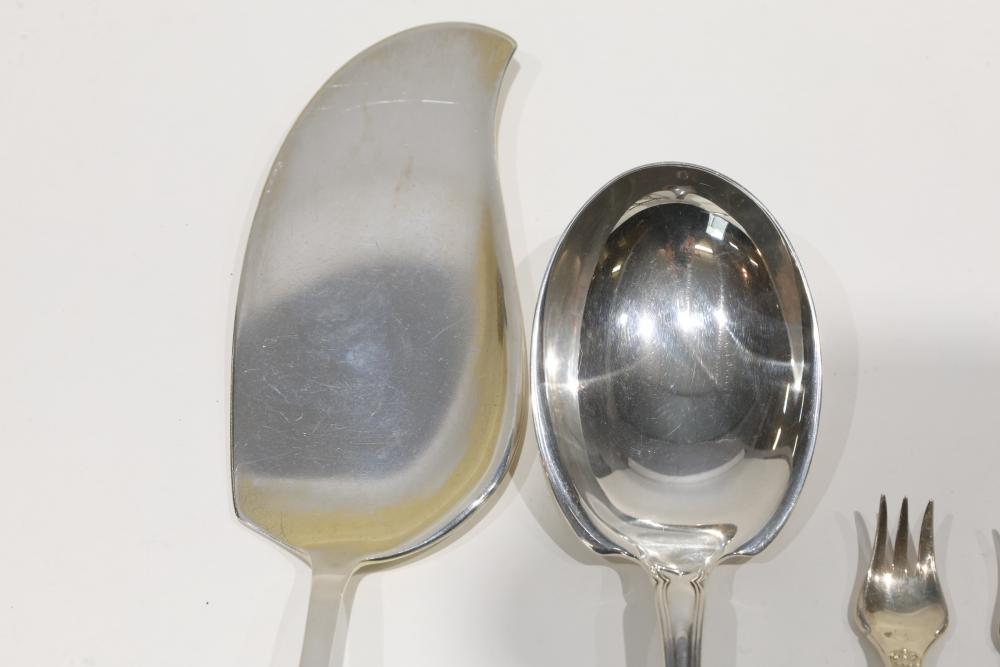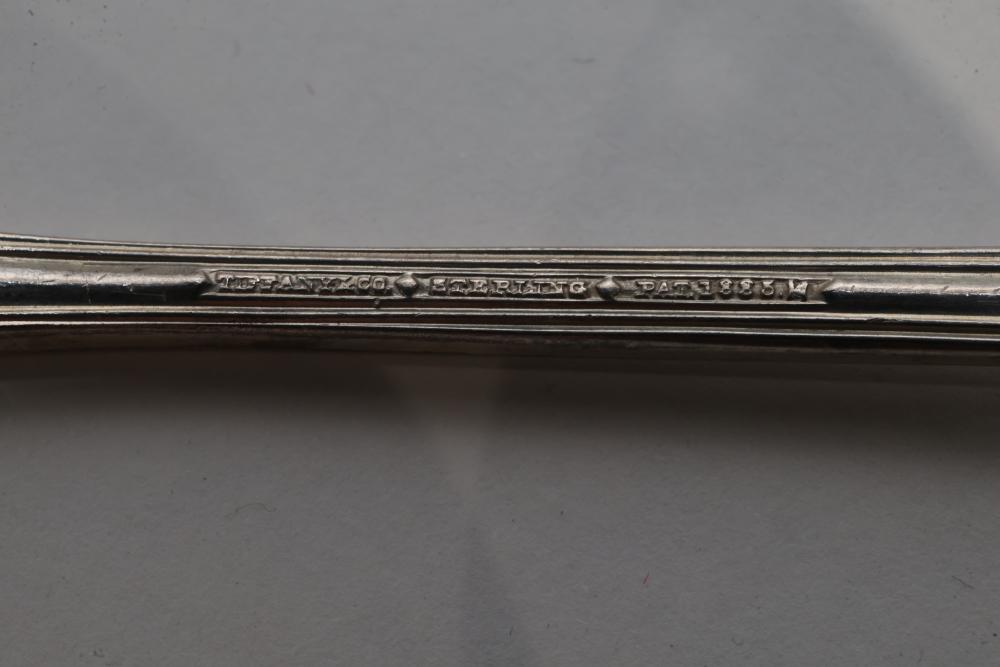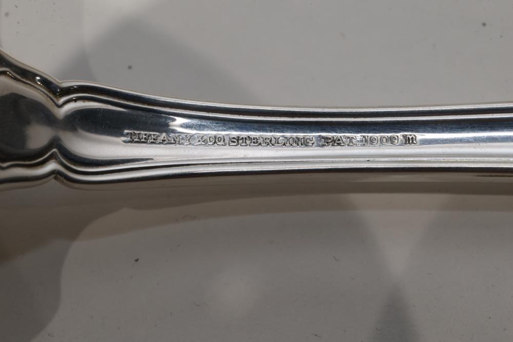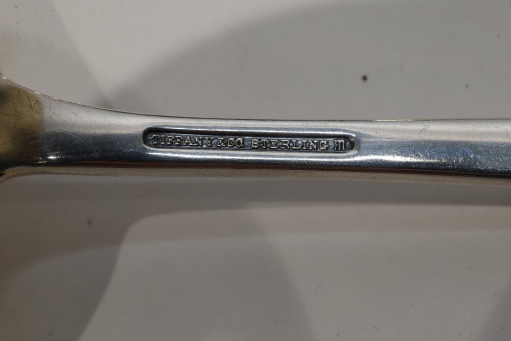 Sterling Silver Serving Pieces and Dessert Forks by Tiffany & Co. includes a sterling silver pie server, large serving spoon with engraved floral details, and four smaller dessert forks featuring ornate patterns. Each piece is marked 'Tiffany & Co. Sterling.' Total weight being 389 grams.