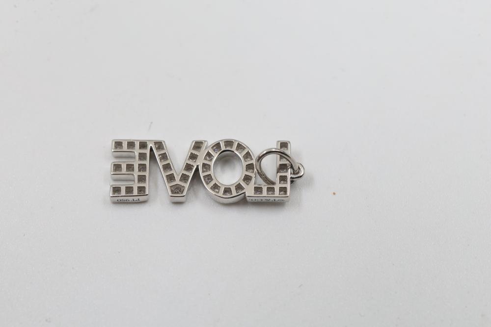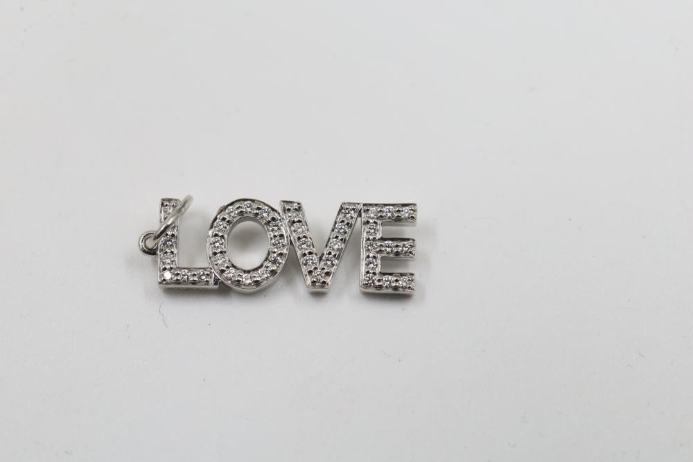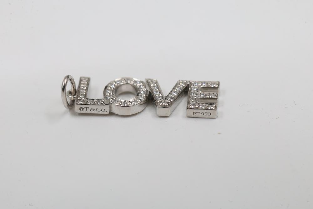 Tiffany & Co. Platinum Diamond Pave "LOVE" Letters Charm Pendant. Features pave-set diamonds encrusting the letters spelling "LOVE" crafted in platinum. Stamped with Tiffany & Co. hallmark. Total weight being 1.5 grams. Retail value of $2,500.