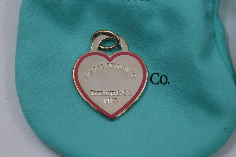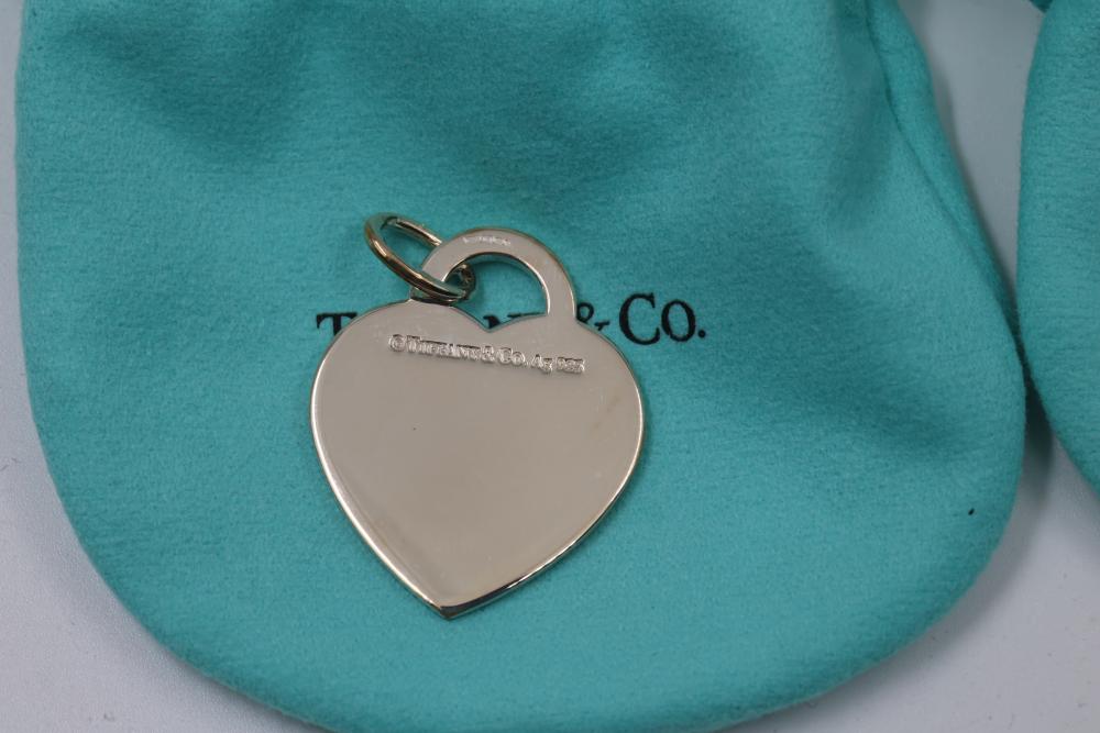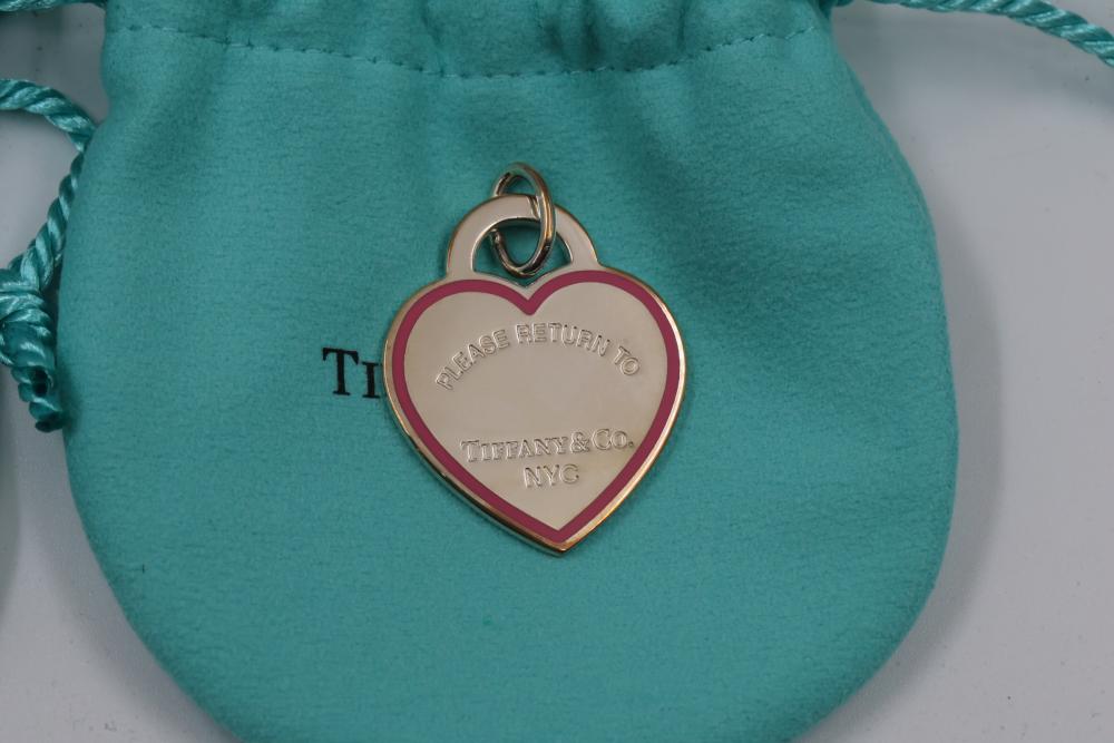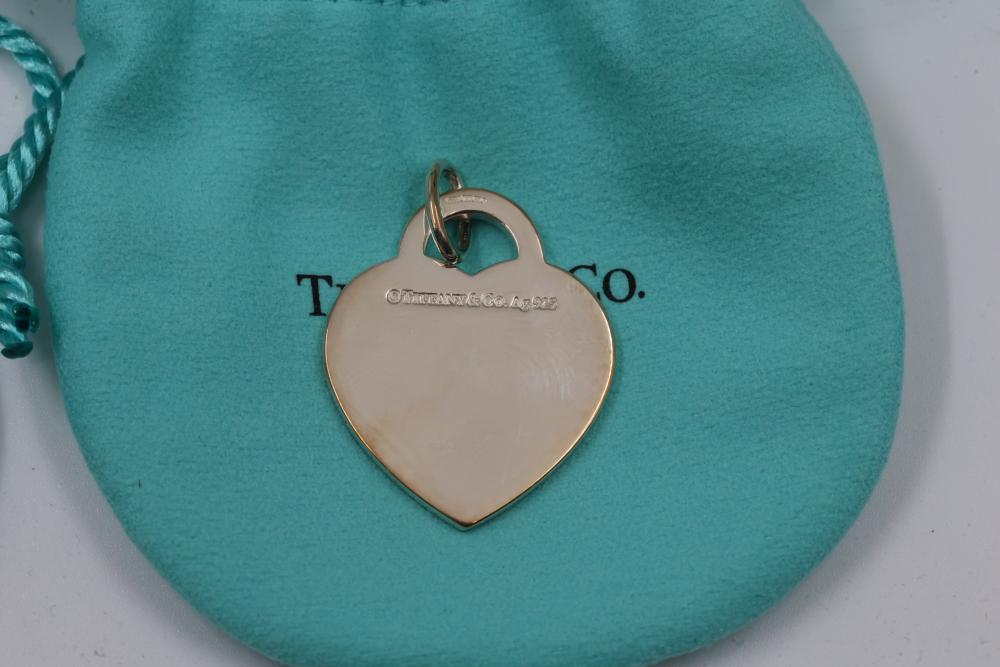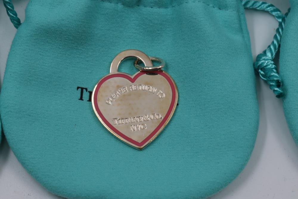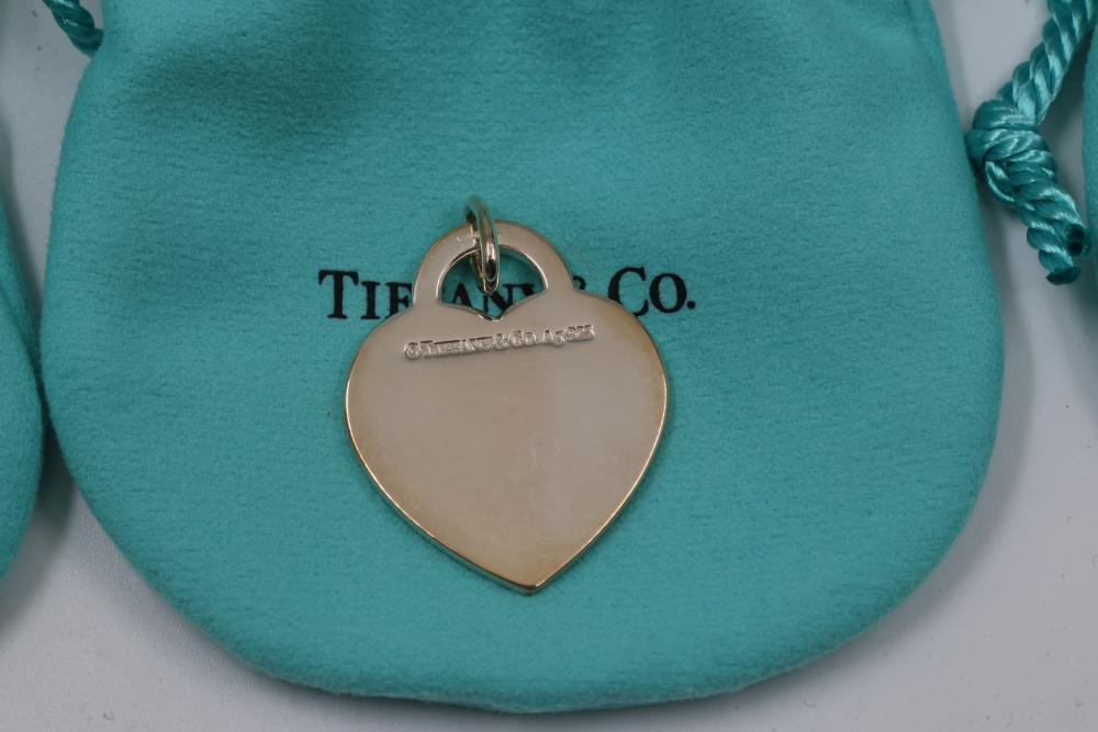 Three New Tiffany & Co. Sterling Silver Heart Tag Charms with Pouches and Boxes. Includes three heart-shaped sterling silver charms engraved with "Please Return to Tiffany & Co. NYC" on the front and "Tiffany & Co. 925" on the back. Each charm comes with a signature blue Tiffany & Co. pouch and box. Total weight being 24.7 grams. Total retail value of $375.