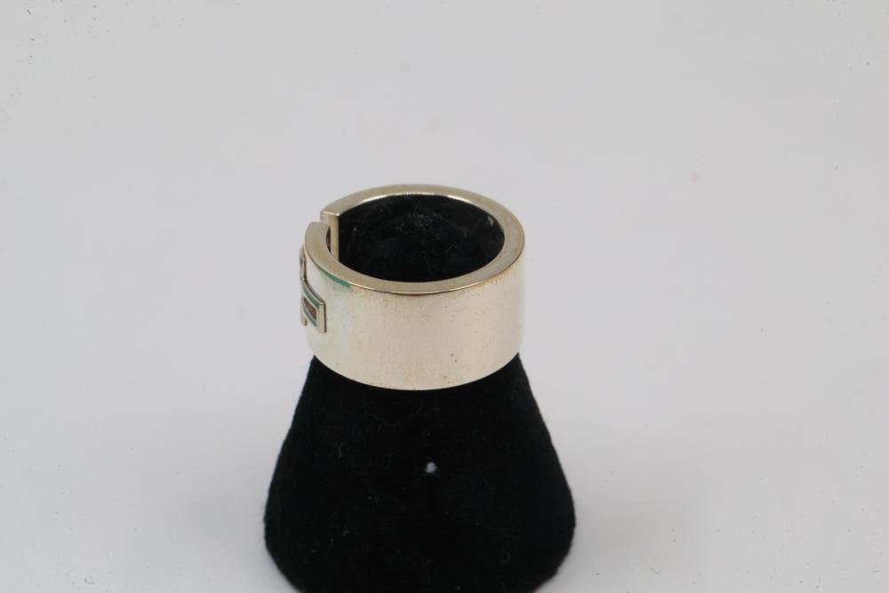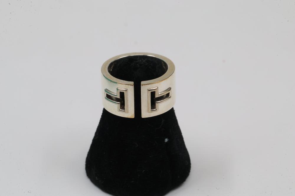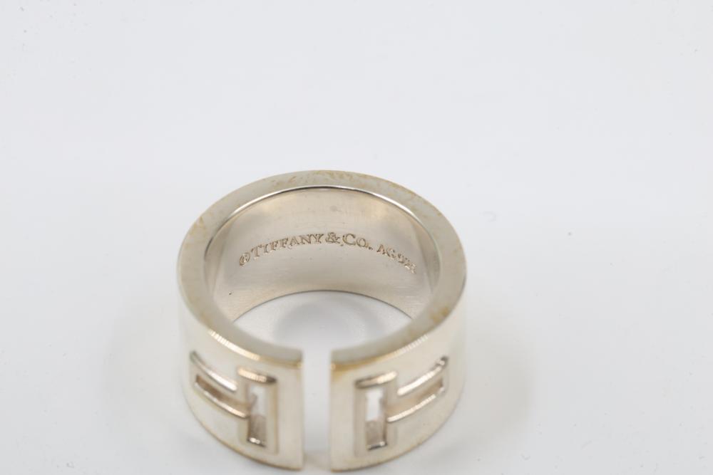 New Tiffany & Co. Sterling Silver T-Design Ring with Pouch. Crafted from .925 sterling silver, this wide band ring features an open T motif. Includes the original Tiffany & Co. drawstring pouch for safekeeping. Size 5. Total weight being 11.1 grams. Retail value of $225.
