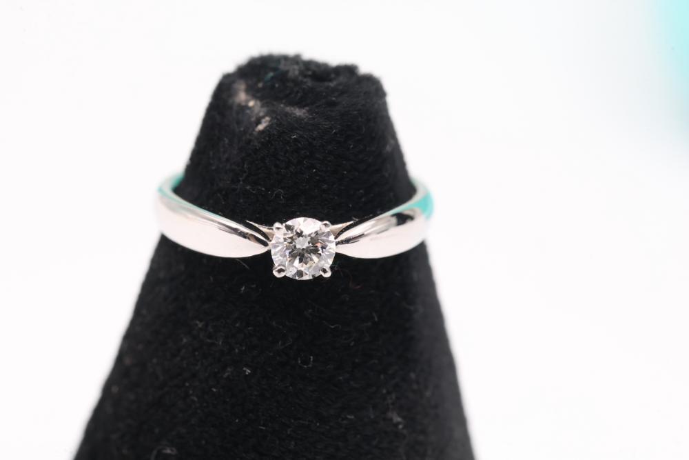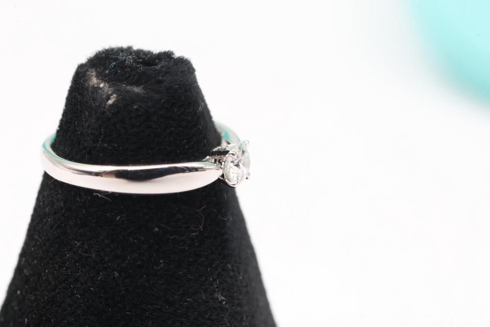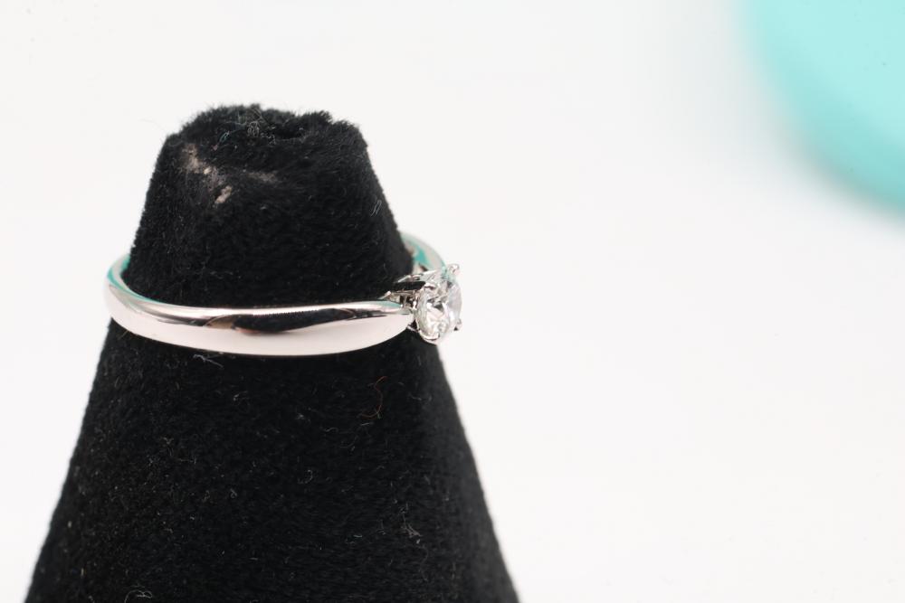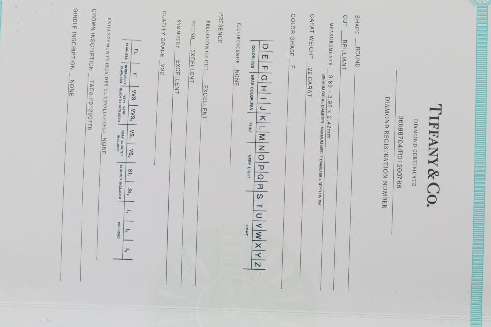 Tiffany & Co. Platinum "Harmony" Engagement Ring with Diamond and Certification. Features a platinum band marked PT950, set with a round brilliant diamond weighing 0.22 carats, color grade F, clarity grade VS2, and graded with excellent symmetry and polish. Includes original Tiffany & Co. pouch and diamond certification document. Size 3.75, total weight being 3 grams.