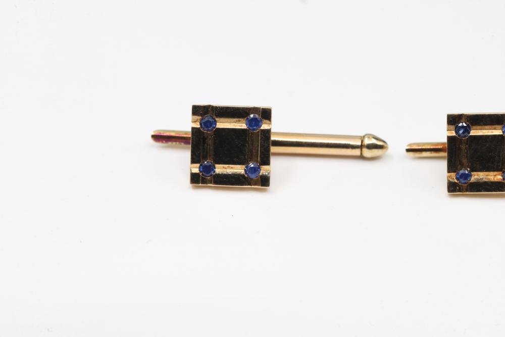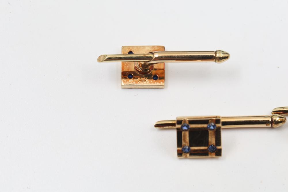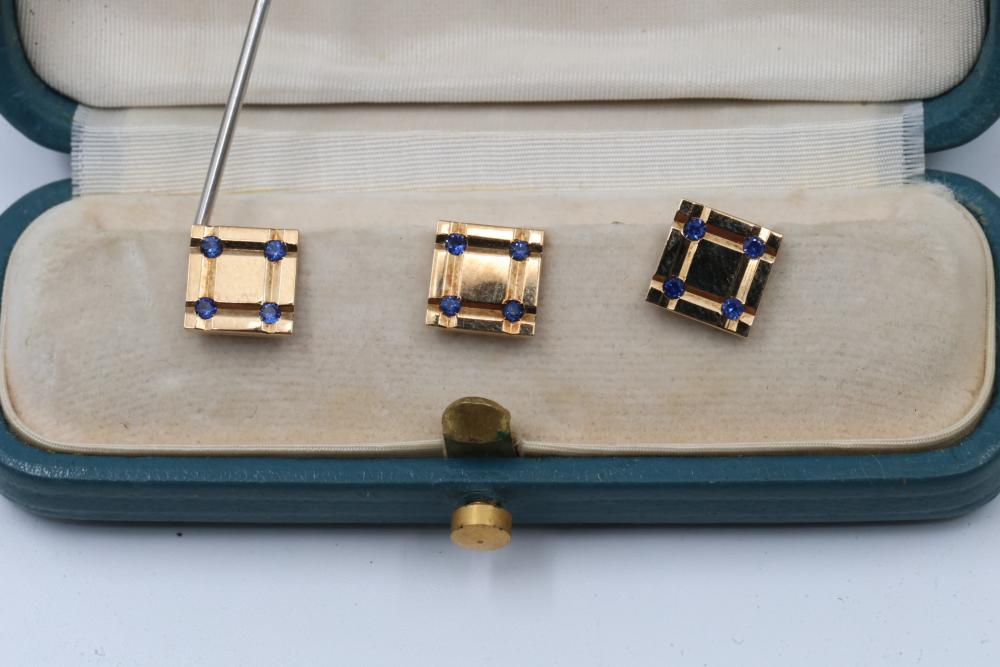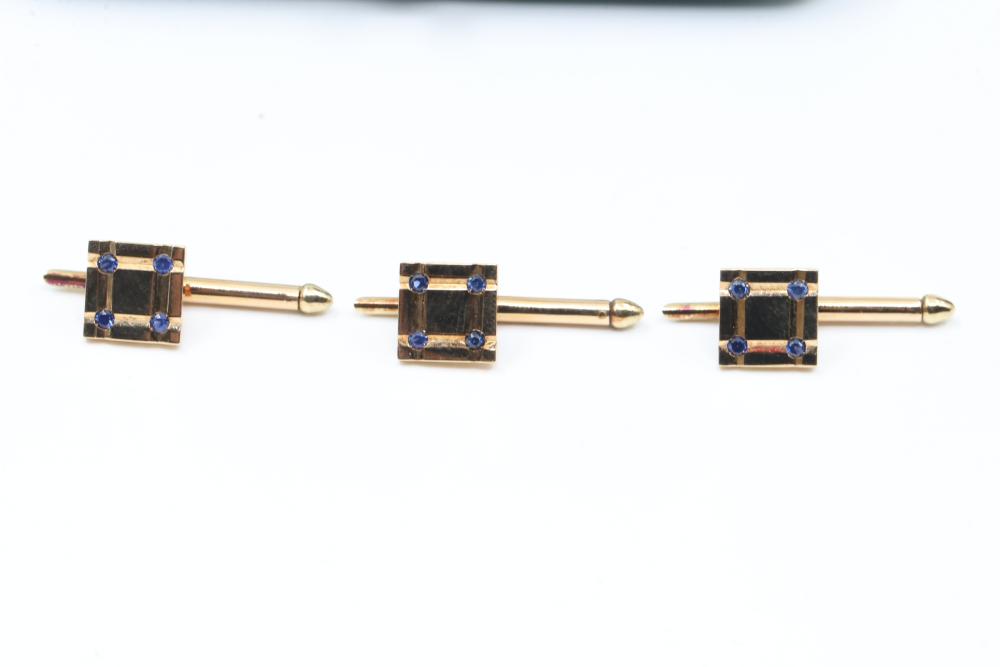 Vintage Tiffany & Co. Shirt Studs 14k Gold with Sapphires. This set includes three gold shirt studs adorned with blue sapphire gemstones. Each stud is crafted in 14k gold and features signature detailing by Tiffany & Co. Comes with the original Tiffany & Co. presentation box. Total weight being 6.5 grams.