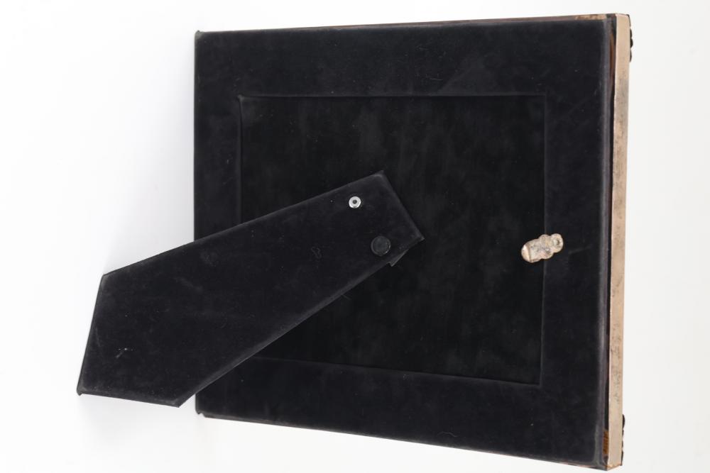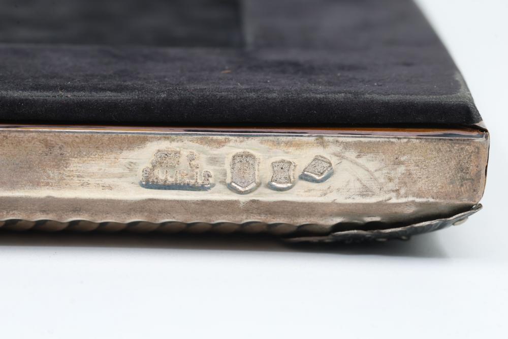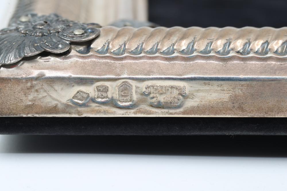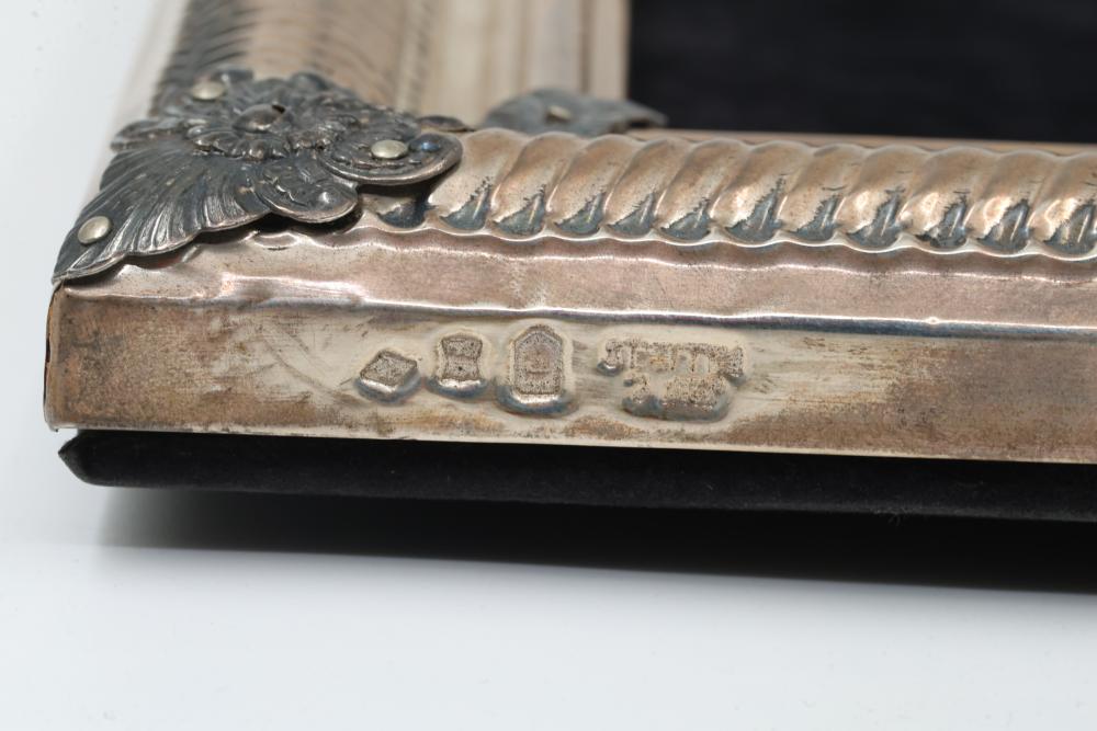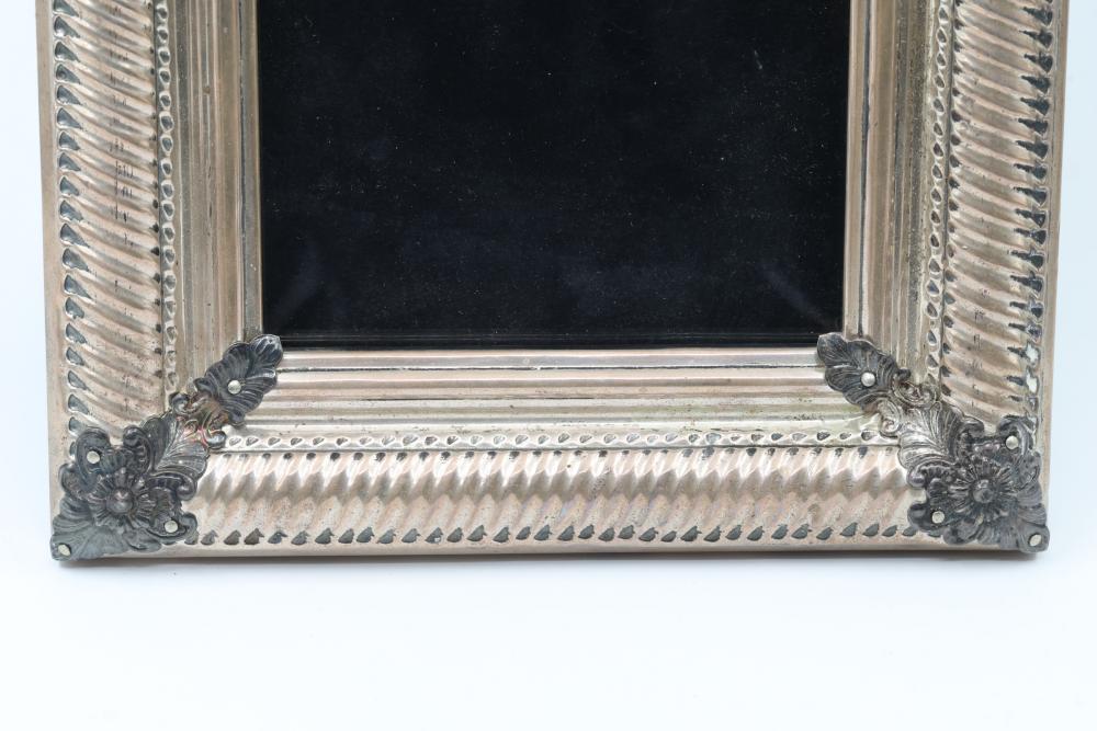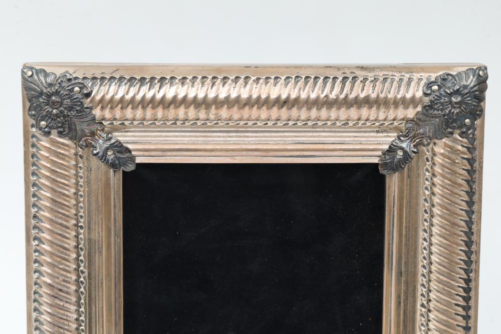 Silver hallmarked picture frame believed to be by "Juan C. Pallarolls"� with floral corner details and a textured border design. The hallmarks are present and visible along the edge of the frame. Features a rectangular display area with a back support for upright positioning. Ideal for holding a photo or artwork. Total weight being 701 grams.