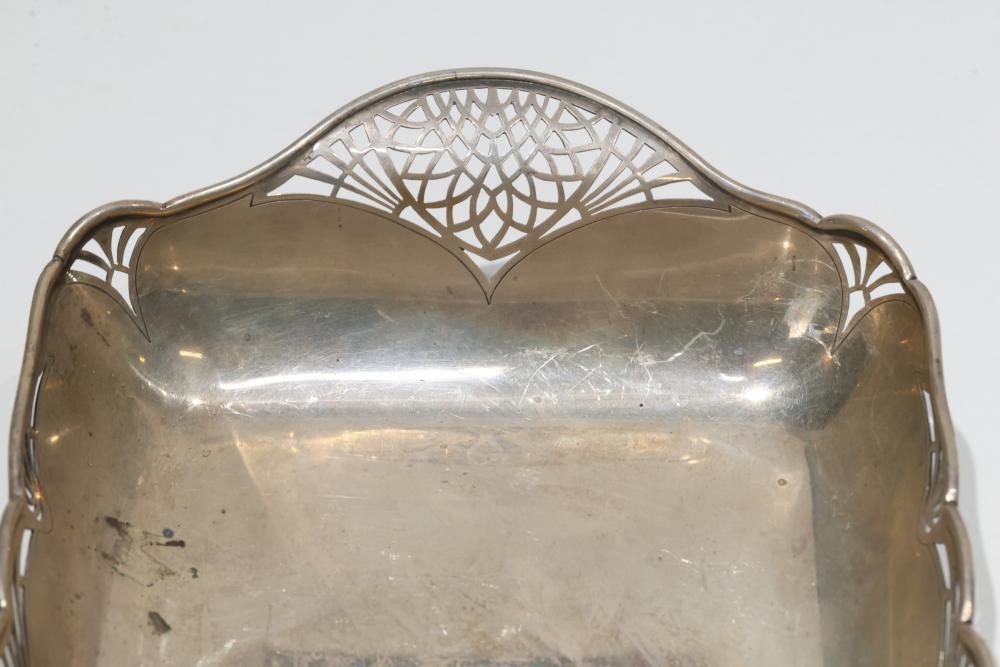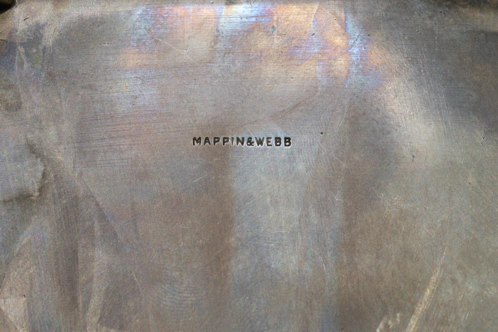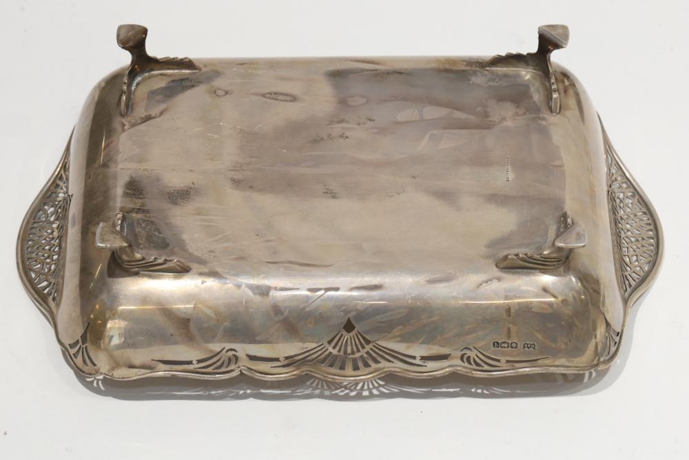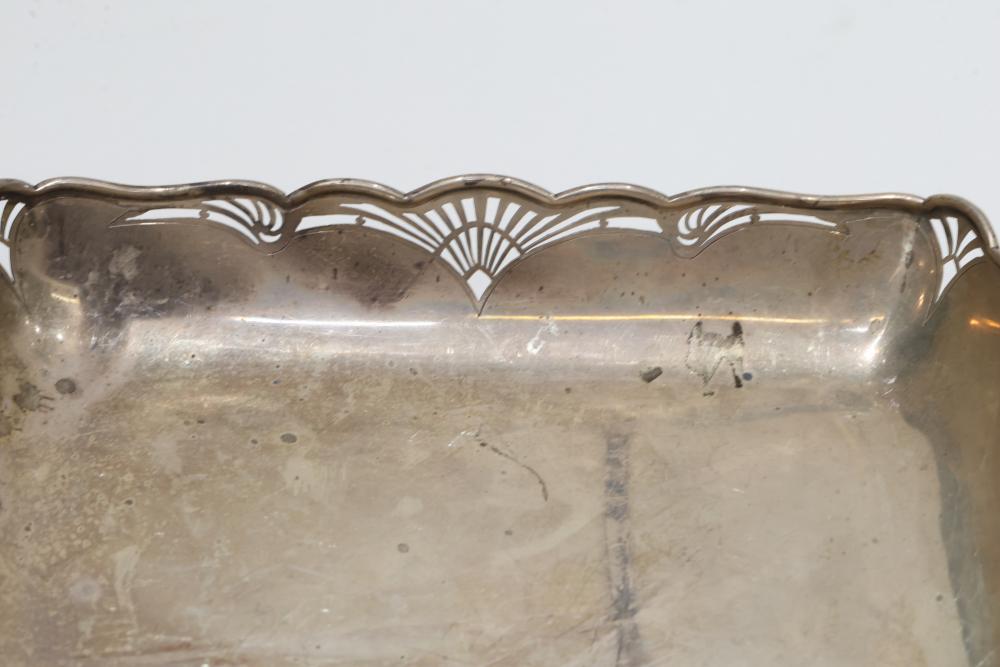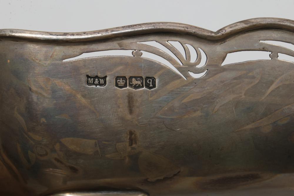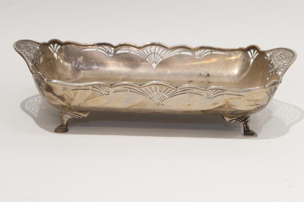 Mappin & Webb Sterling Silver Footed Dish with Pierced Rim. Features a scalloped rim with decorative pierced patterns and sits on four small feet. Visible tarnishing and surface scratches are present, with hallmark stamps indicating authenticity on the side and bottom. Sterling silver tested with JSP Testing solution. Total weight being 562 grams total.