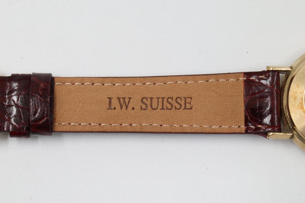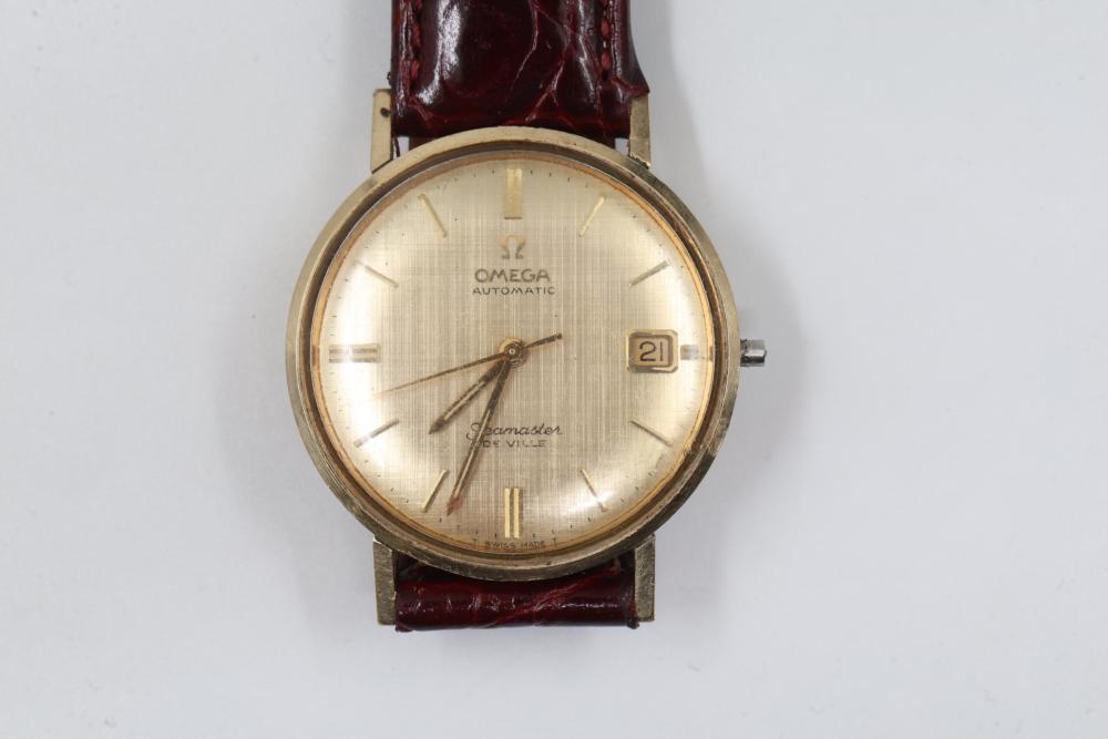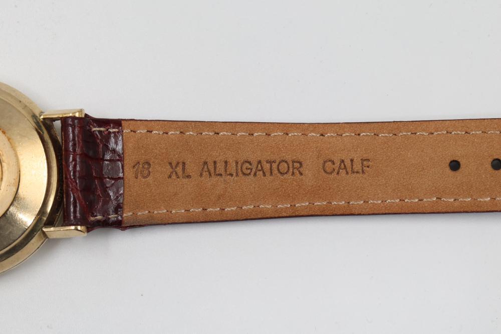 Omega Seamaster De Ville Automatic Wristwatch With Alligator Leather Strap. Features a round gold-tone case, date window at 3 o'clock, and an aftermarket red alligator leather strap marked 'XL Alligator Calf.' The back case displays the Seamaster logo.