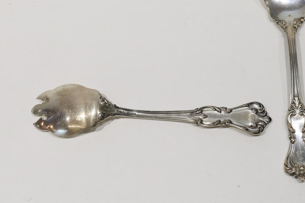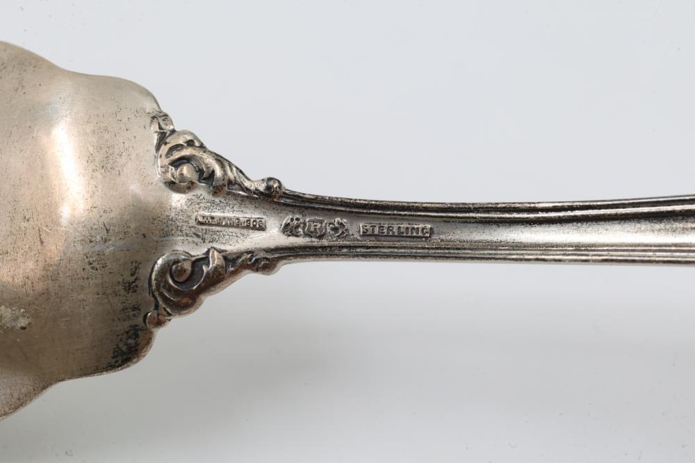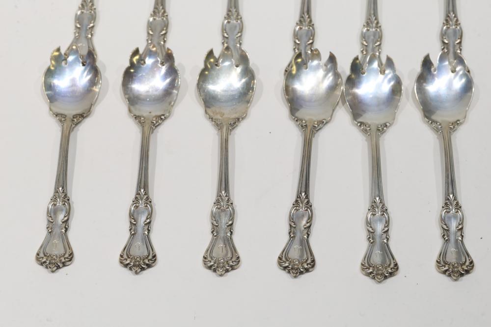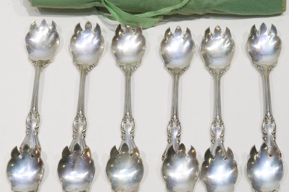 12 Sterling Silver Forks with Ornate Design. Each fork features an intricate engraved handle and a three-pronged design. The sterling silver hallmark and engraved detailing are visible and indicate high-quality craftsmanship. Total weight being 294 grams total.