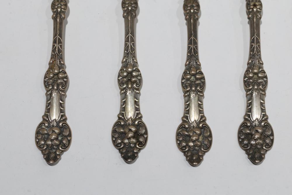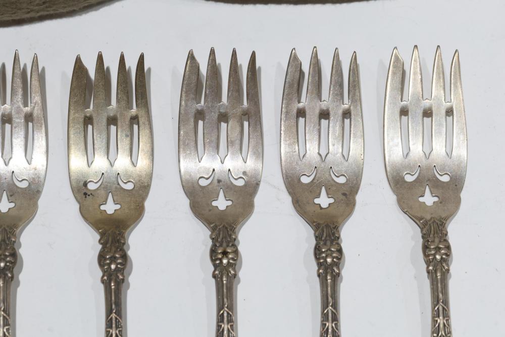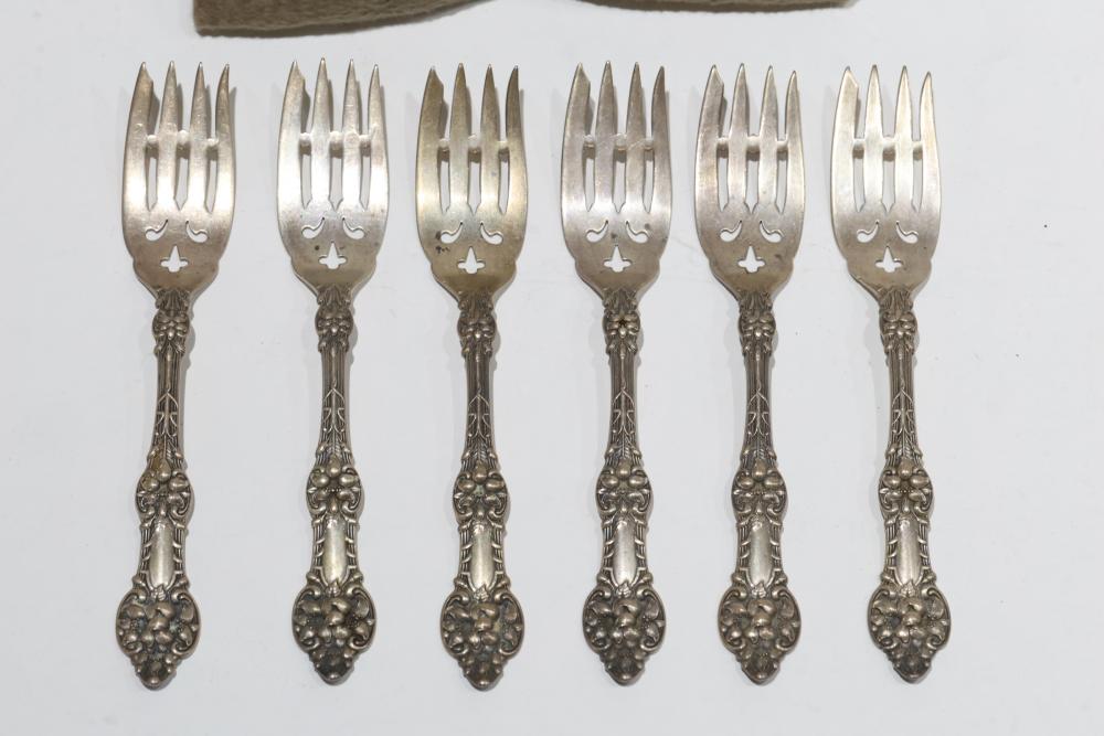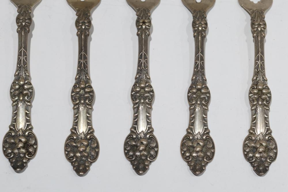 Six Wallace Sterling Silver Forks with Ornate Floral Design. Each fork features intricate floral motifs and cut-out patterns on the handle and the tine area. Stamped with the Wallace brand and 'Sterling.' These forks are ideal for formal dining settings or as a collectible. Total weight of 181 grams.