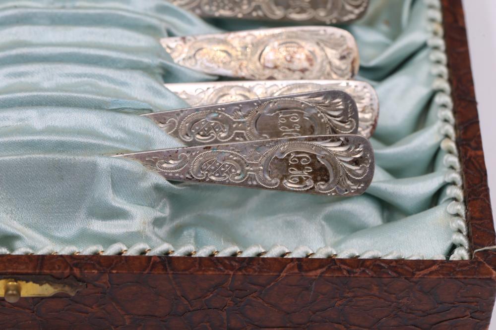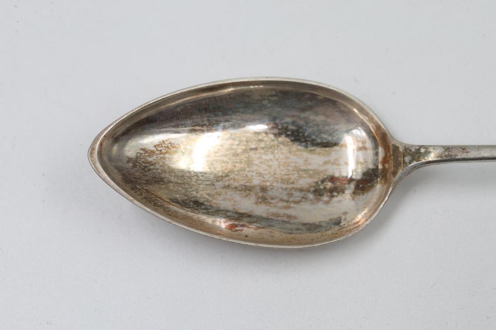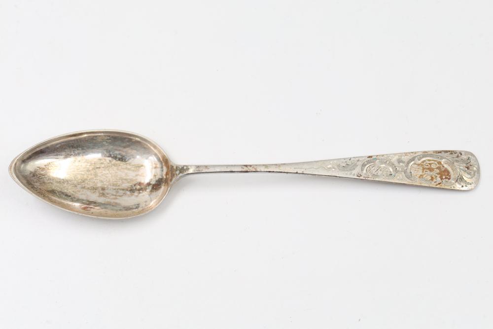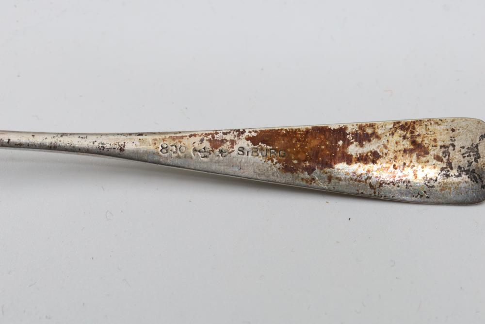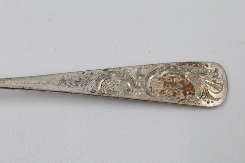Six Engraved 800 Silver Spoons in Fitted Case. Each spoon features detailed engraving and a monogram on the handle, marked 800 for silver purity. Comes in a fitted case with a silk-lined interior and clasp closure. Total weight being 53 grams.