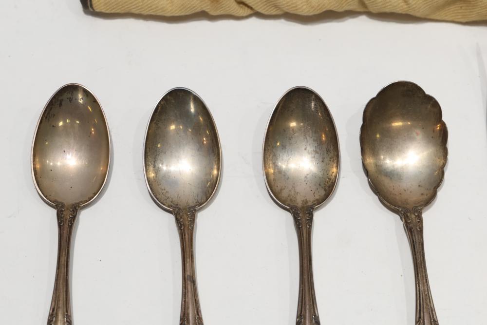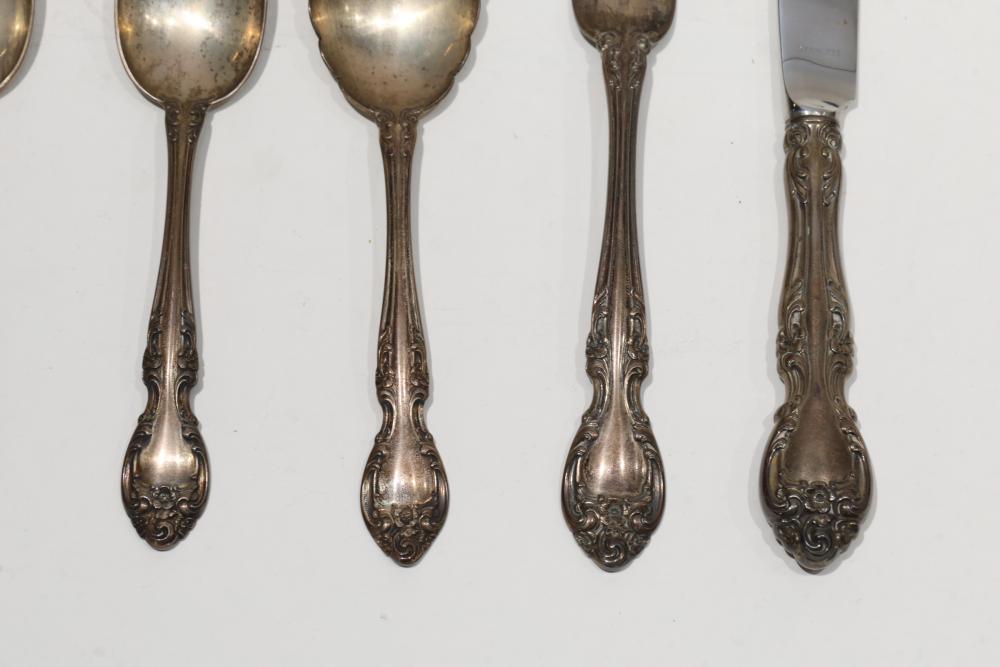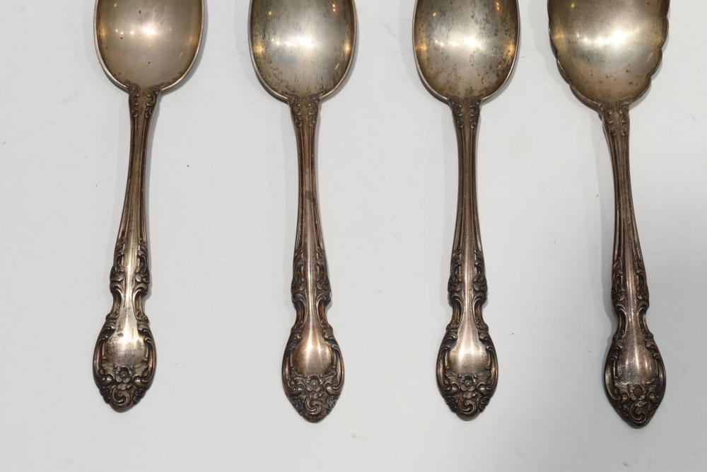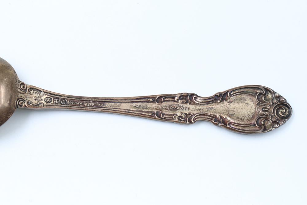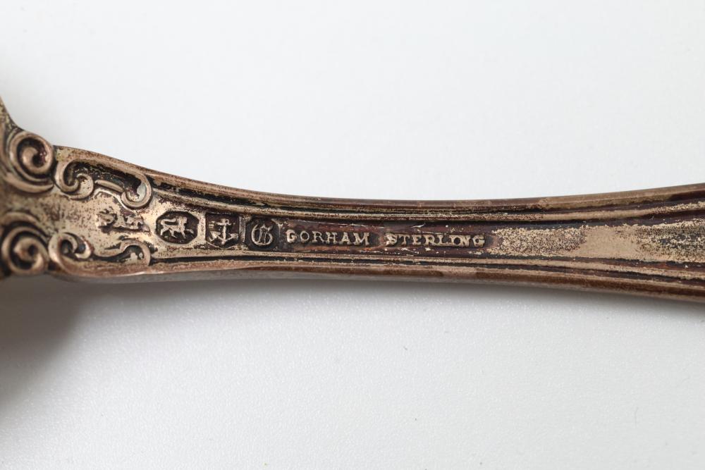 Sterling Silver Gorham Flatware with Ornate Design. Includes four spoons, one fork, and one knife, all featuring intricate detailing on the handles. Total weight of items being 274 grams.