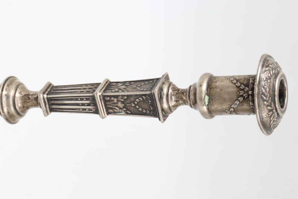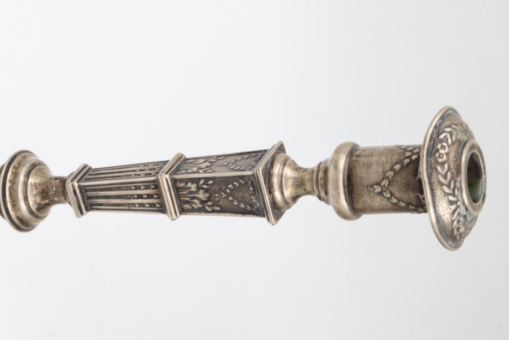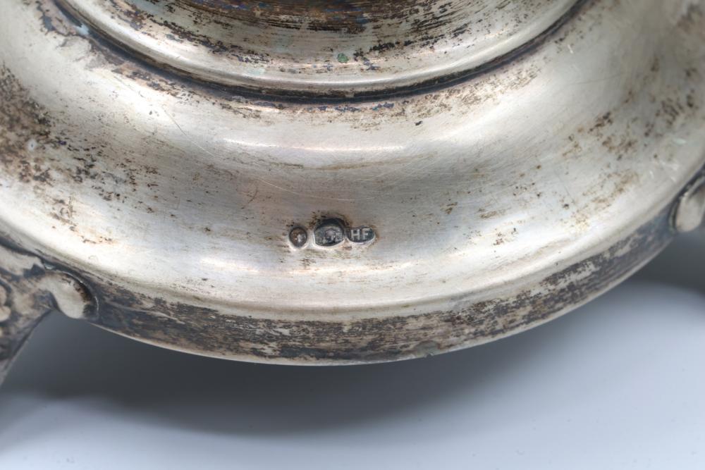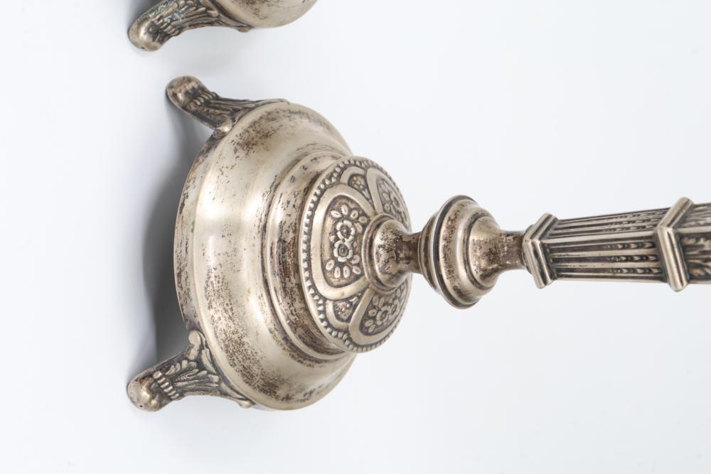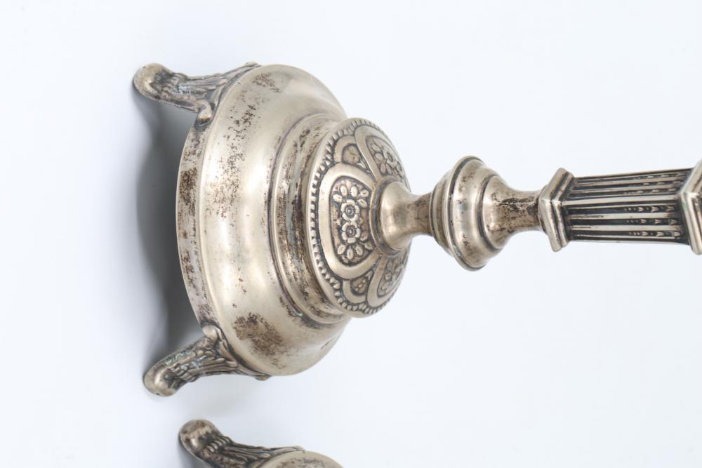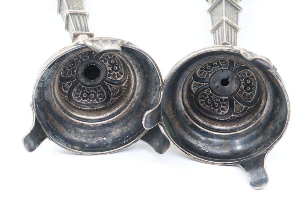 Decorative Sterling Silver Candlesticks with Ornate Detailing. The candlesticks feature intricate patterns on the base and column, with decorative accents throughout. Each piece is supported by three small feet. Markings on the base include 'HF' and additional symbols. Total weight being 533 grams.