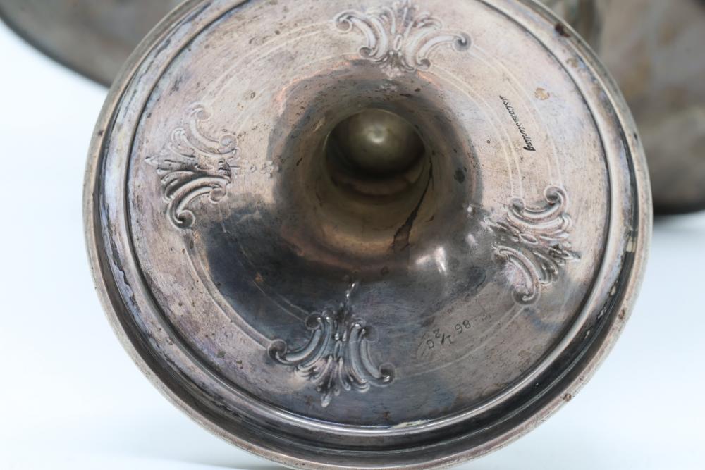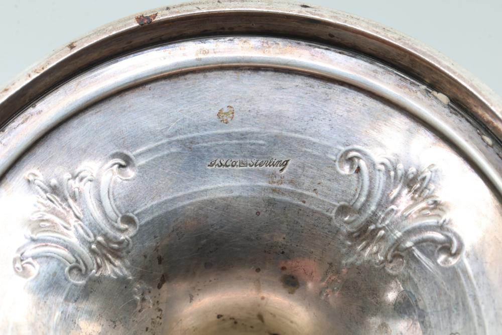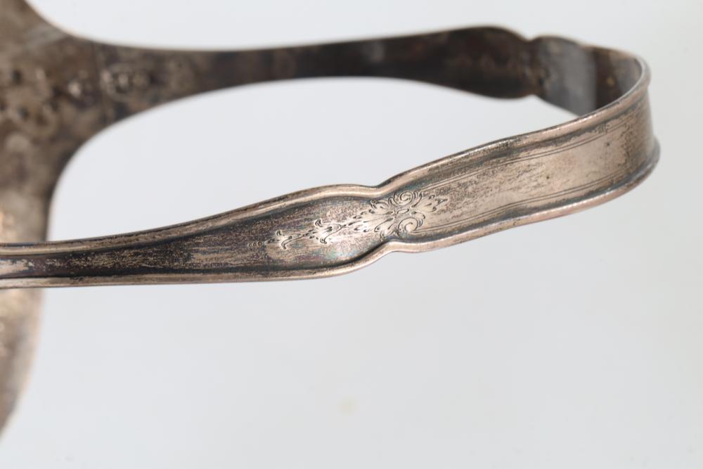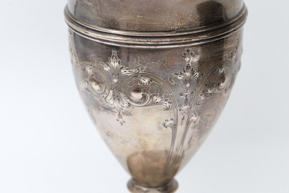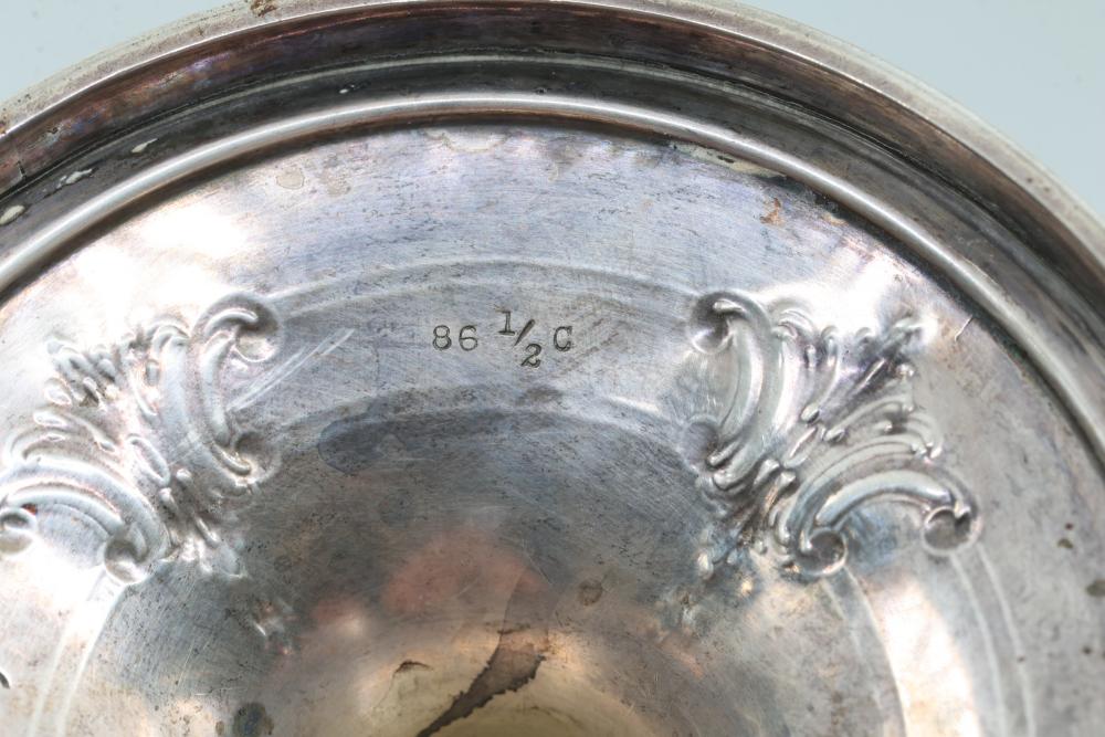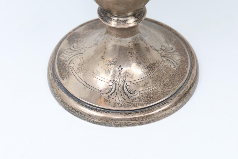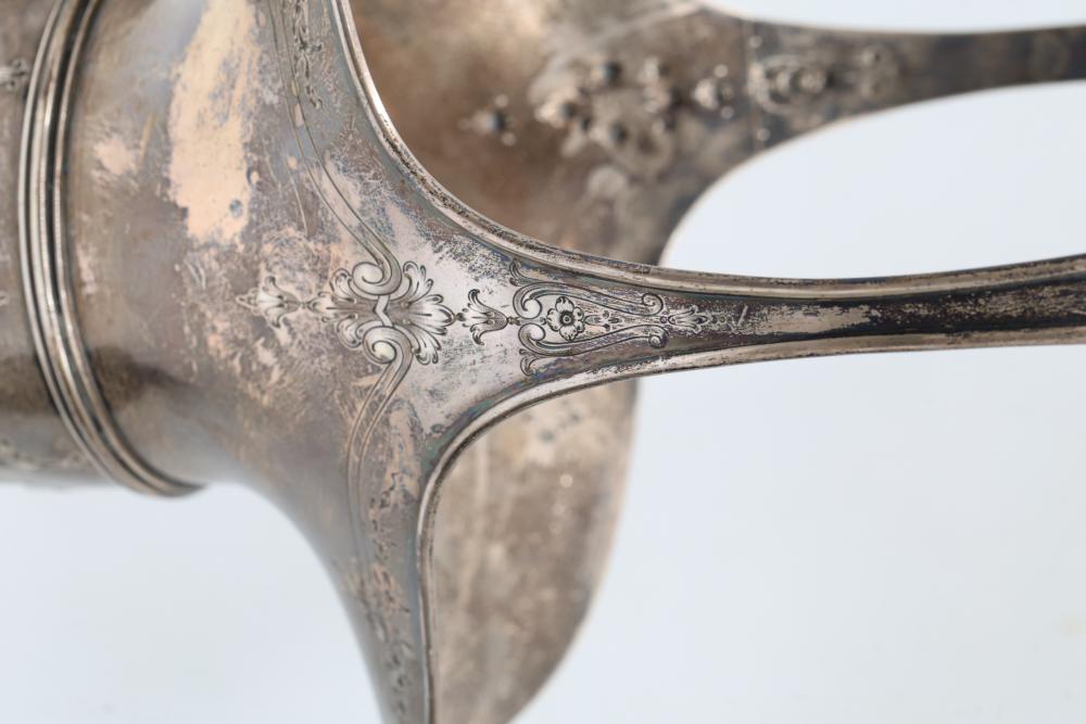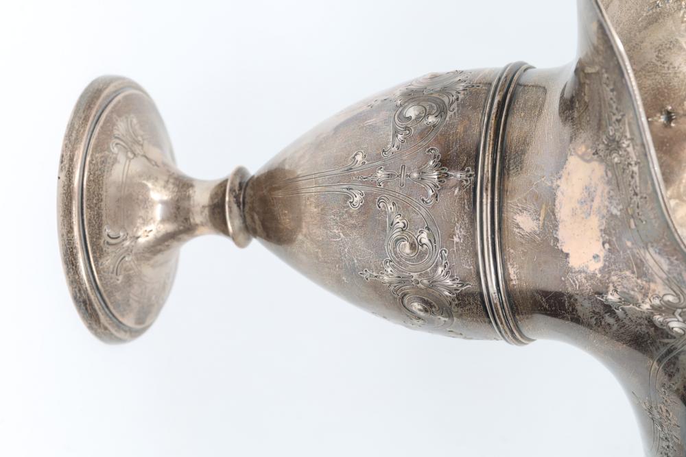 Sterling Silver ASCO Footed Ewer with Engraved Details. Features an ornate handle and engraved floral and scrollwork details. Marked "ASCO Sterling" beneath the base, along with additional embossed design elements. Total weight being 1,032 grams.
