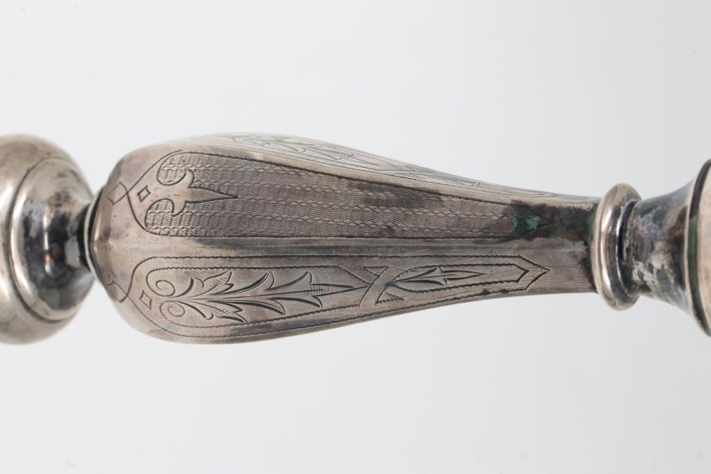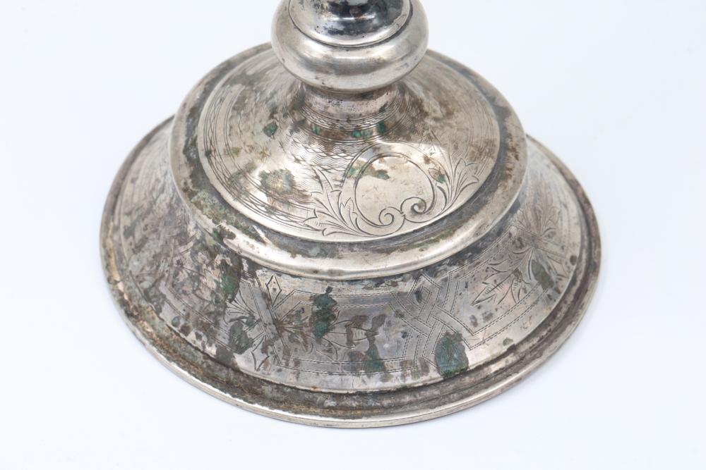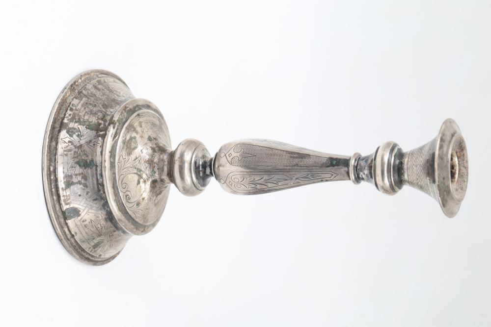 Sterling Silver decorative candlestick holder with an engraved surface design. Features intricate geometric and floral patterns throughout the body, including detailed engravings on the base. It includes small hallmarks on the lower section of the base. Total weight being 341 grams.
