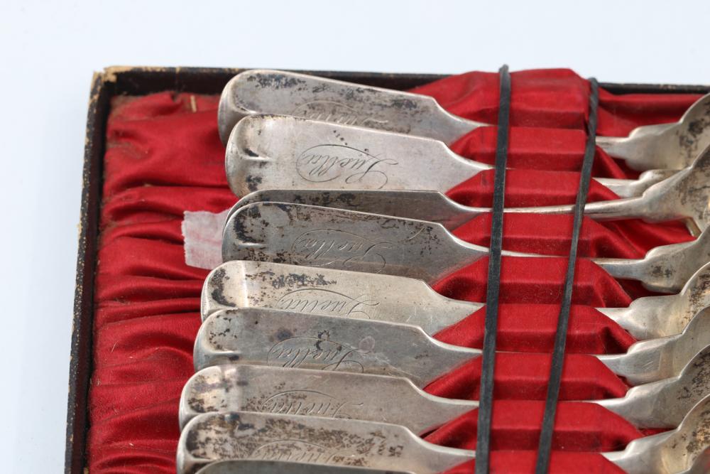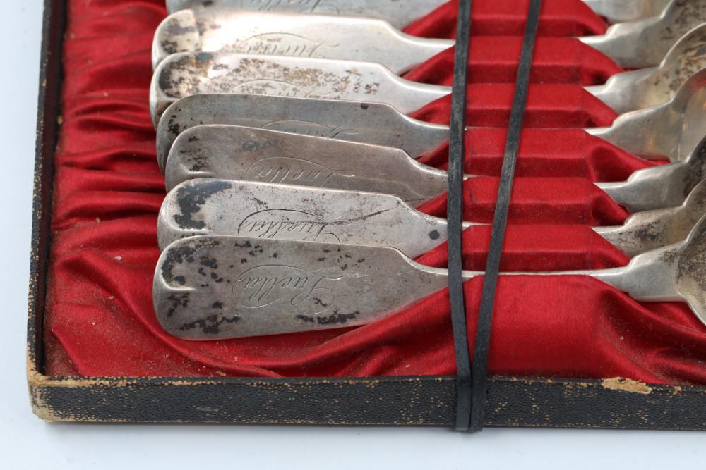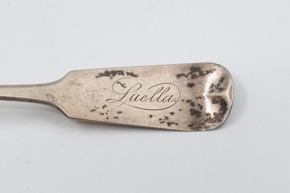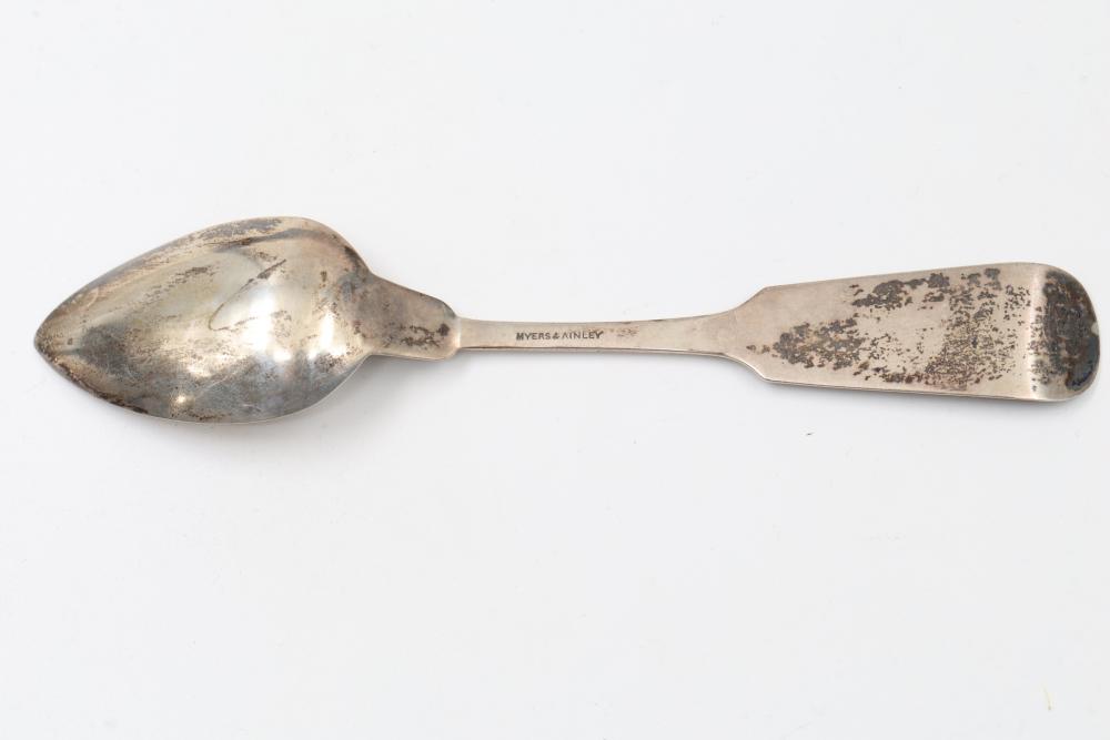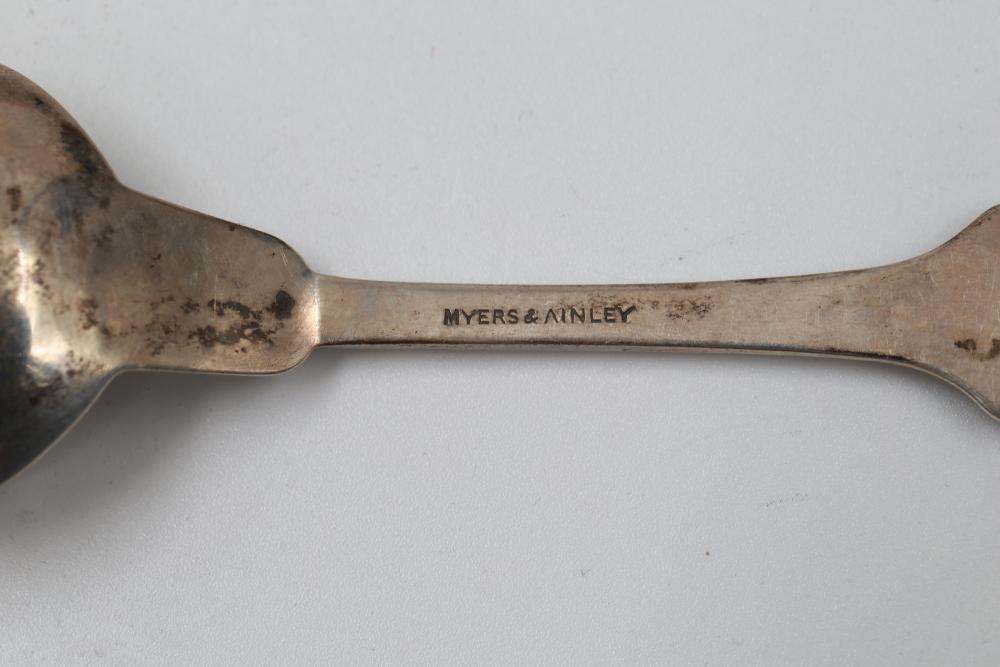 12 Myers & Ainley sterling silver spoons engraved with the name 'Luella' on the handle. Each spoon features the marking 'Myers & Ainley' and 'Sterling,' denoting their craftsmanship and material. Total weight being 173 grams.