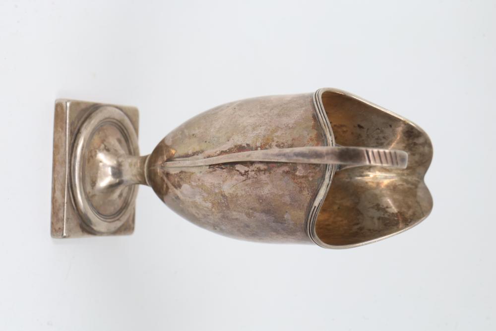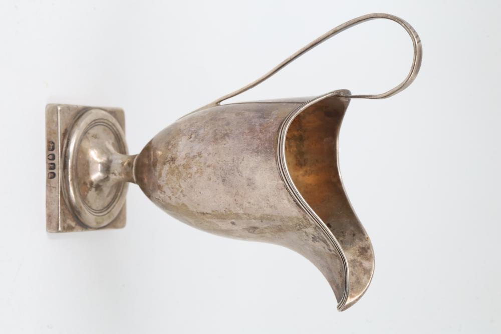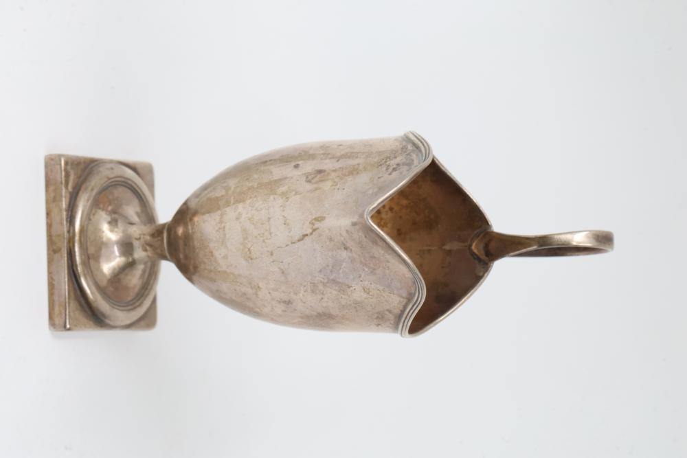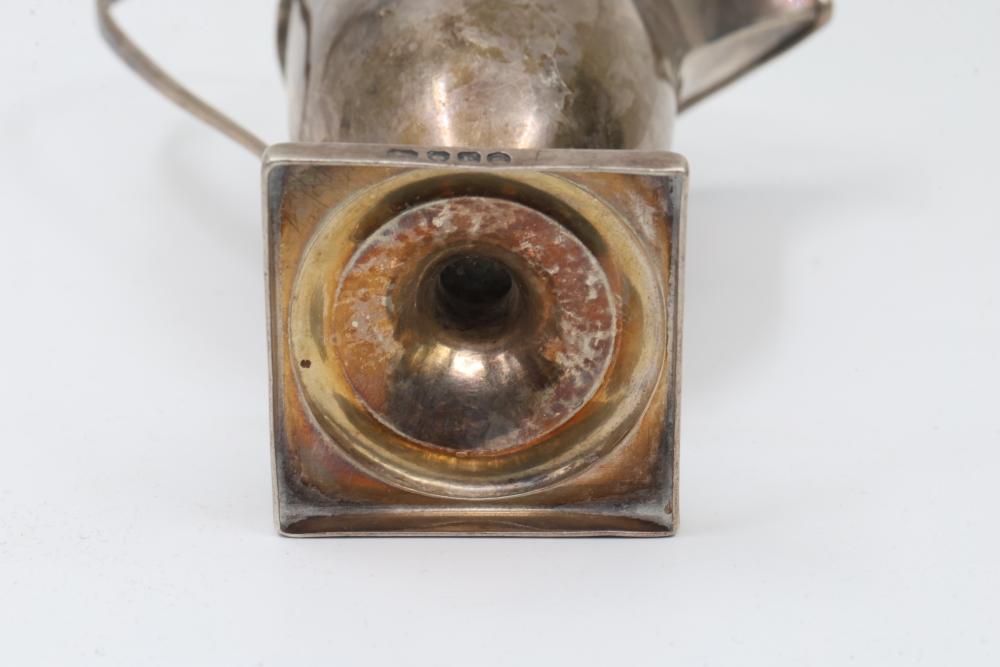 Sterling Silver Decorative Creamer on Square Base. Features a flared spout, looped handle, and hallmark on the base. The creamer has a pedestal design with a square base. Total weight being 145 grams.