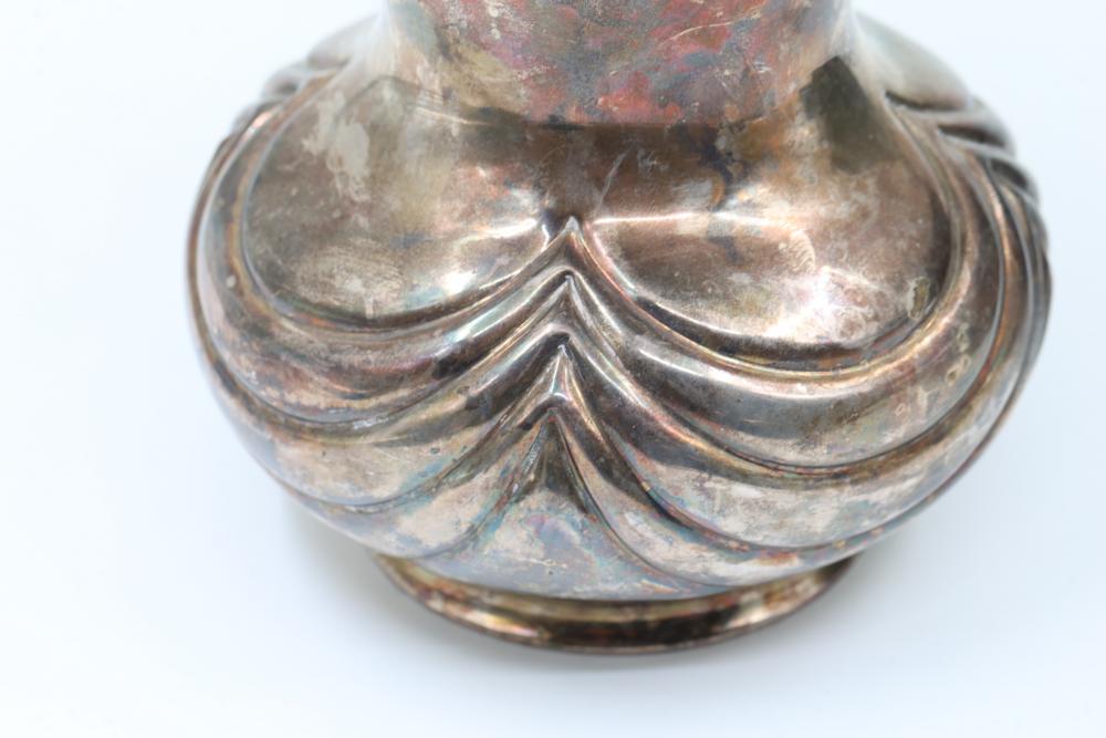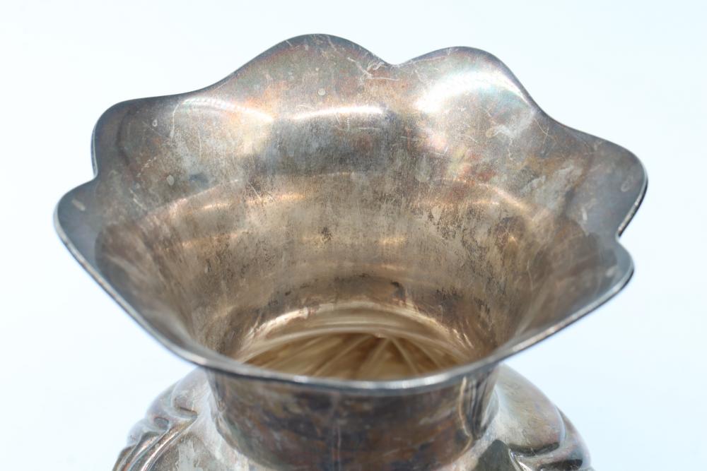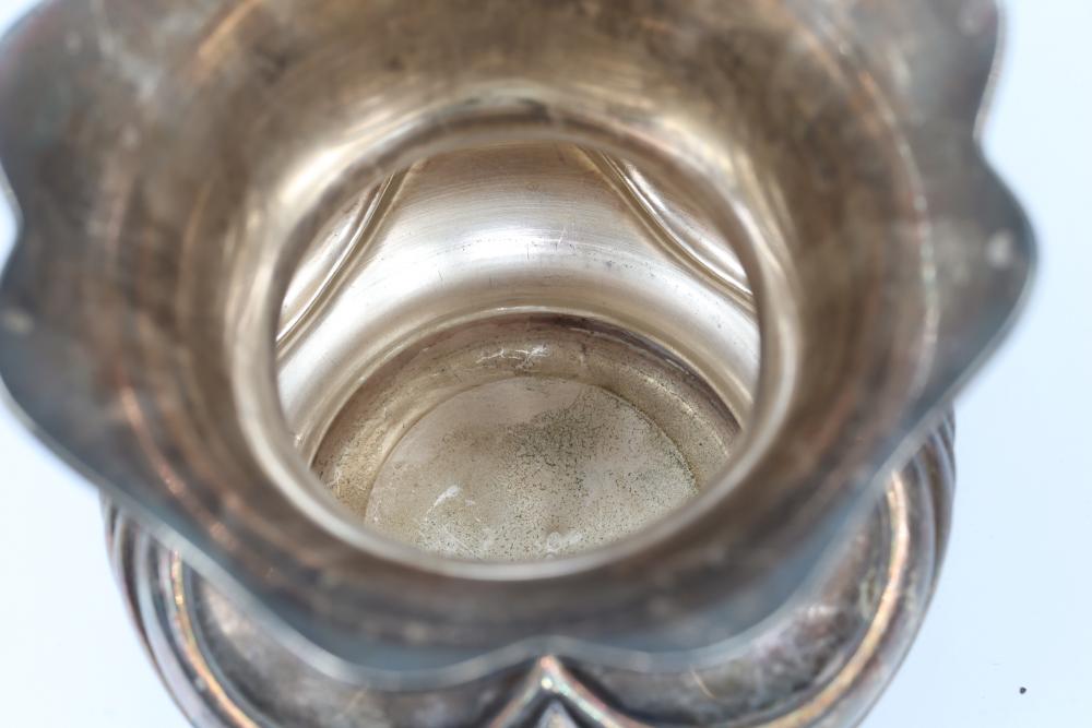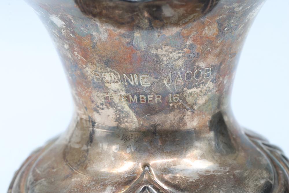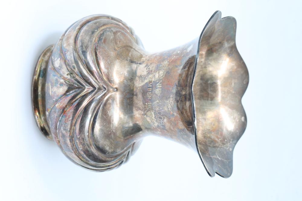 Engraved Sterling-Silver Vase with Scalloped Rim and Decorative Details. Features an engraved dedication reading 'Bonnie Jacob, September 16, 1997.' Includes hallmarking on the base. Designed with elegant scalloped edges and embossed patterns. Total weight being 476 grams.