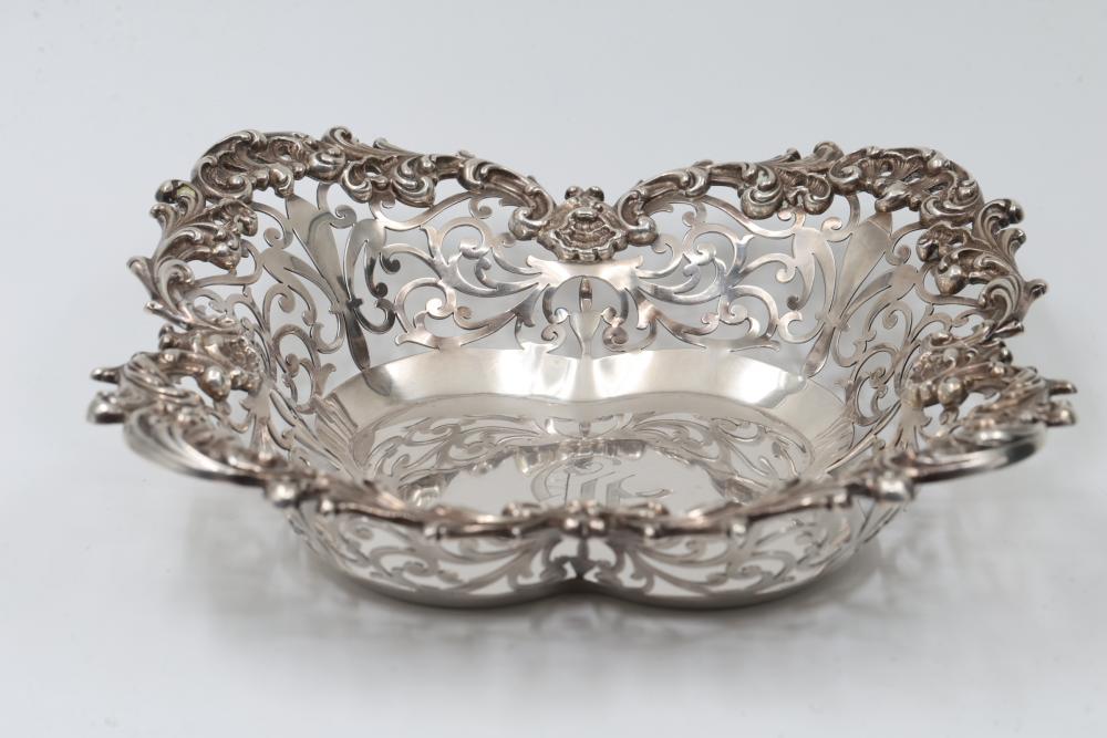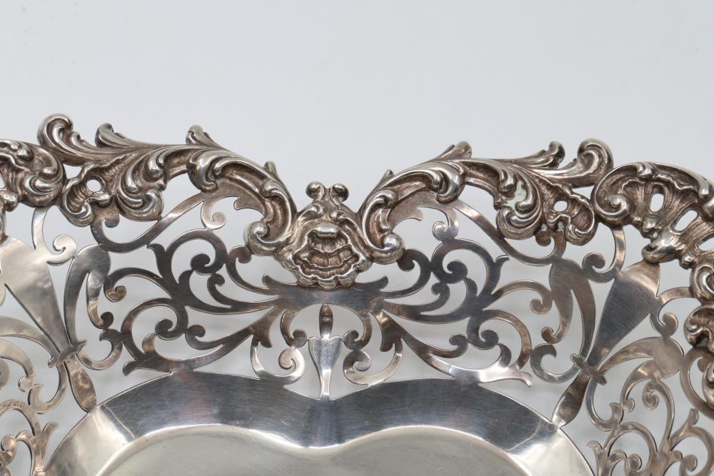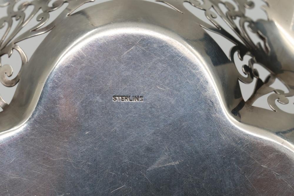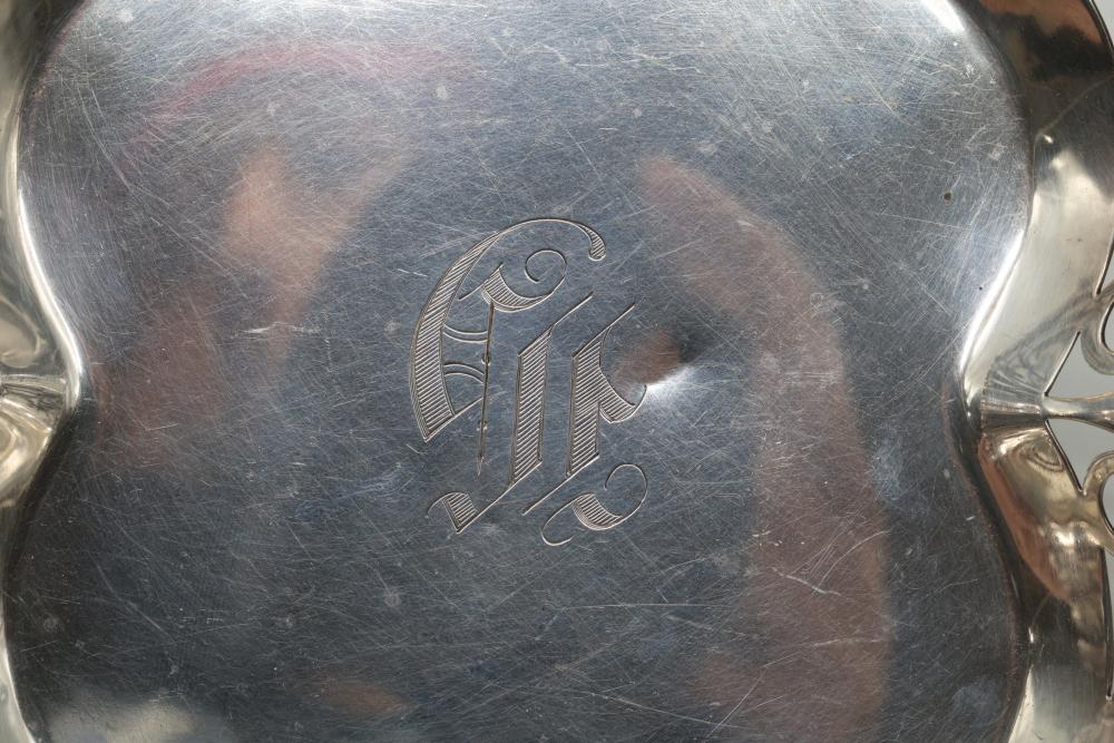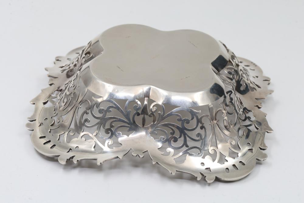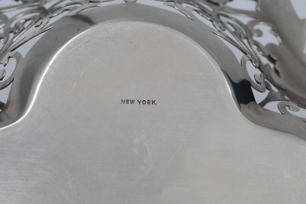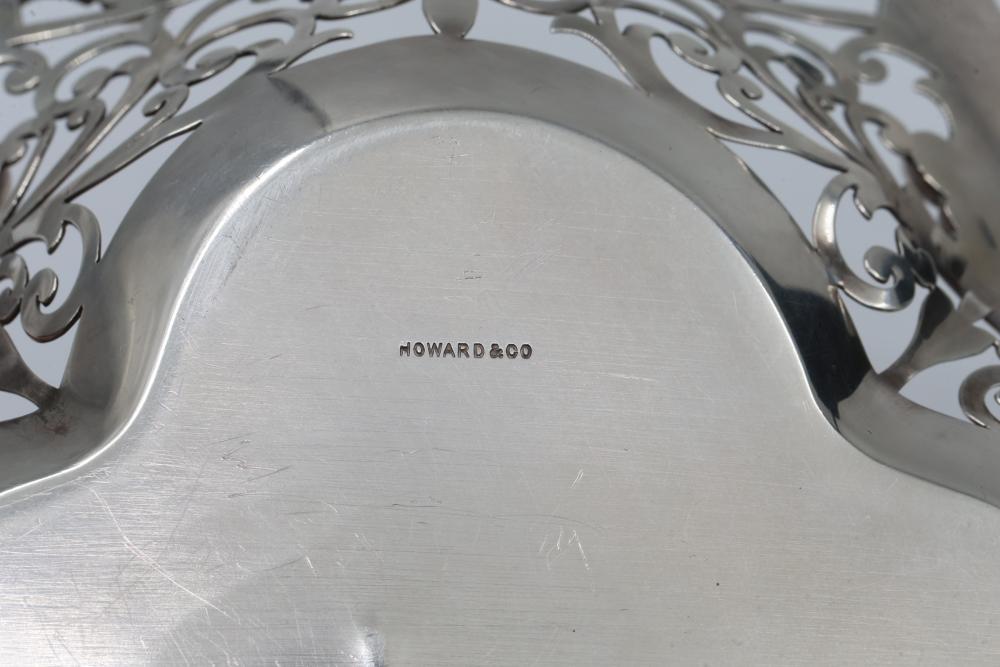 Howard & Co Sterling Silver Decorative Bowl with Engraving featuring intricate cutout patterns and ornate design details along the rim. The center has an engraved monogram. Markings on the base include 'Howard & Co,' 'Sterling,' 'New York,' and '1903.' Total weight being 465 grams.