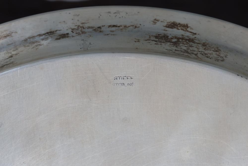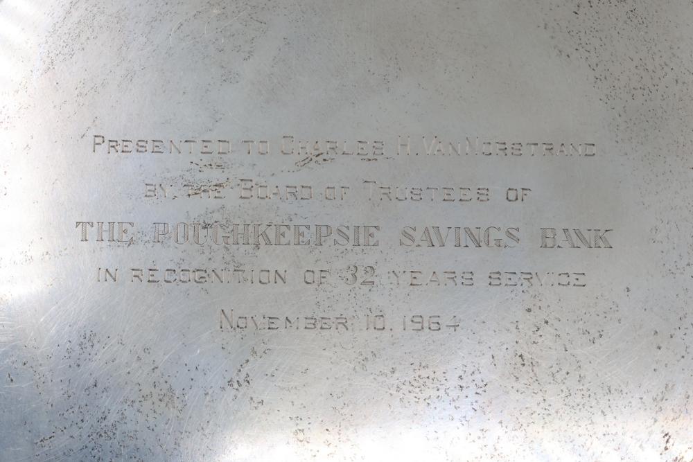 Stieff Sterling Silver Presentation Plate, Dated 1964. The plate bears an inscription presenting it to Charles H. Van Norstrand in recognition of 32 years of service at the Poughkeepsie Savings Bank, dated November 10, 1964. Marked 'Stieff Sterling' on the reverse. Total weight being 393 grams.