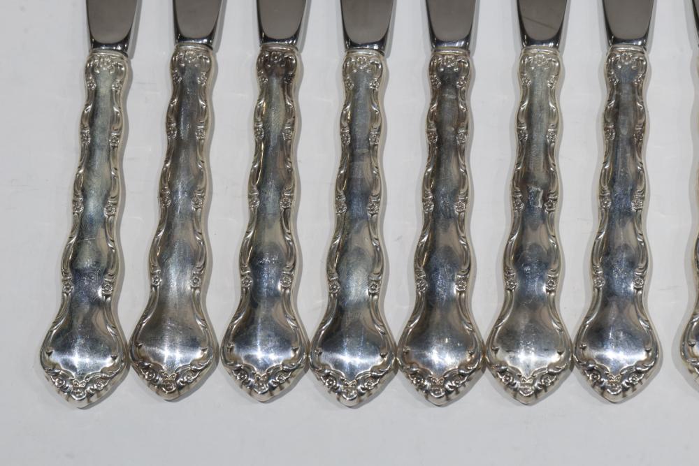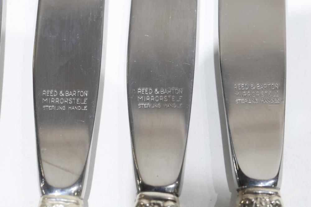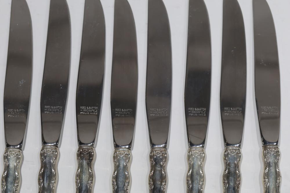 Eight Reed & Barton Mirrorstele knives with sterling silver handles. Features an ornate, floral design on the handles. Blades marked with 'Reed & Barton Mirrorstele'. Total weight being 546 grams.