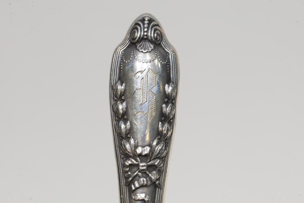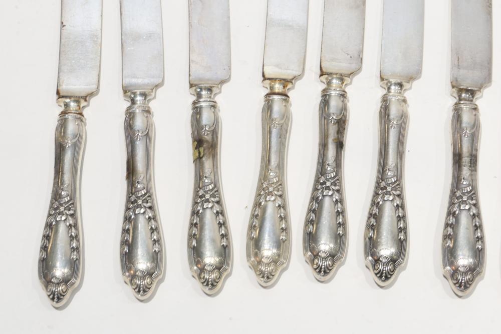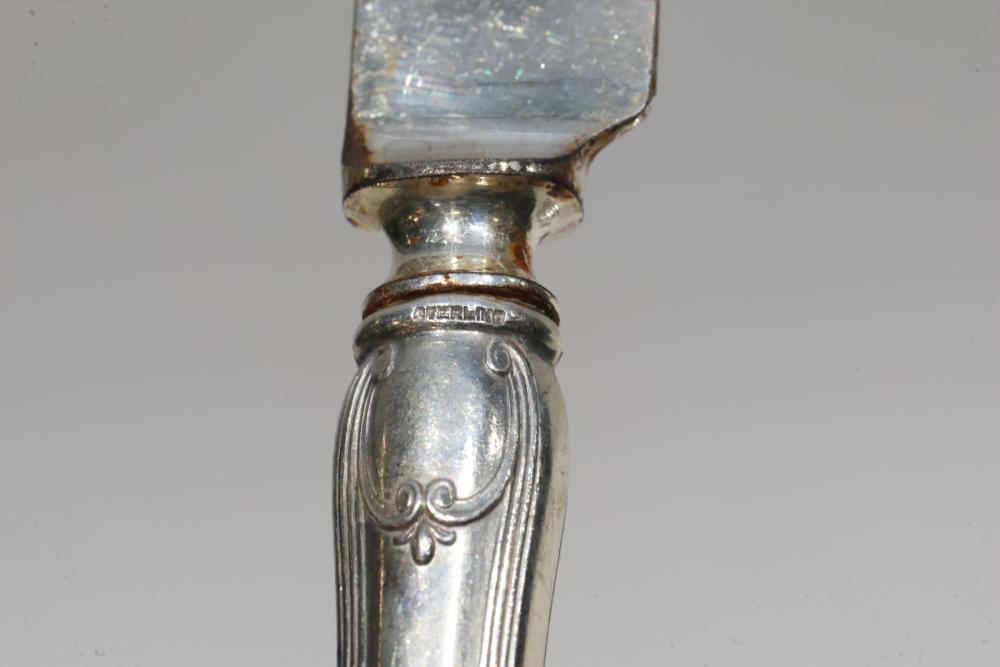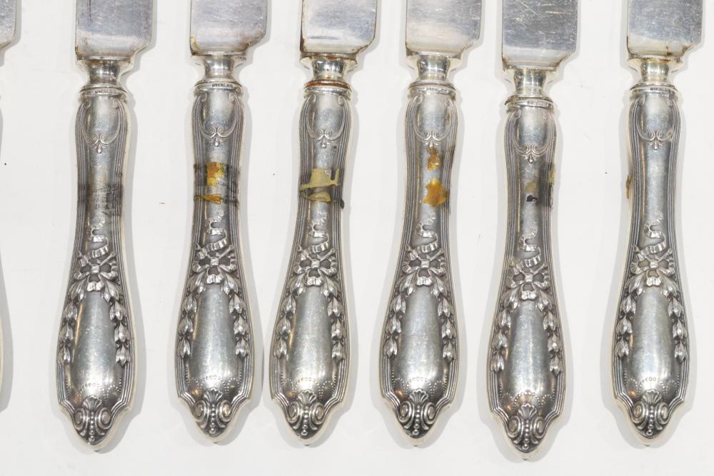 12 Sterling Knives with Ornate Handles. Each knife is stamped "sterling" near the base of the blade and features an ornate decorative handle with detailed motifs. Total weight being 965 grams.