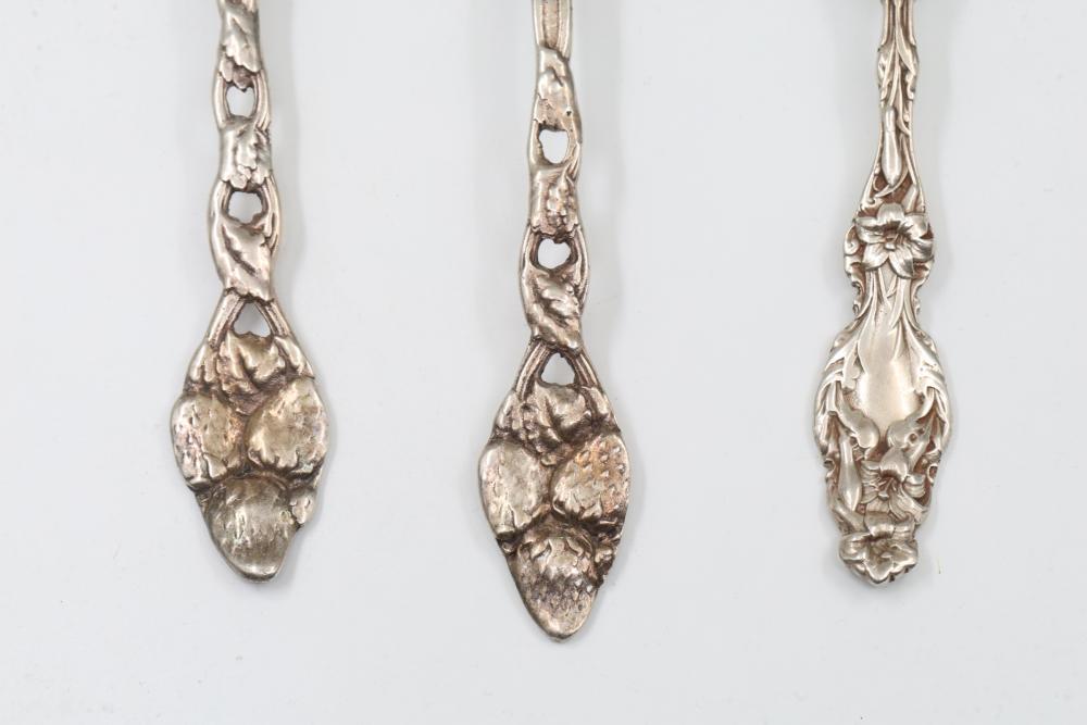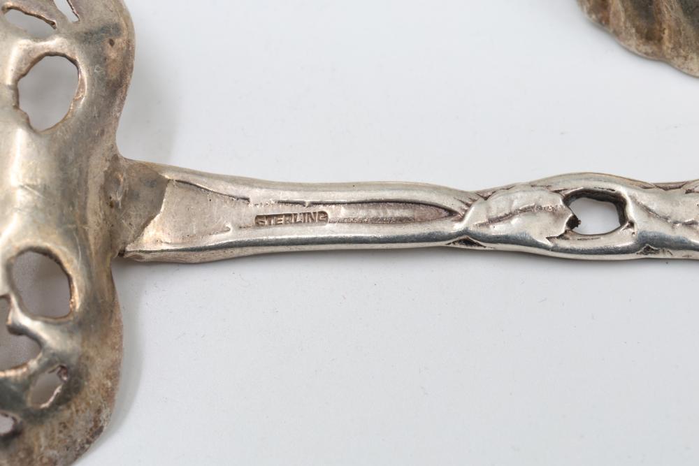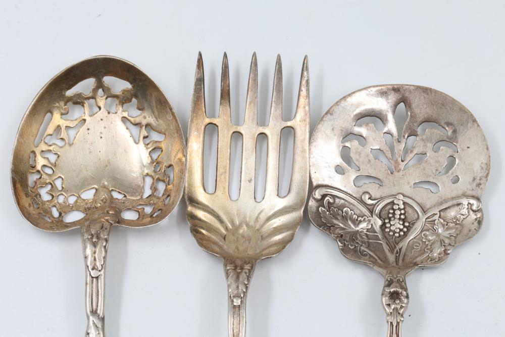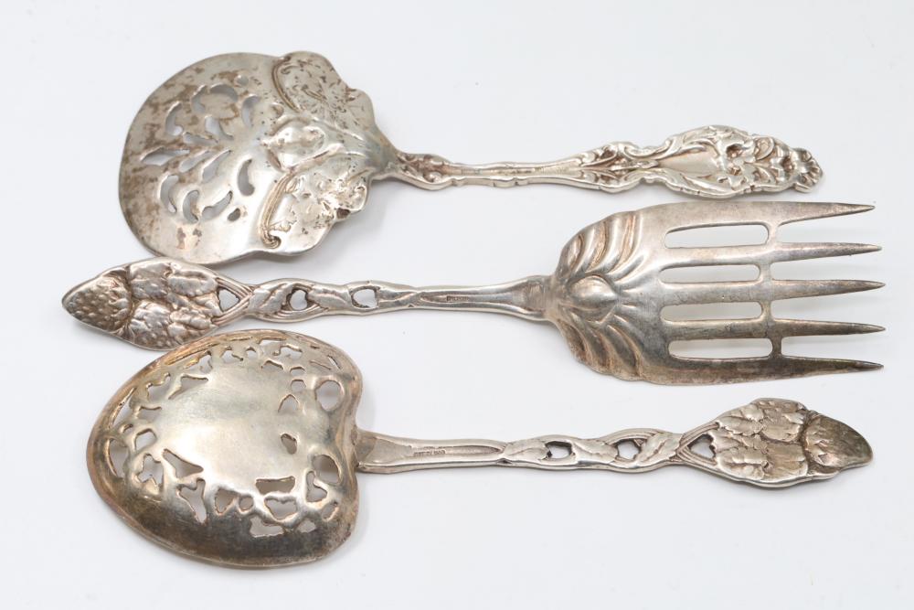 Three Sterling Silver Utensils with Ornate Designs. Includes a serving fork and two serving spoons, each showcasing intricate openwork patterns and detailed handles. Marked 'Sterling' on each piece. Total weight being 316 grams.