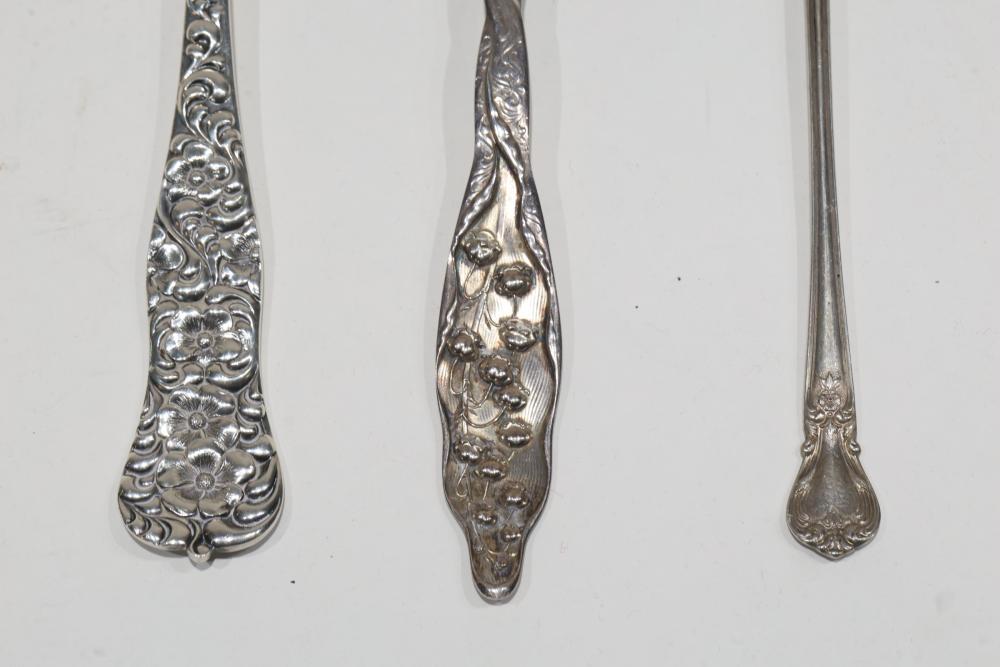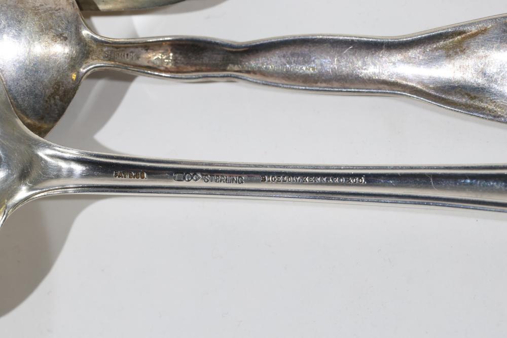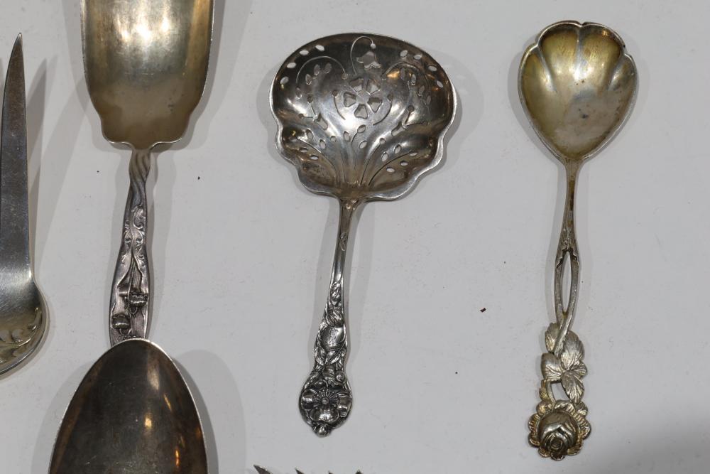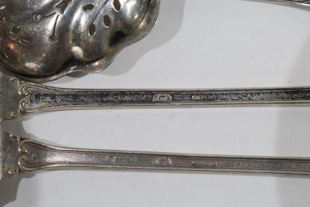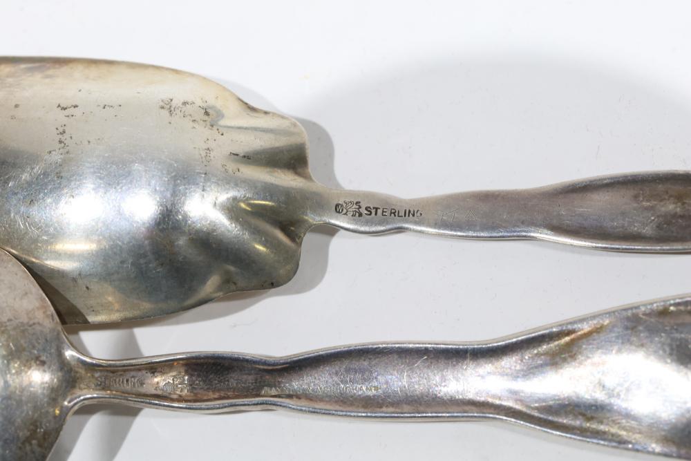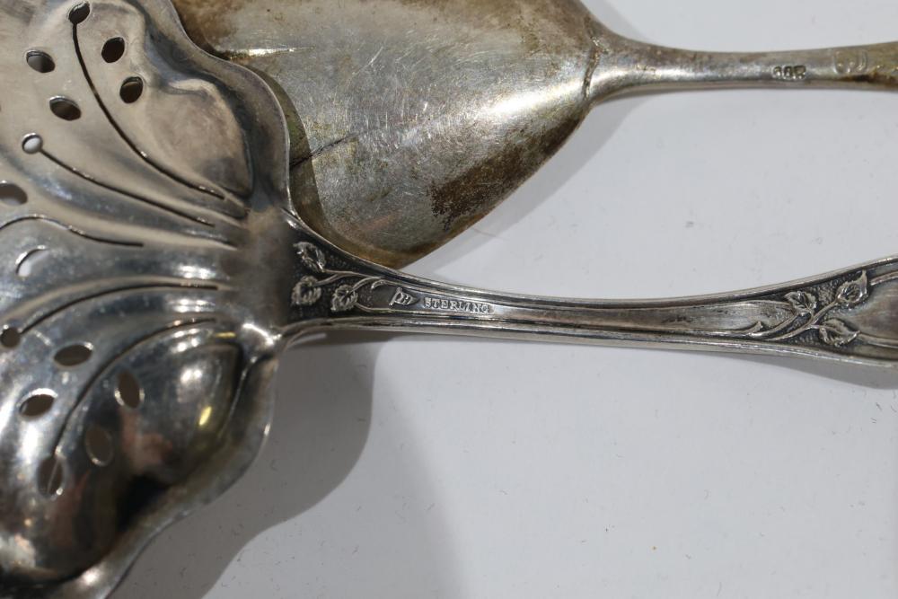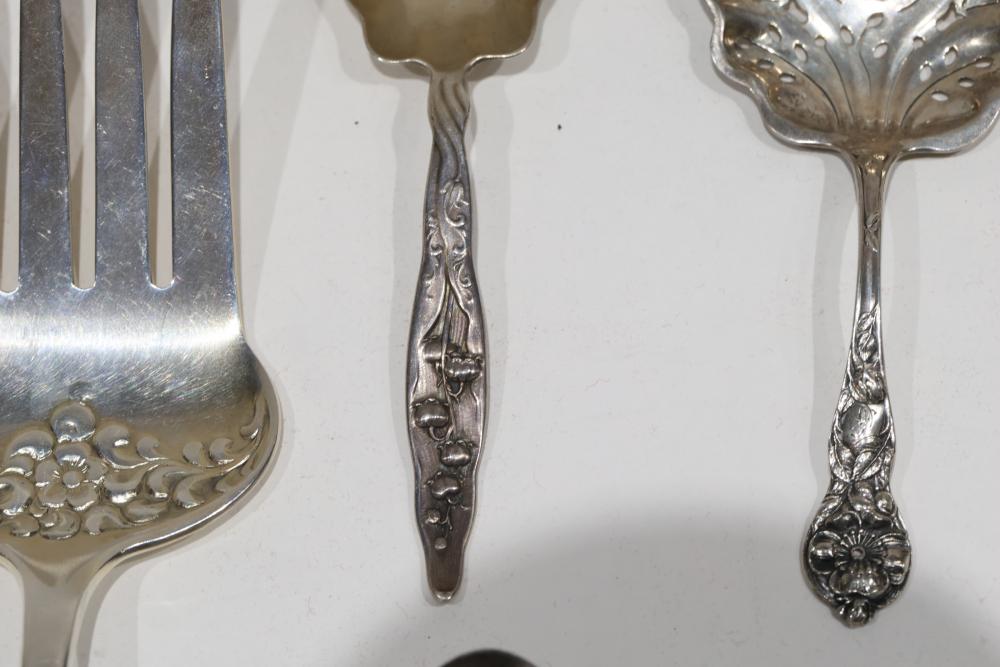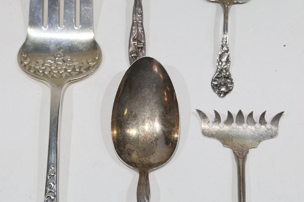 Sterling Silver Flatware With Decorative Handles comprising seven pieces, including forks, spoons, and serving utensils. Each features intricate detailing along the handles and bowls. Hallmarked as sterling with maker markings visible. Total weight being 293 grams.