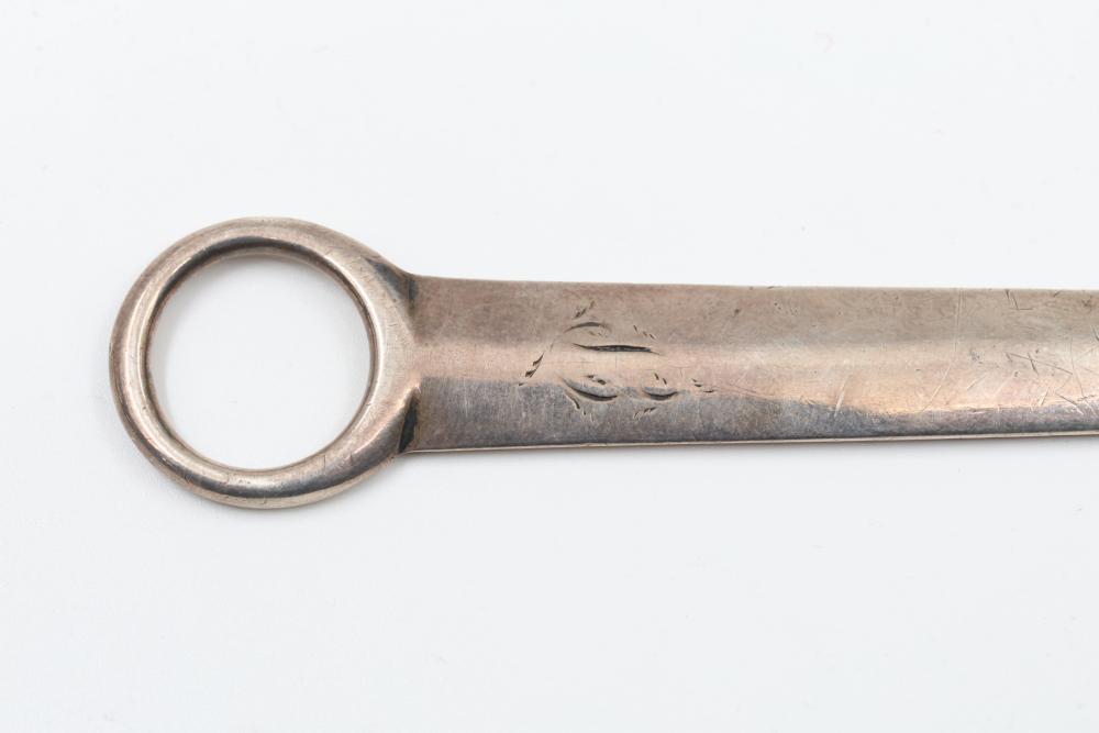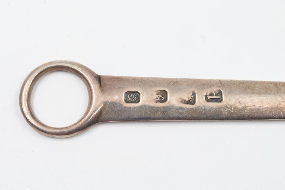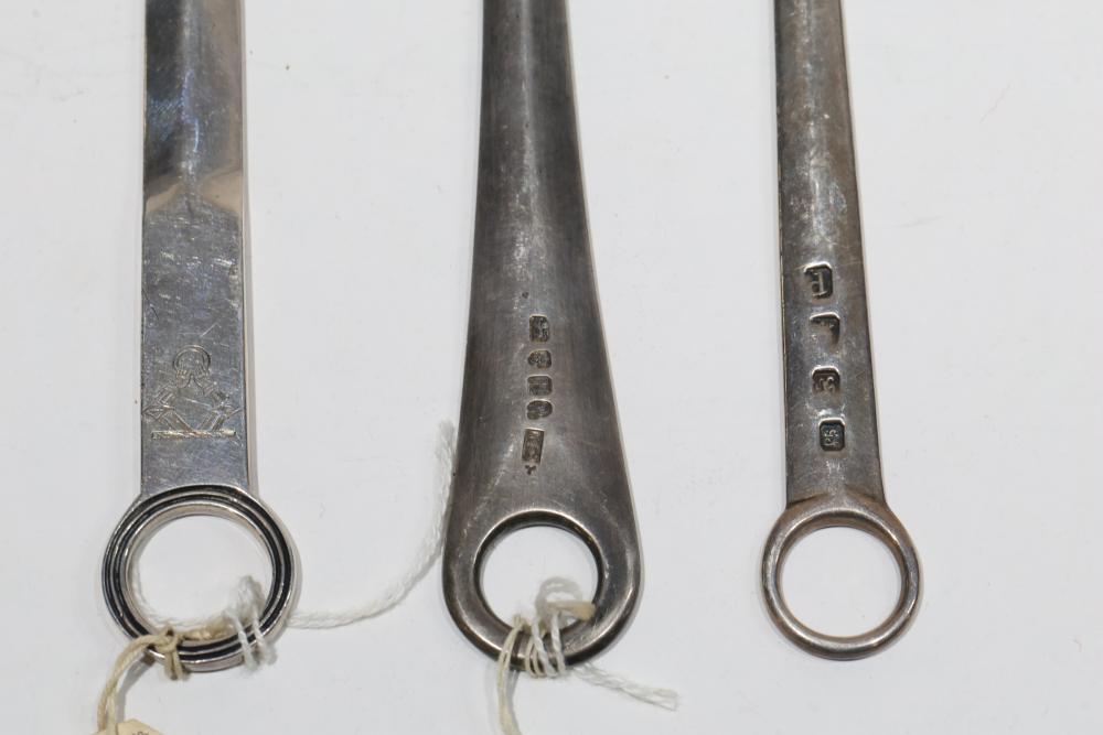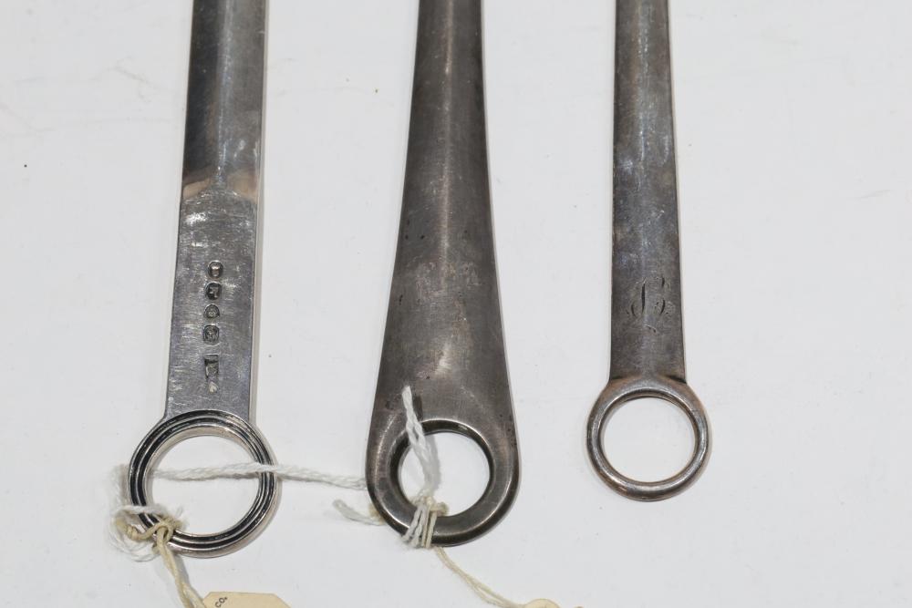 Three Hallmarked Silver Tapered Meat Skewers with Decorative Engravings. Includes three elongated skewers of different lengths, all featuring hallmarks and decorative engravings. Each skewer has a circular handle end and a tapered point. Total weight being 321 grams.