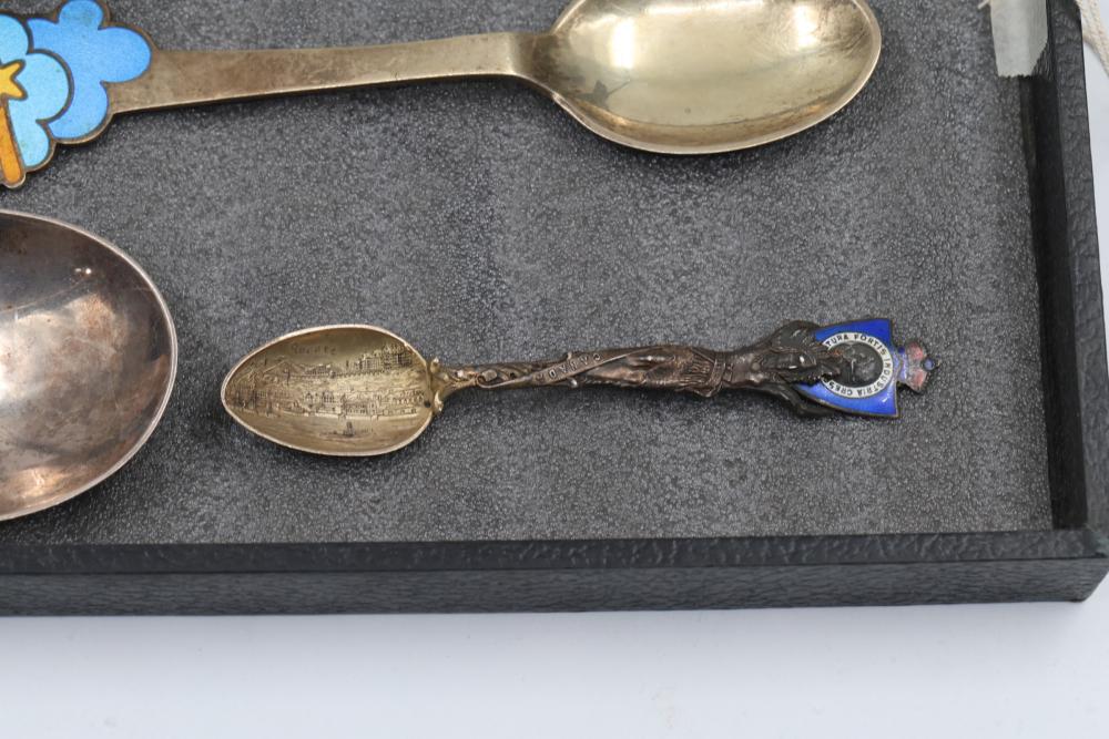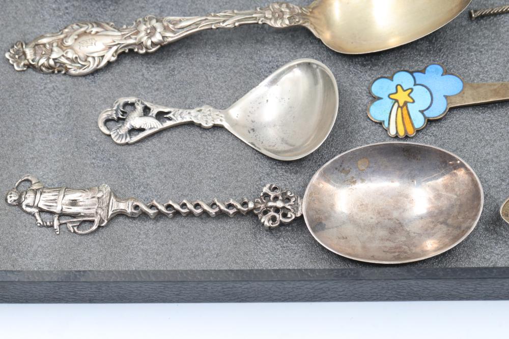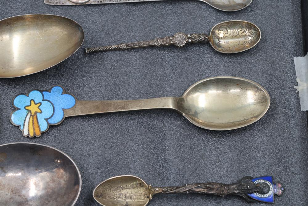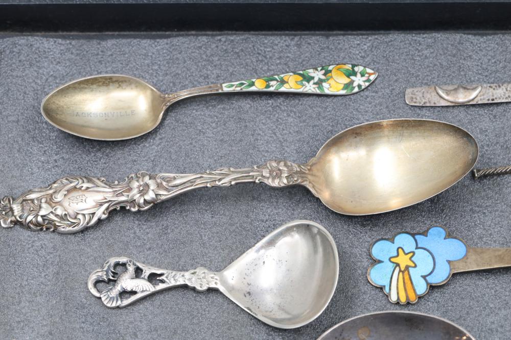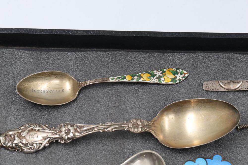 Sterling Silver and Enameled Souvenir Spoons. This assortment includes sterling silver spoons featuring detailed engravings, enamel decorations, and embossed designs. Some spoons depict specific places and notable elements, such as Jacksonville, with visible hallmarks and maker's marks. Total weight being 287 grams.