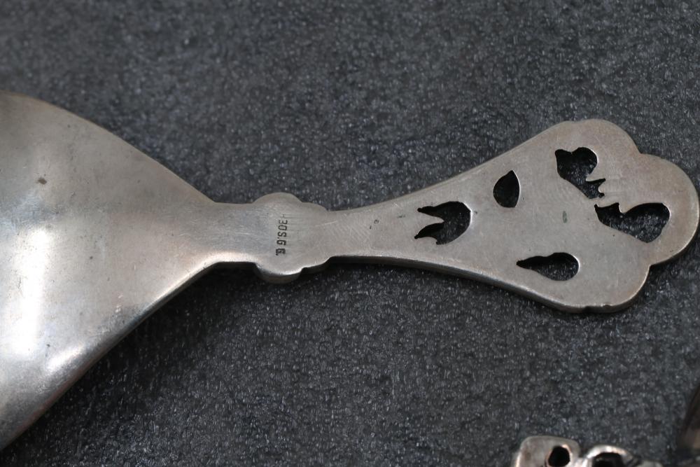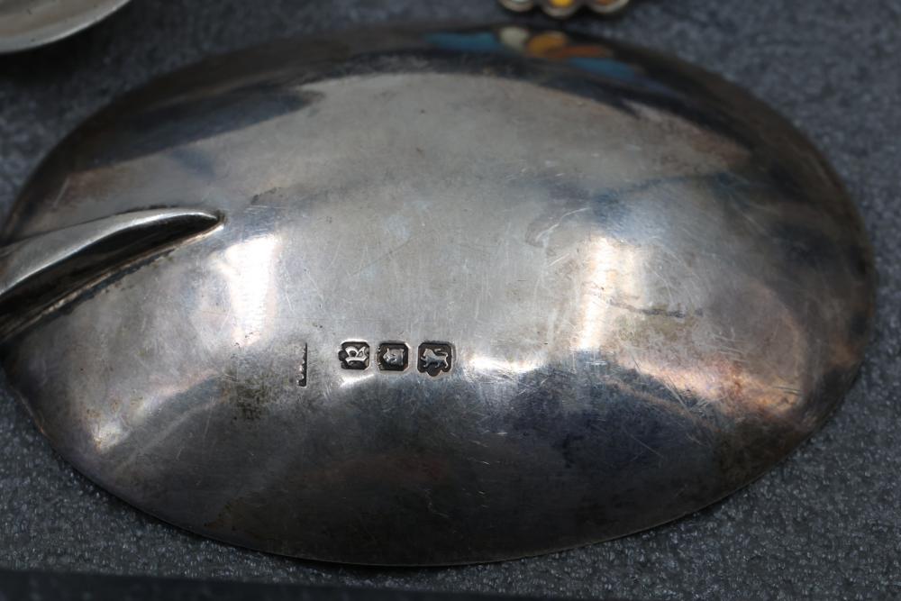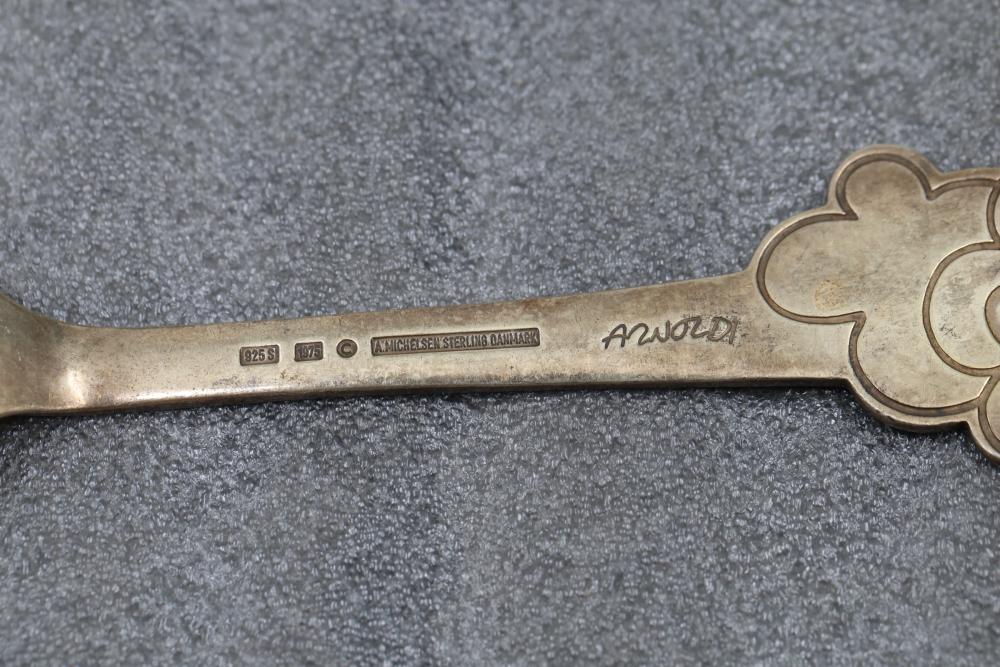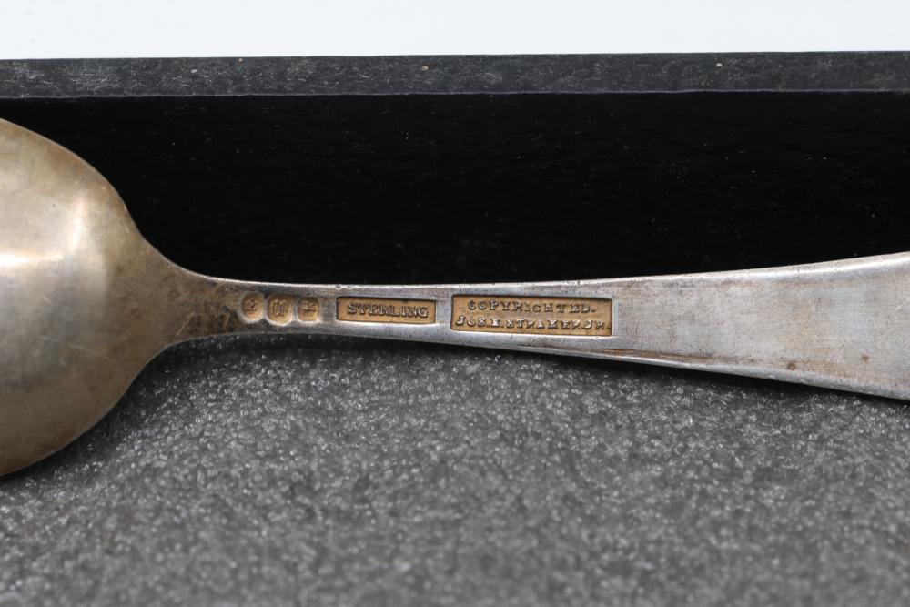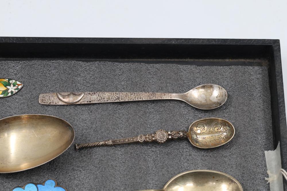 Sterling Silver and Enameled Souvenir Spoons. This assortment includes sterling silver spoons featuring detailed engravings, enamel decorations, and embossed designs. Some spoons depict specific places and notable elements, such as Jacksonville, with visible hallmarks and maker's marks. Total weight being 287 grams.