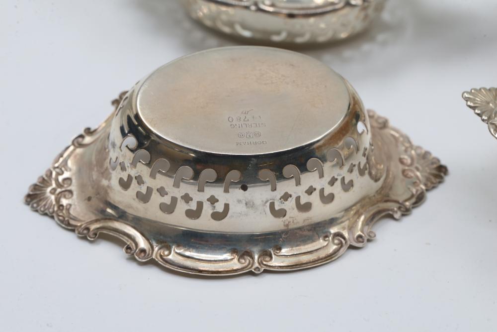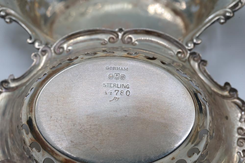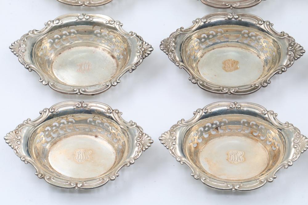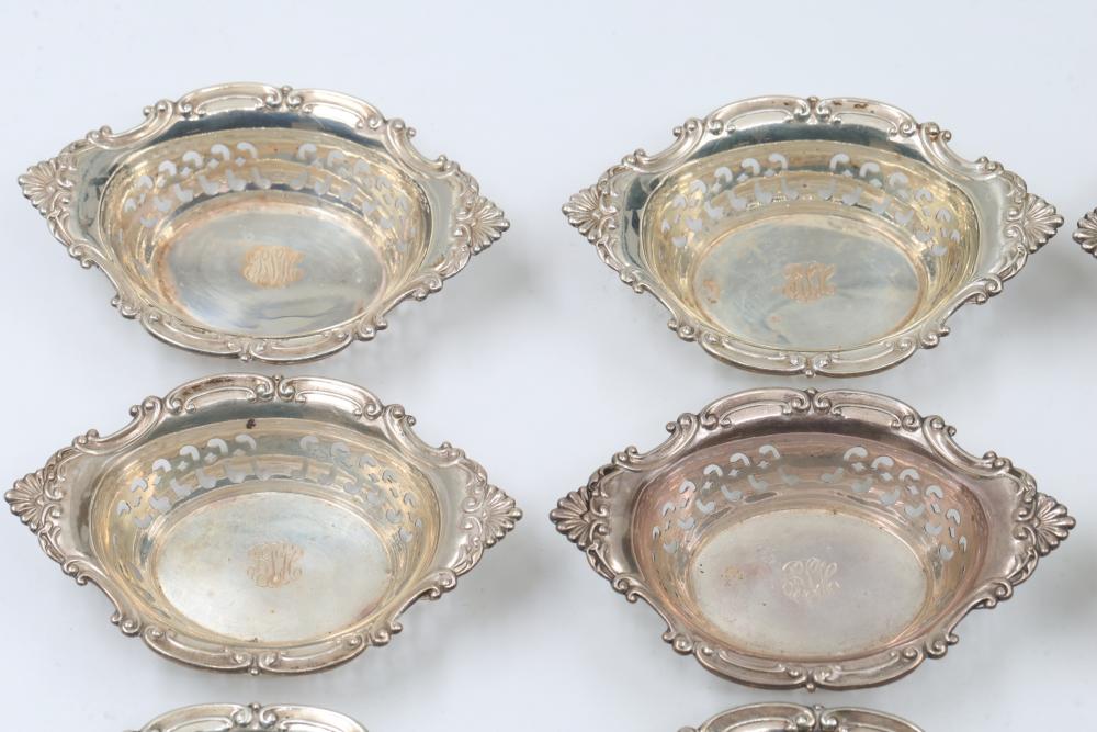 12 Gorham Sterling Silver Bowls with Monogram Engraving. Each bowl features an intricate pierced design around the sides, decorative handles, and engraved monogram detail in the center. Marked with Gorham Sterling marks on the underside and numbered A4780. Total weight being 302 grams.