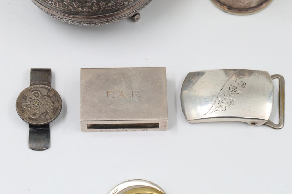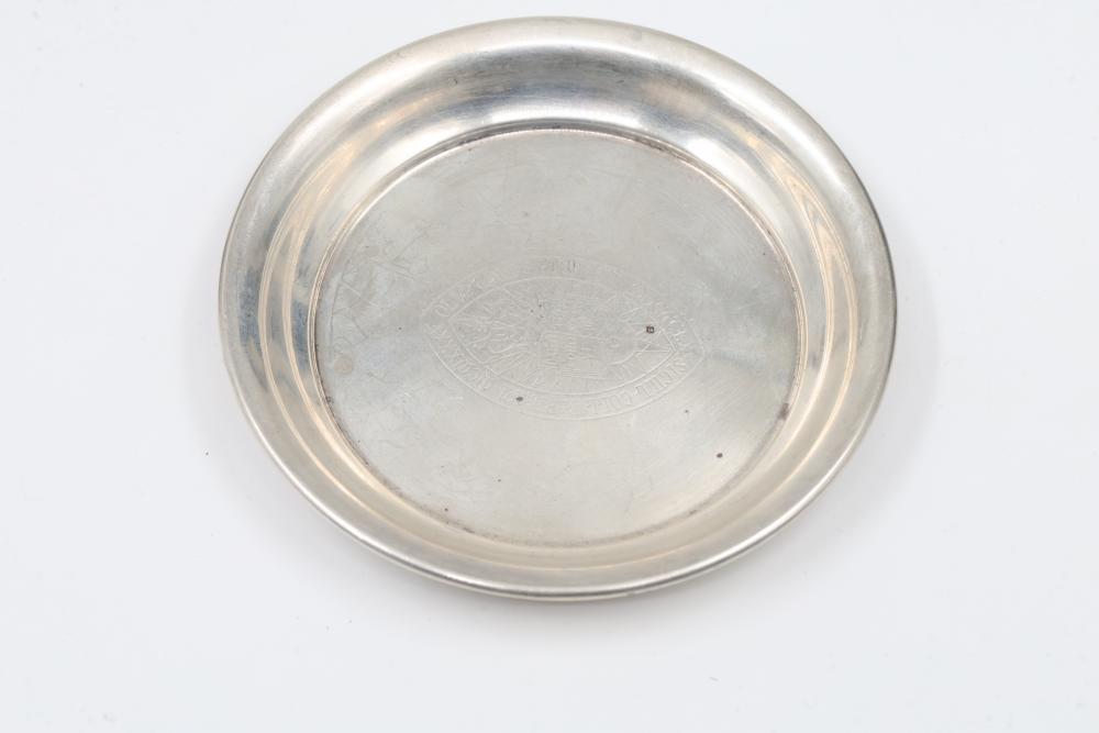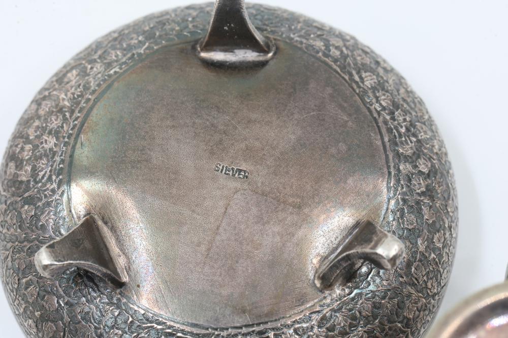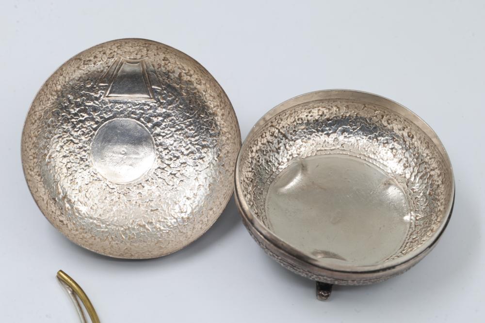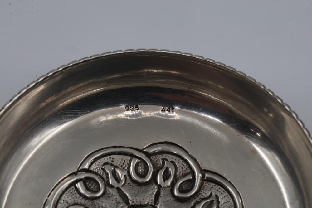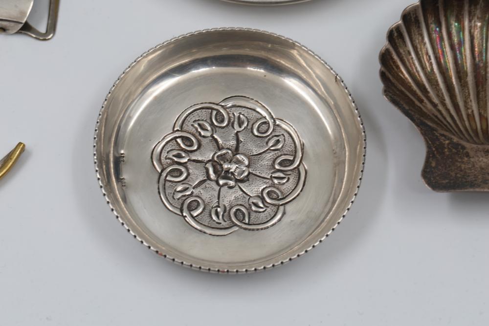 Sterling Silver Assortment with Decorative and Functional Items. Includes a variety of sterling silver pieces, such as a small mug, shell-shaped dishes, decorative circular trays, a brooch, a lidded container, and other small items. Some items display markings, engravings, or hallmarks indicating .925 sterling silver. Total weight being 322 grams.