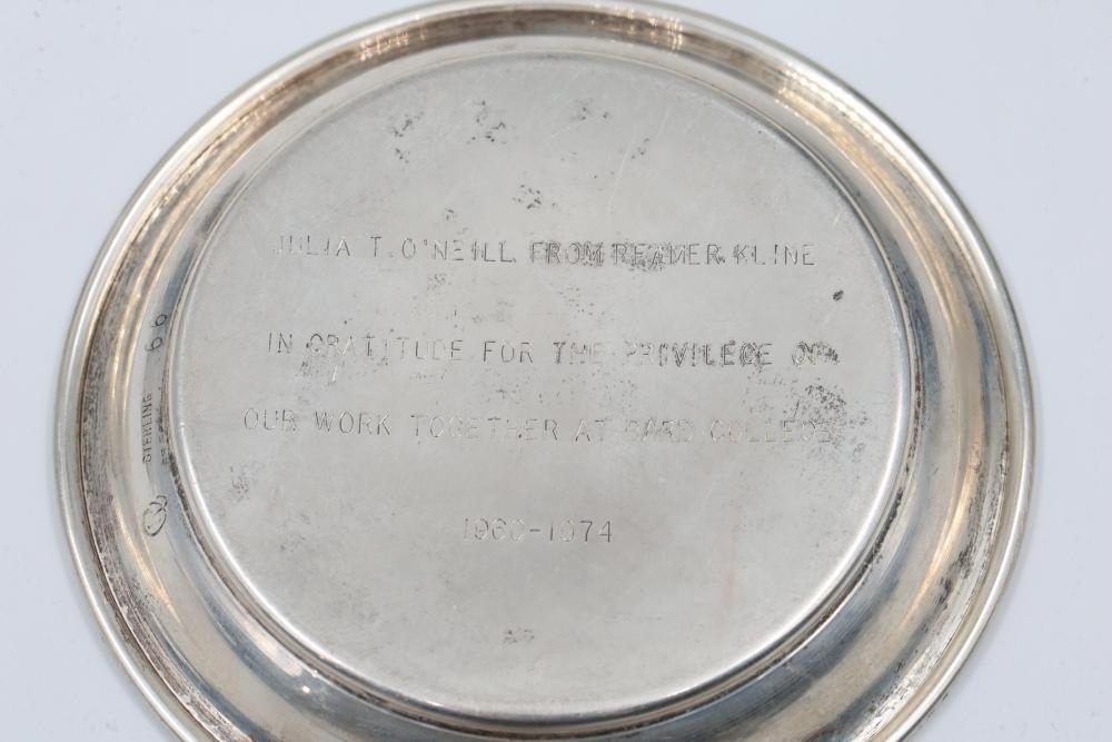 Items include 18K Rose Gold Tiffany & Co. Paloma Picasso Graffiti Narrow Love Kisses Ring; Tiffany & Co. Platinum Bee Pendant Necklace with Diamonds and Yellow Sapphire; Tiffany & Co. Sterling Silver Knife Rests with Wooden Inserts; Tiffany & Co. Platinum Engagement Ring with Diamond and Certification; Tiffany & Co. Crystal Symphony 1999 World Cruise Sterling Pendant; Tiffany & Co. Shirt Studs 14k Gold with Sapphires; Six Sterling Silver Teaspoons with Monogram; Decorative Metal Bowl With Embossed Floral Design; Reed & Barton Mirrosteel Sterling Knives and Butter Spreaders & much more. Items are located in Pleasant Valley, NY.