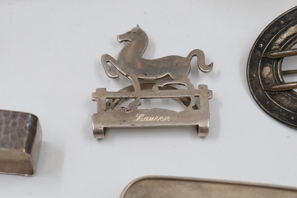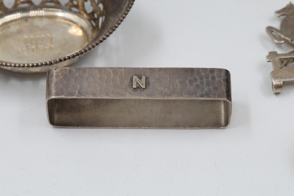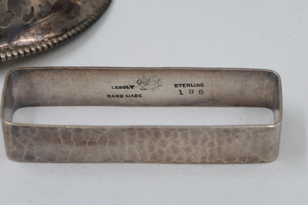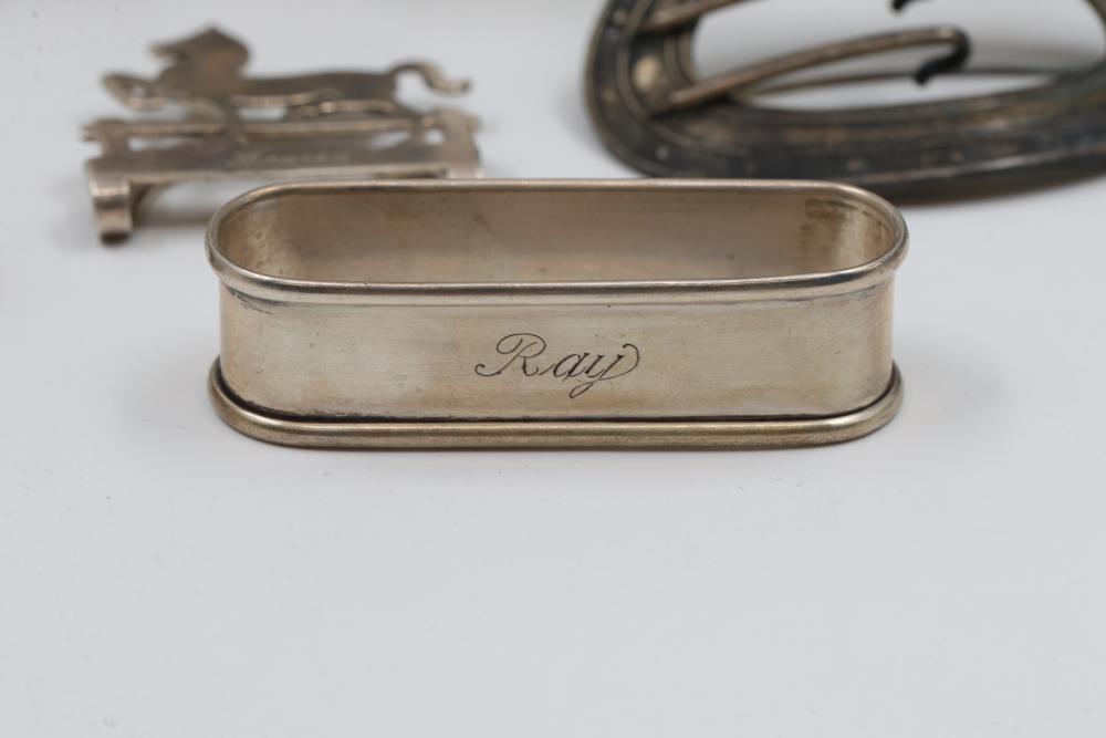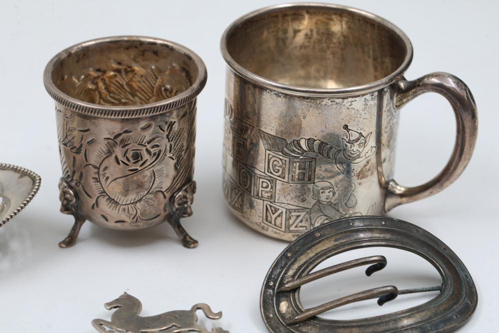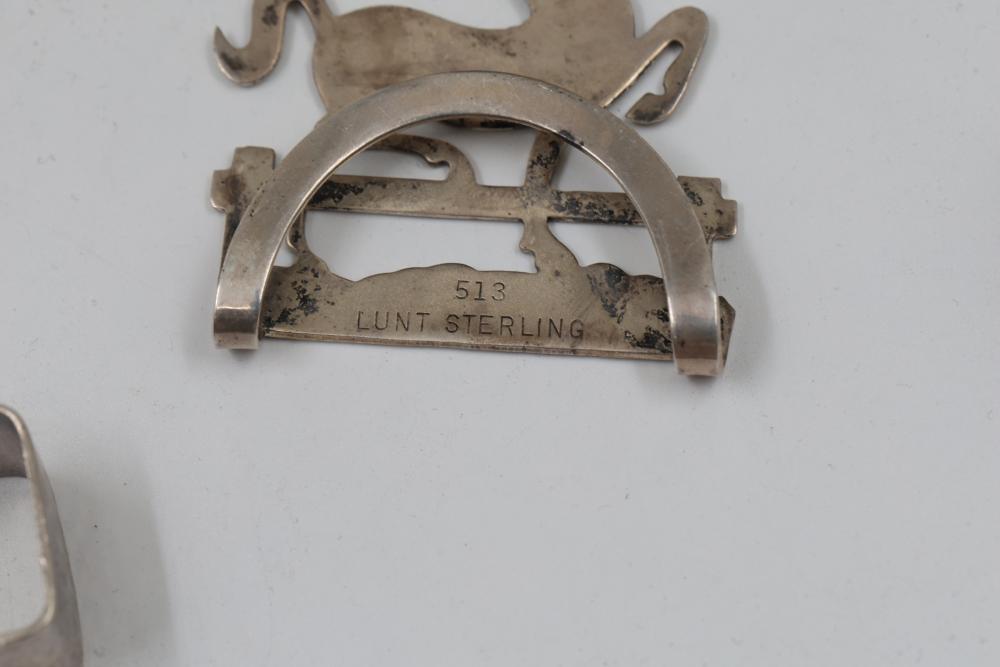 Sterling Silver Assorted Items Including Cups, Bowls, and Accessories. Includes engraved cups, a set of decorative bowls with pierced and beaded details, a buckle, a horse figure marked 'Lunt Sterling,' and several napkin rings, each marked appropriately with sterling stamps. Total weight being 326 grams.