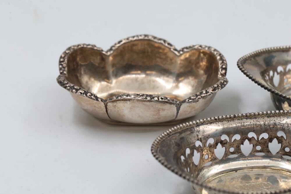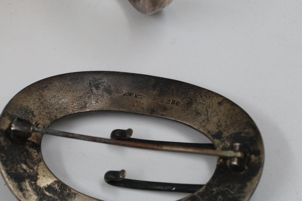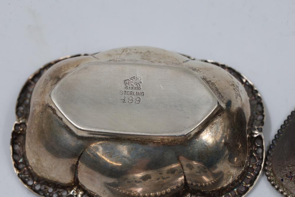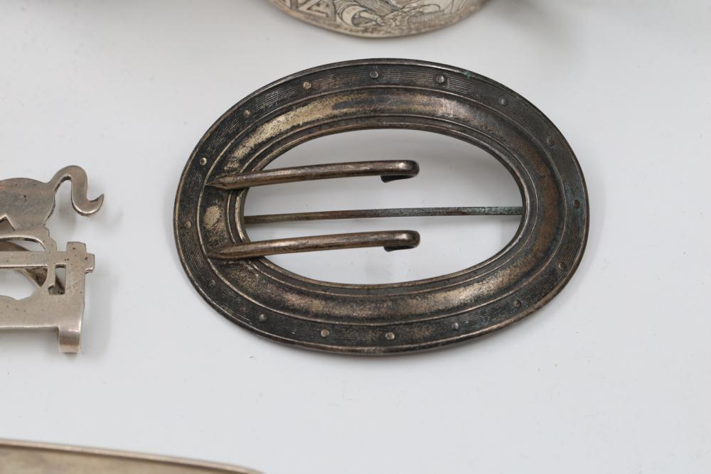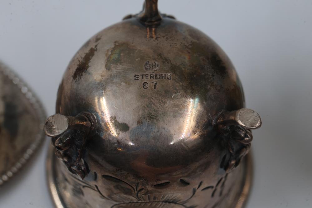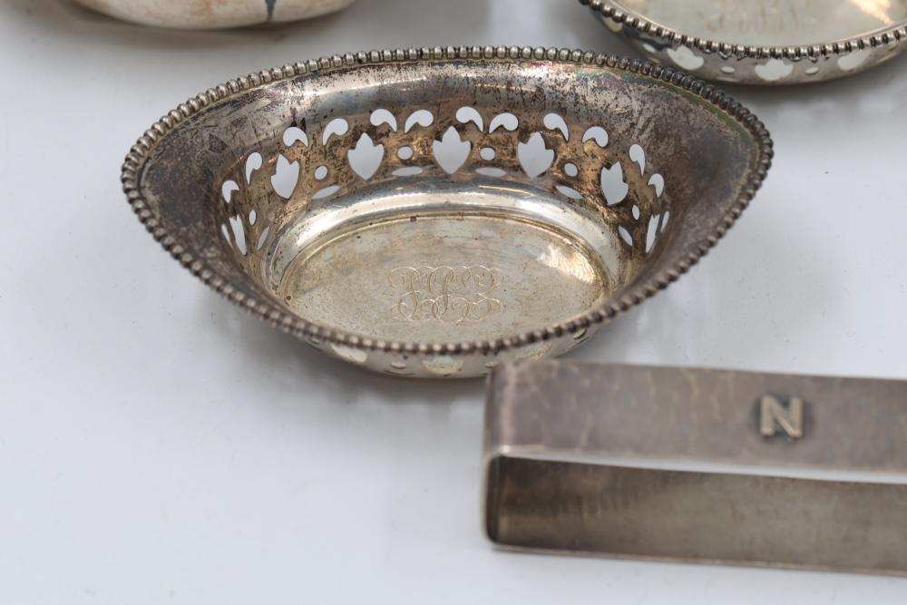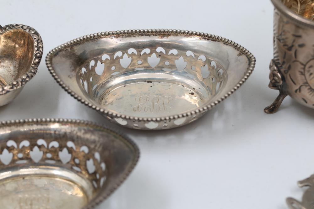 Sterling Silver Assorted Items Including Cups, Bowls, and Accessories. Includes engraved cups, a set of decorative bowls with pierced and beaded details, a buckle, a horse figure marked 'Lunt Sterling,' and several napkin rings, each marked appropriately with sterling stamps. Total weight being 326 grams.