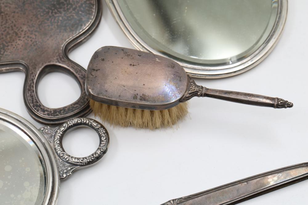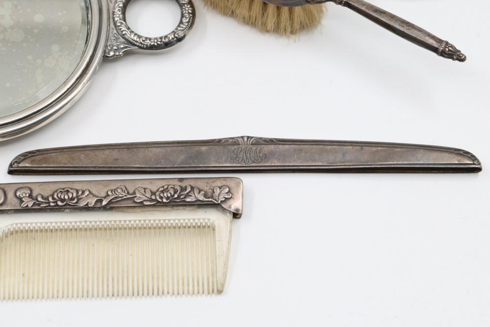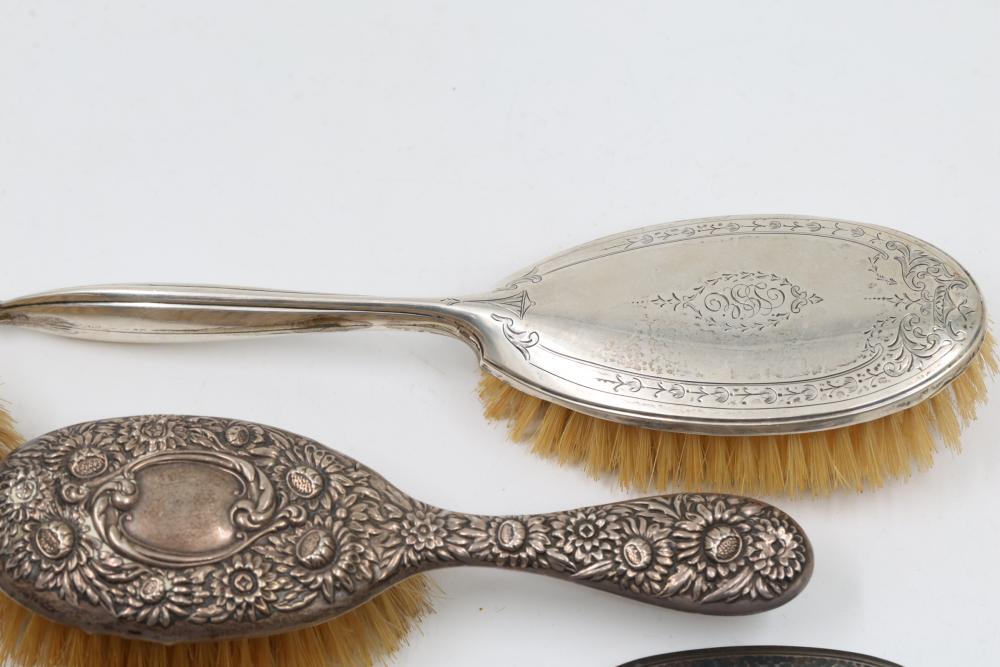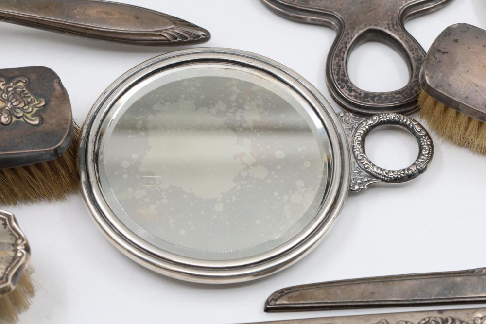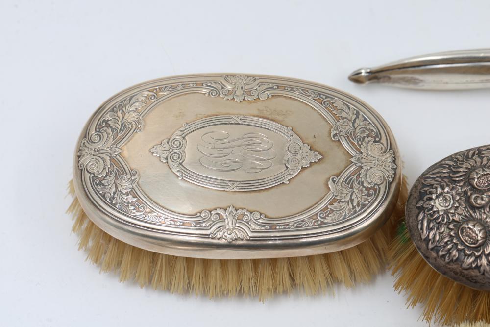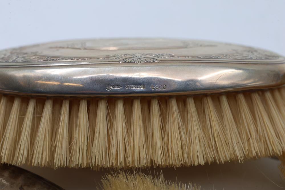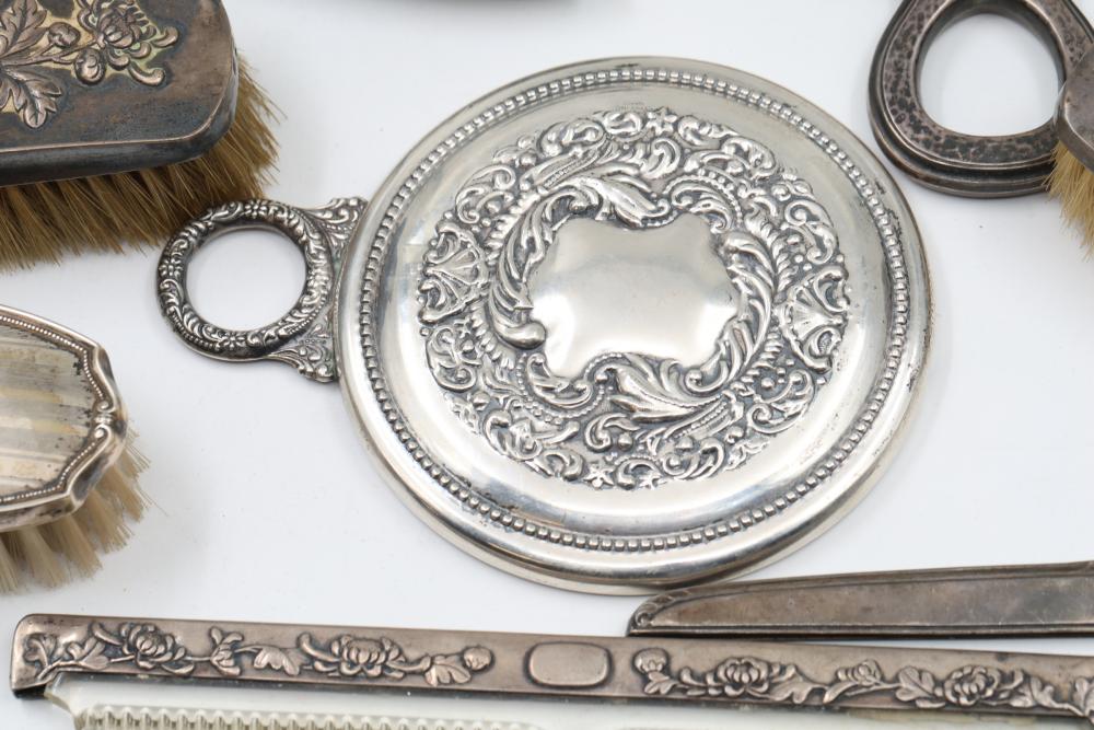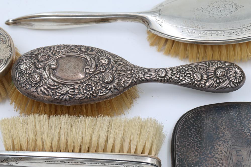 Sterling Vanity Set Brushes, Mirrors, and Comb. Includes multiple sterling silver grooming items such as mirrors, brushes, comb, and additional accessories, all with ornate designs and sterling silver handles. Total weight being 1773 grams.