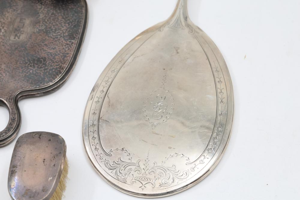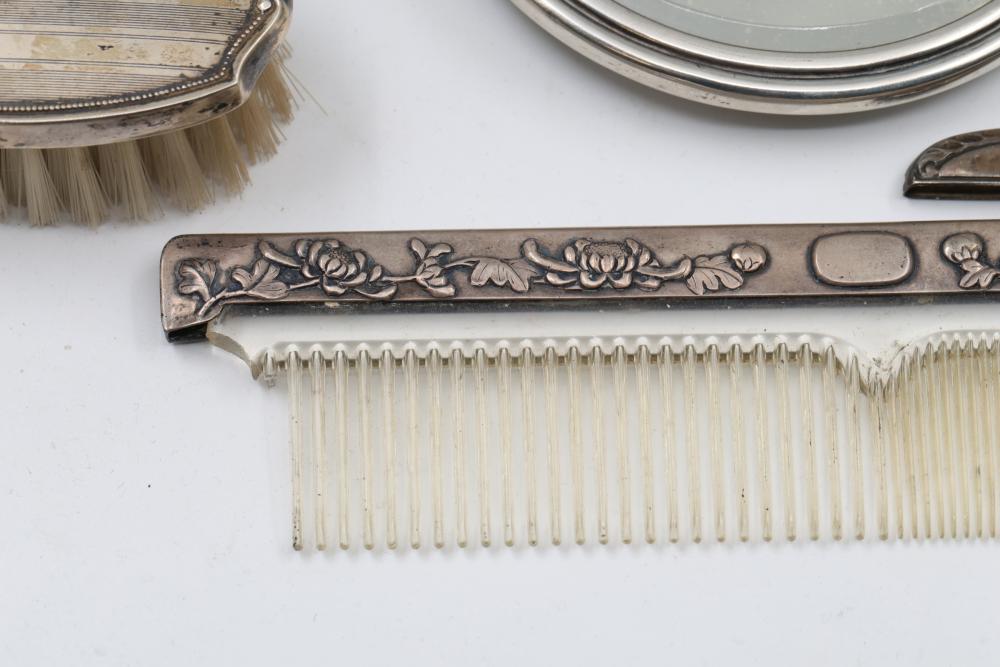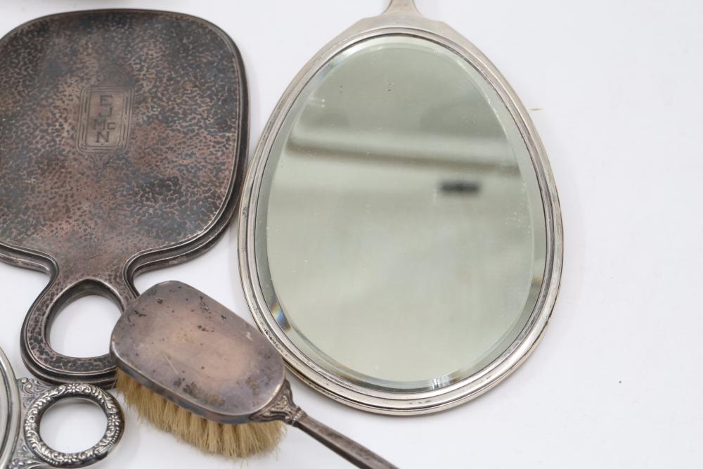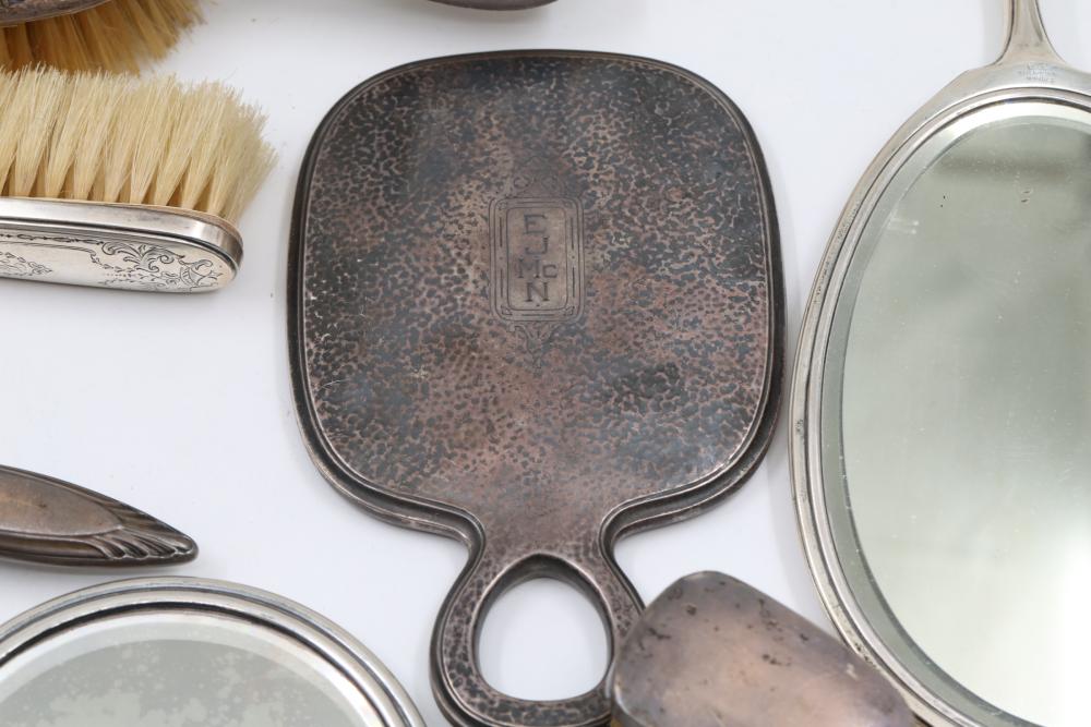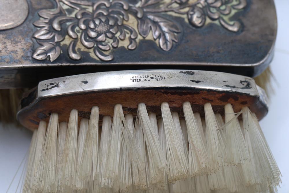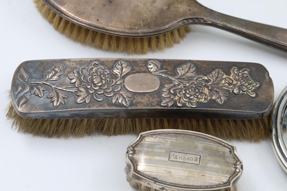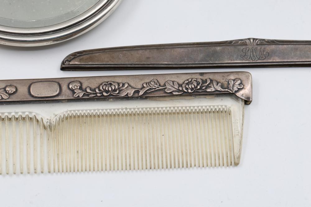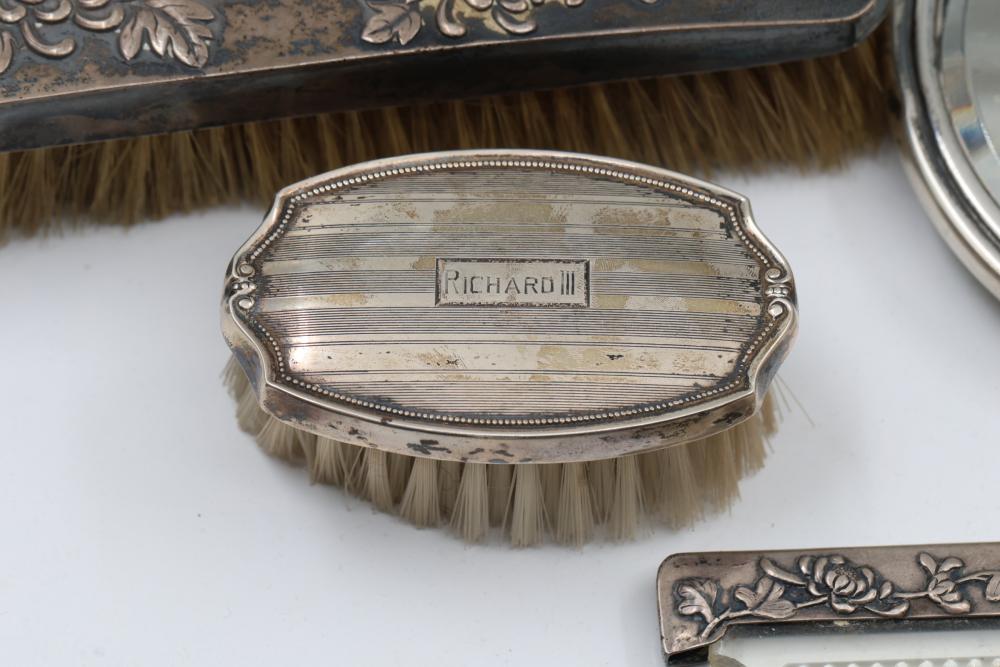Sterling Vanity Set Brushes, Mirrors, and Comb. Includes multiple sterling silver grooming items such as mirrors, brushes, comb, and additional accessories, all with ornate designs and sterling silver handles. Total weight being 1773 grams.