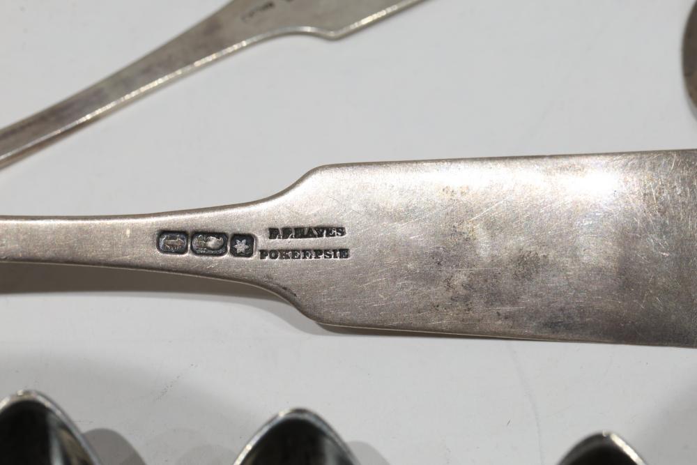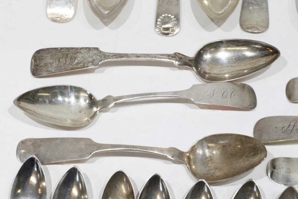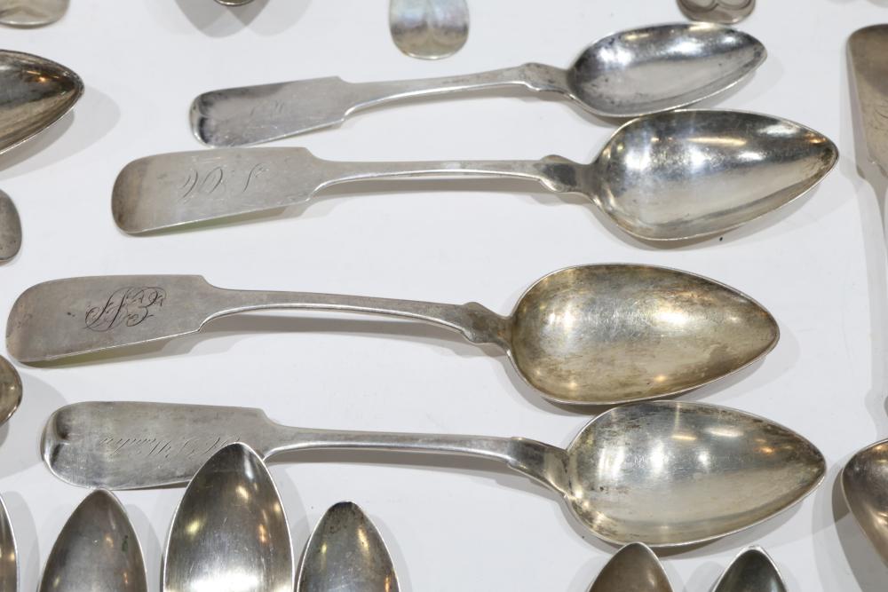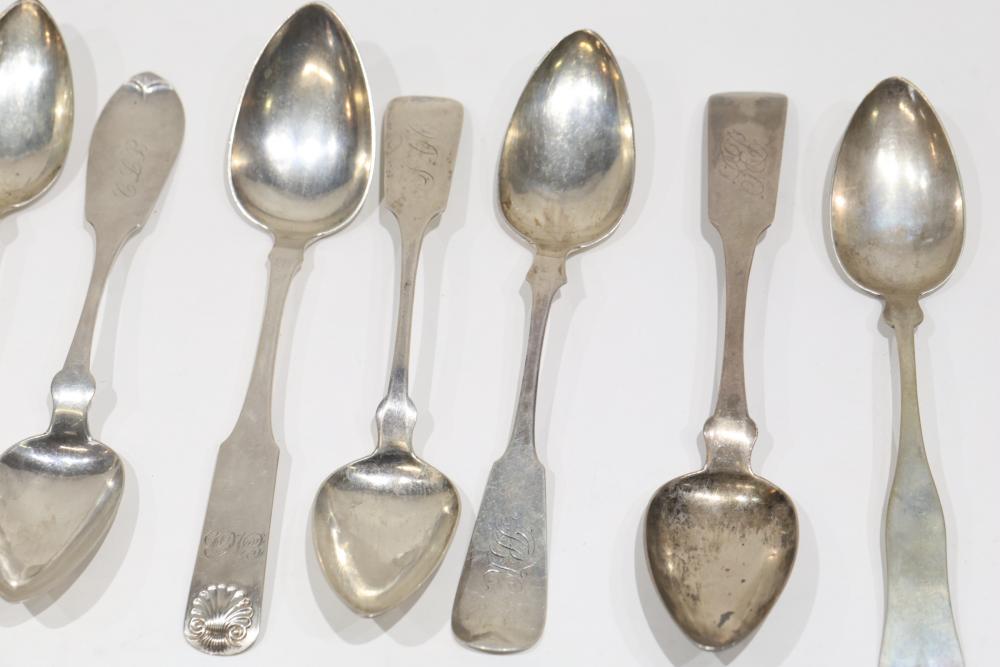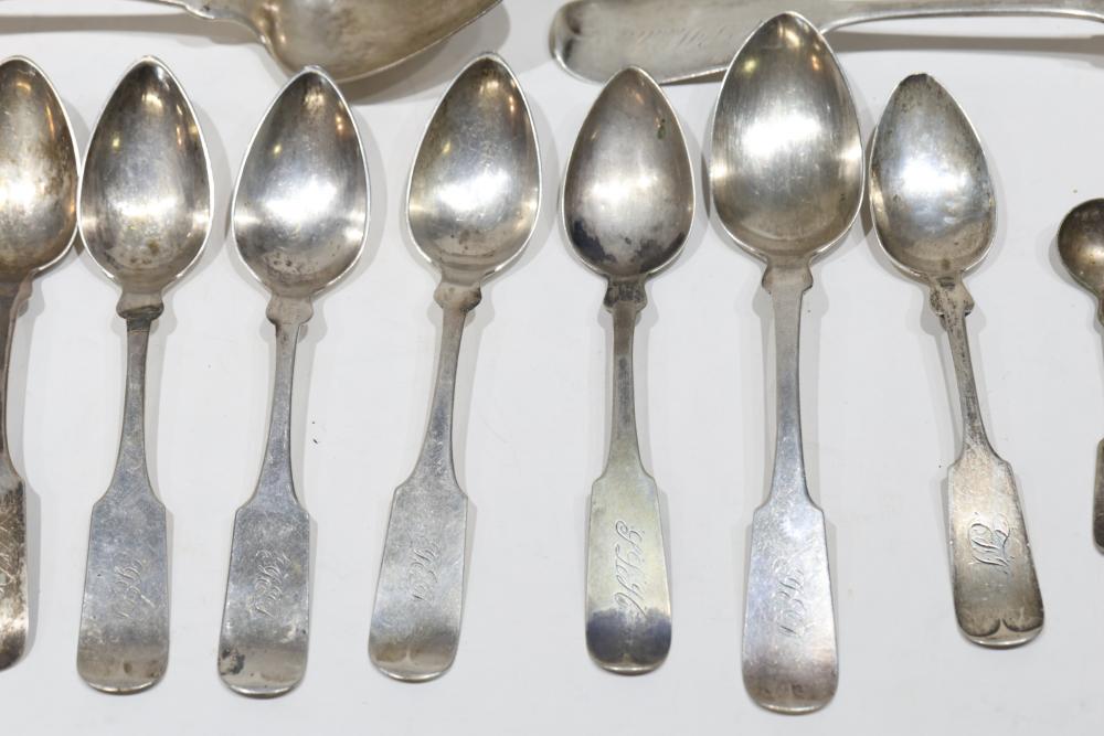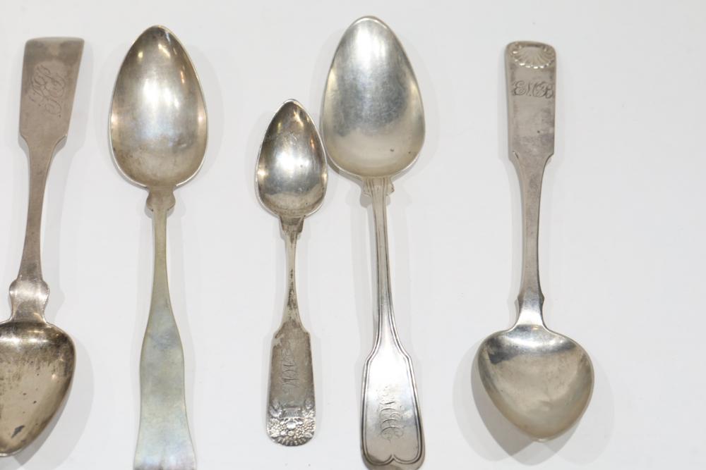 Coin Silver Flatware Pieces. Includes spoons of various sizes and designs, with engraved monograms and hallmarks. Notable makers include C.S. Ball, McCarty & Hurlbert, and P.P. Hayes. A variety of ornate patterns and inscriptions are visible on the handles. Total weight being 1,081 grams.