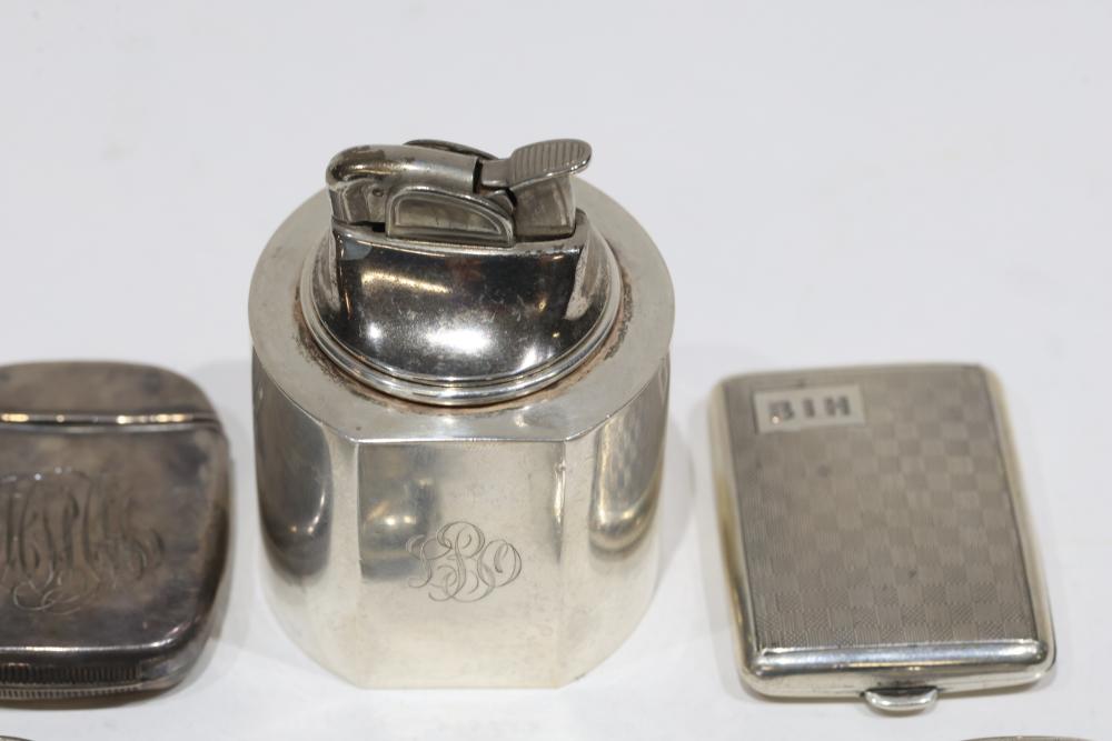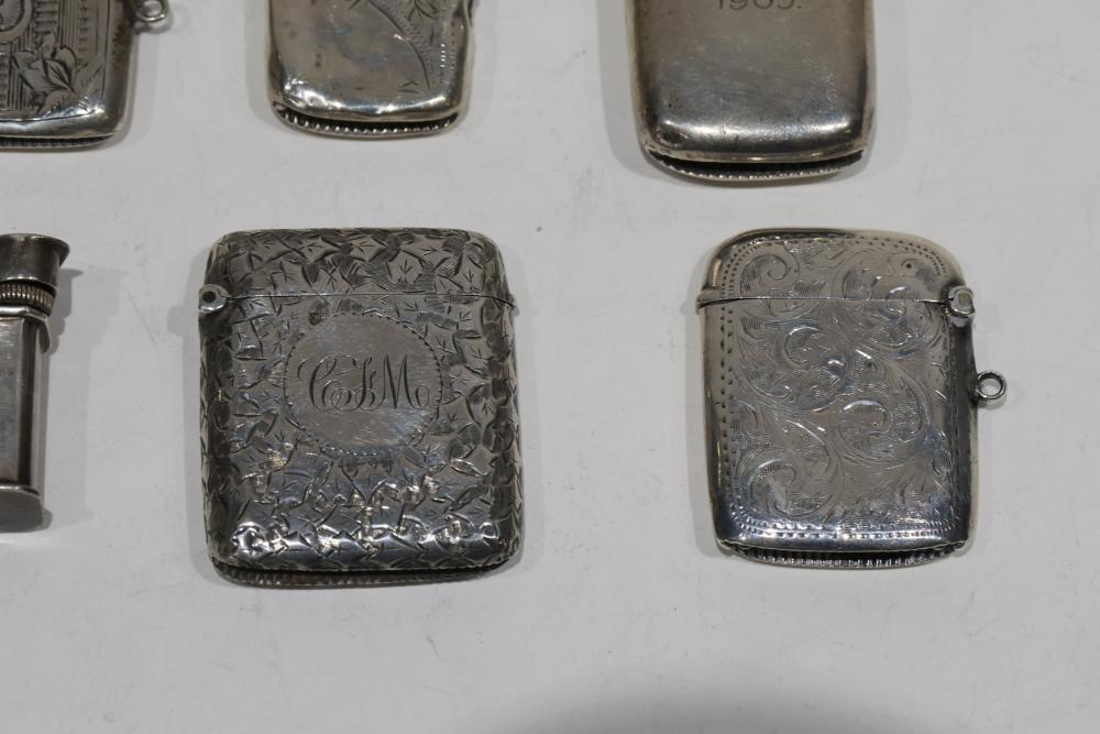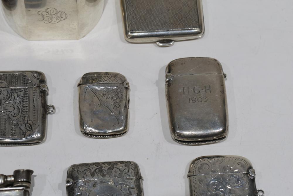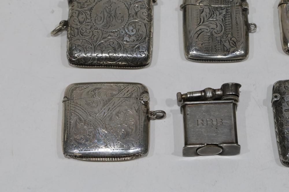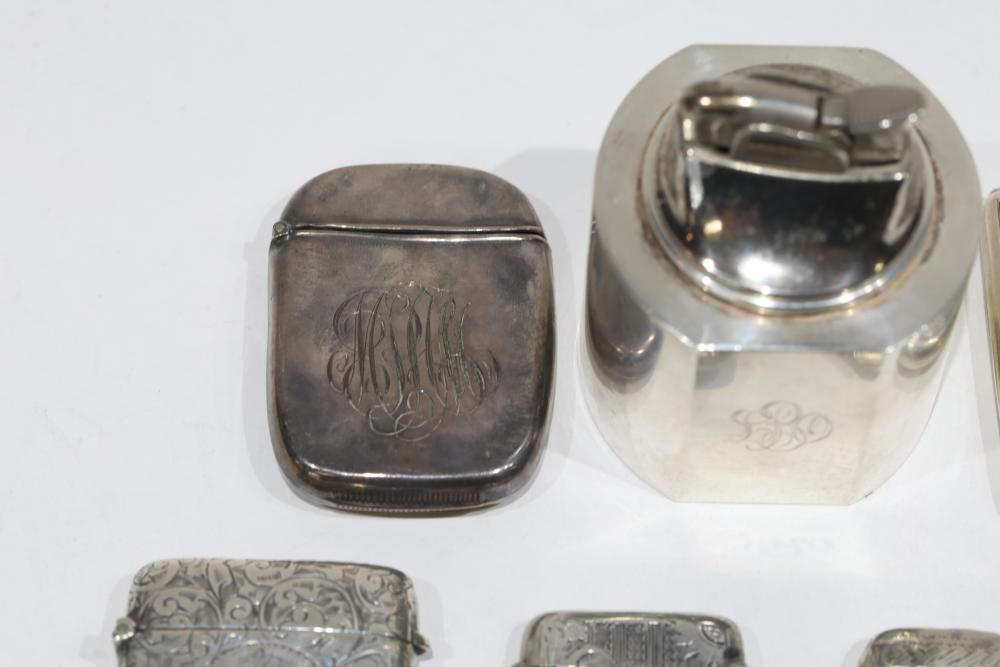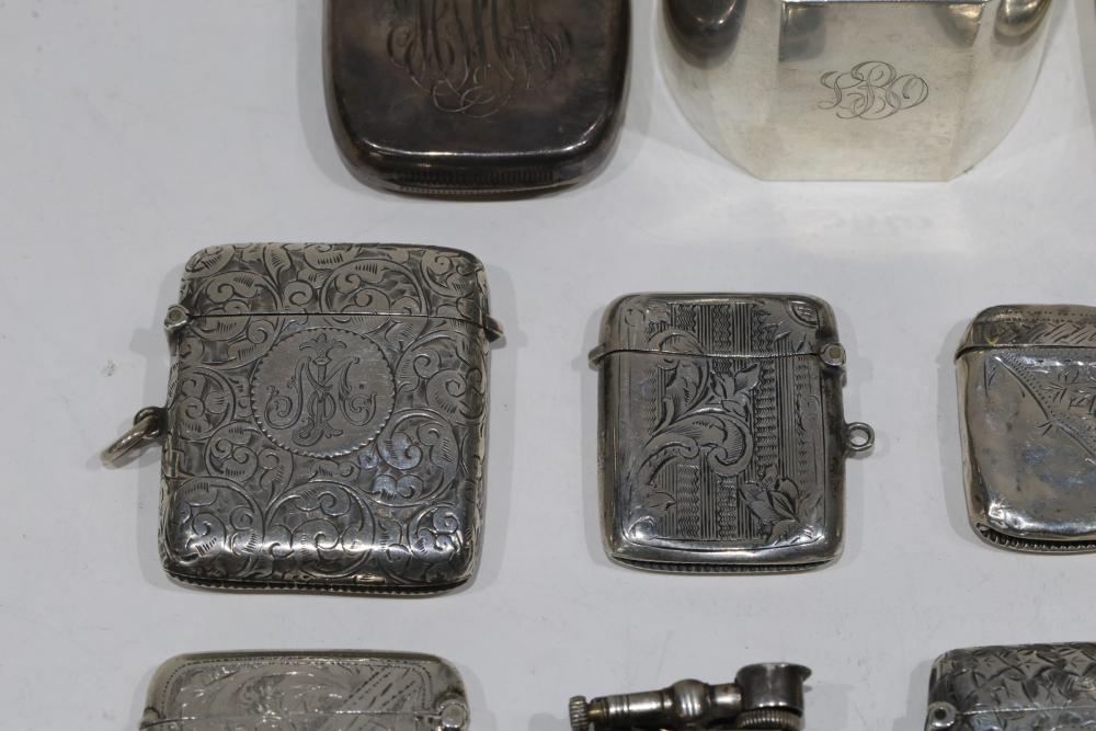Sterling Silver Match Safes and Lighter Grouping. Includes a variety of sterling silver match safes with intricate engraved designs, monograms, and maker's hallmarks, along with two silver lighters, one of which is marked "Black, Starr & Gorham Sterling Weighted 555." Several pieces are marked with sterling or hallmark stamps. Total weight being 526 grams.