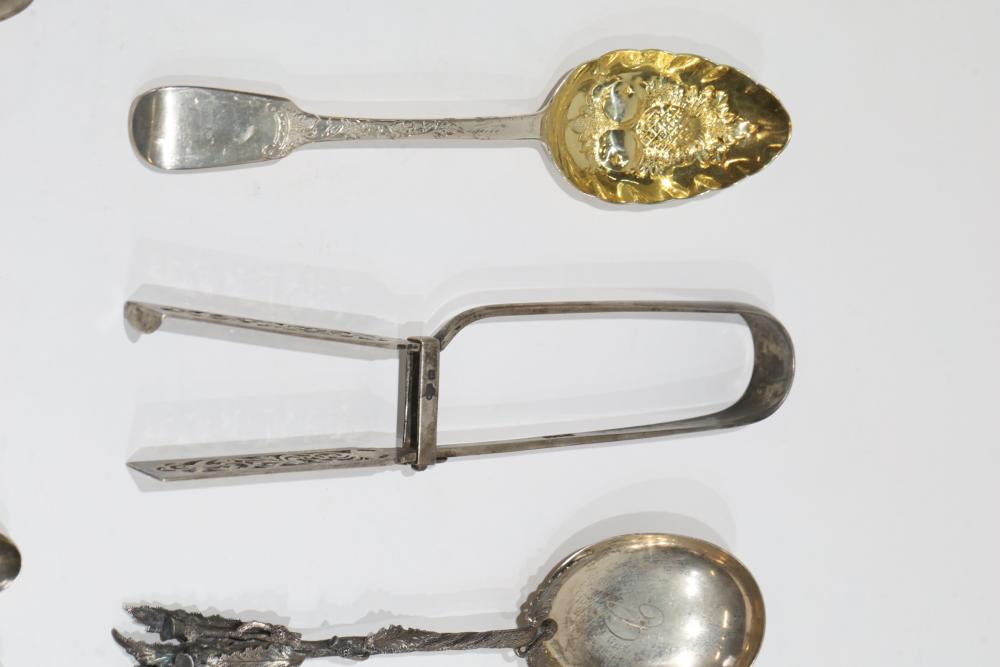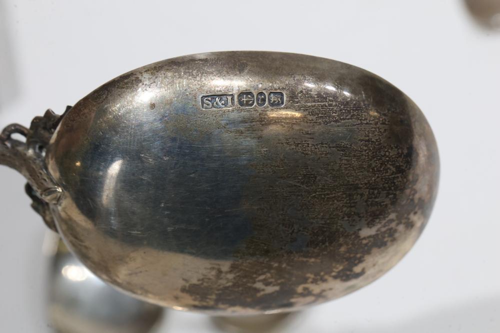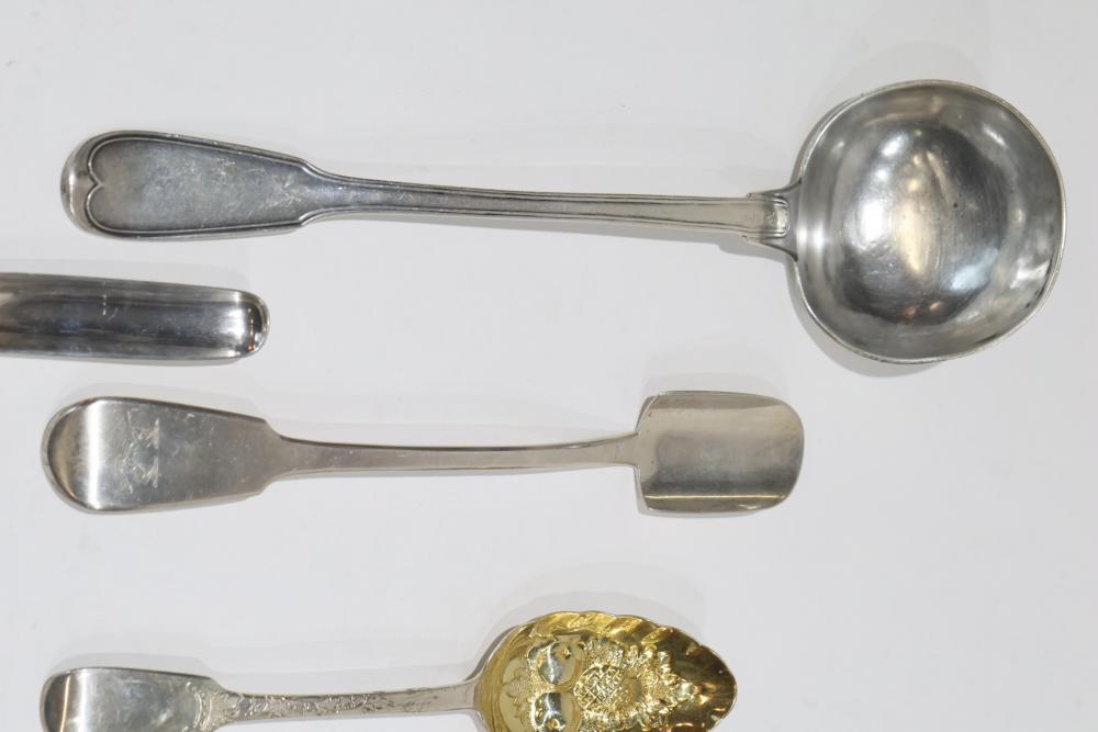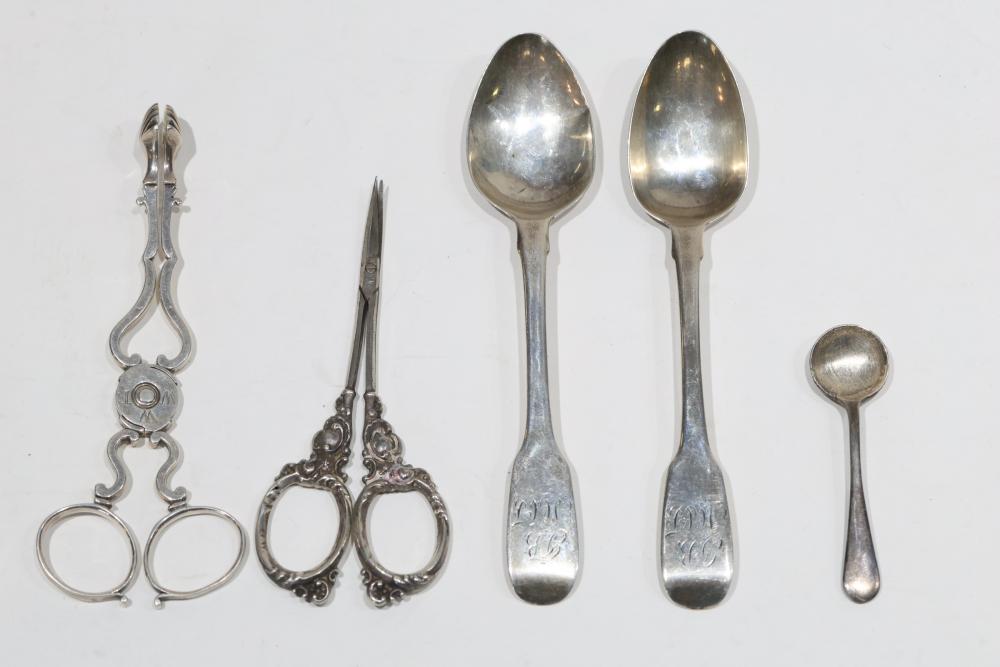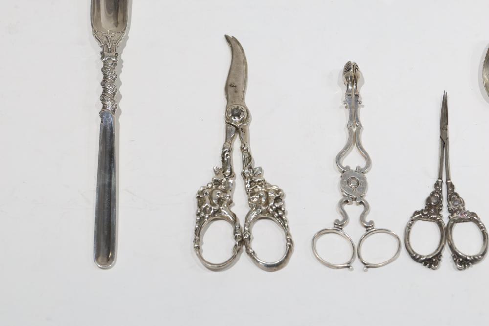 Sterling Silver Utensils with Hallmarks. Includes various pieces such as spoons, tongs, scissors, and ladles, each featuring different hallmarks. Total weight being 937 grams. Test positive for sterling using JSP Testing Solution.