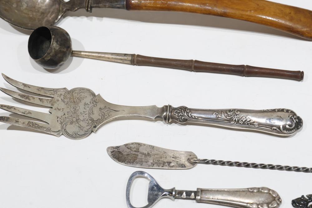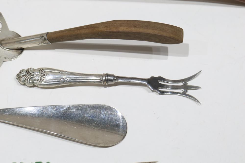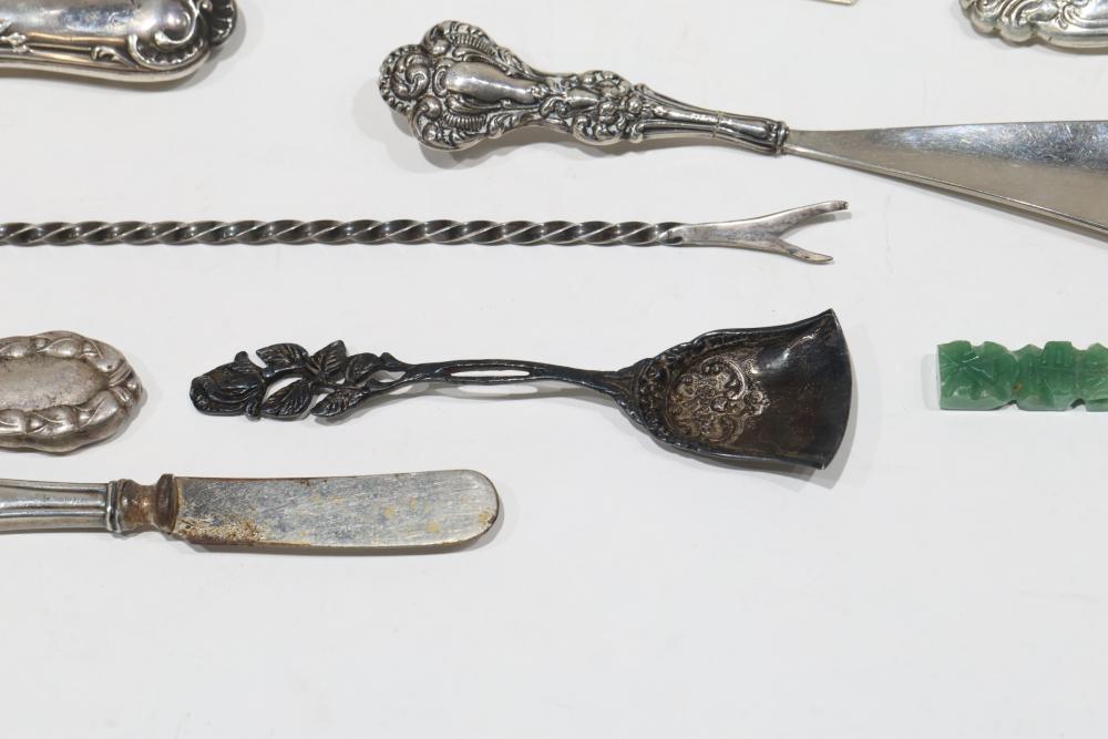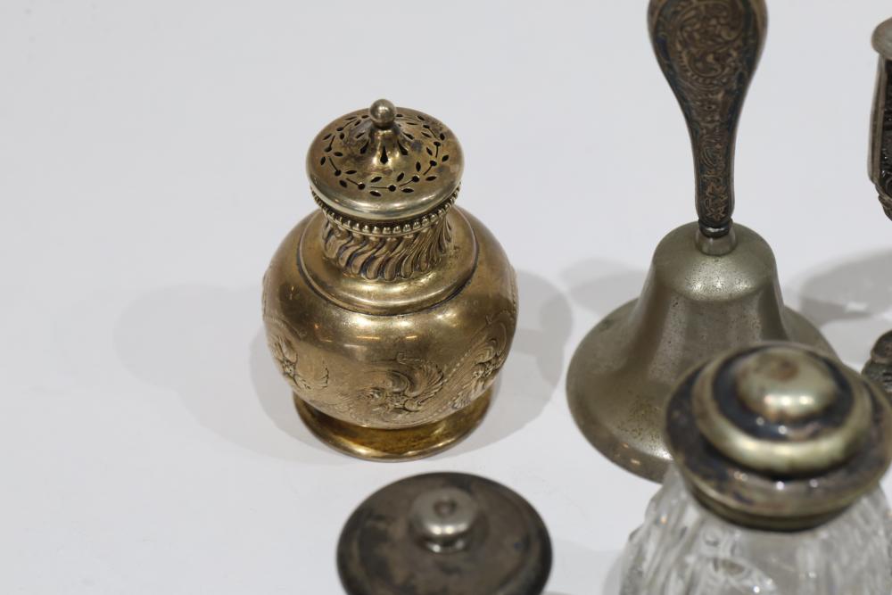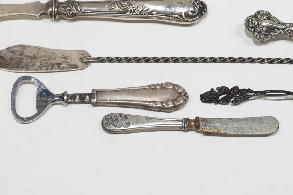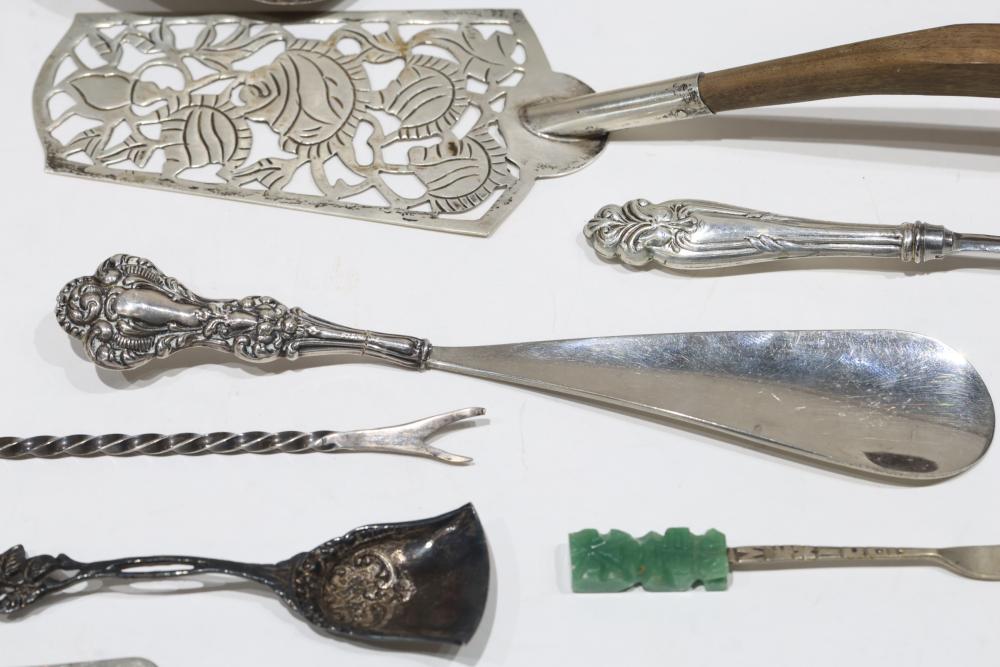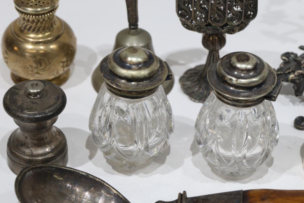 Silver, Metalware, and Utensils With Decorative Elements. Includes a variety of items such as an ornate cruet set, various utensils with decorative handles, a pierced server, salt and pepper shakers, a silver thimble, a bell with engraved handle, and other similar small decorative items. Some items with sterling caps and handles. Pickup only.