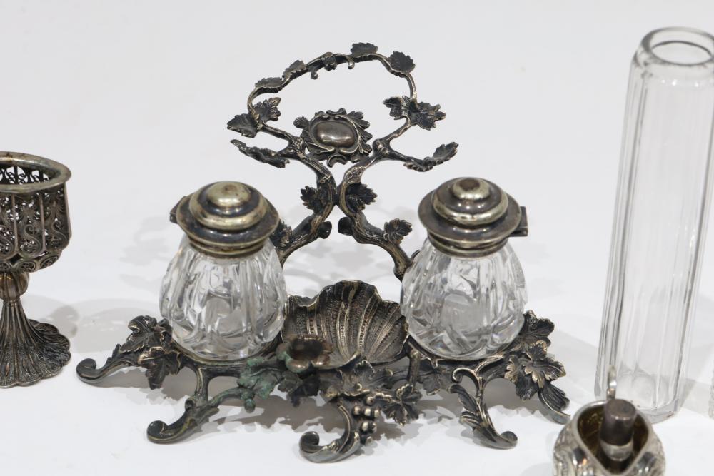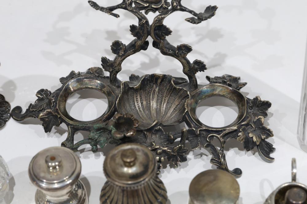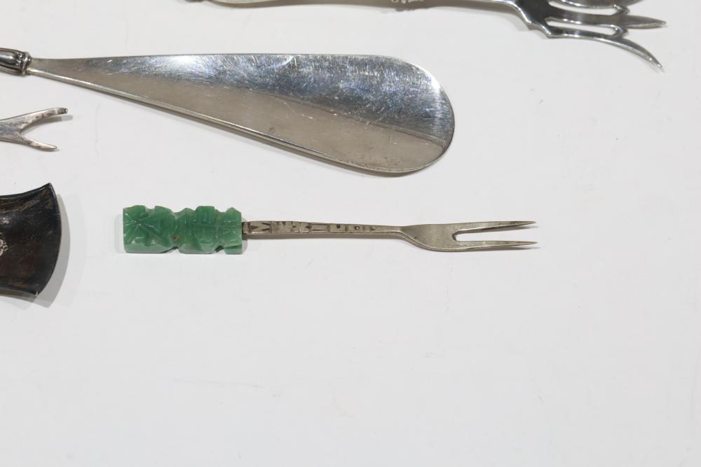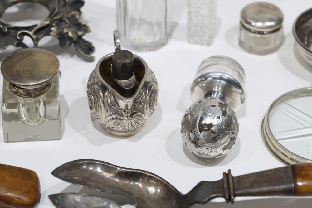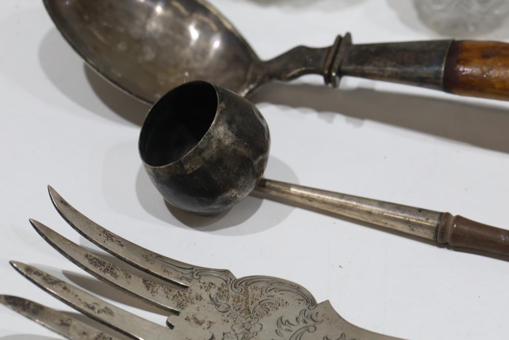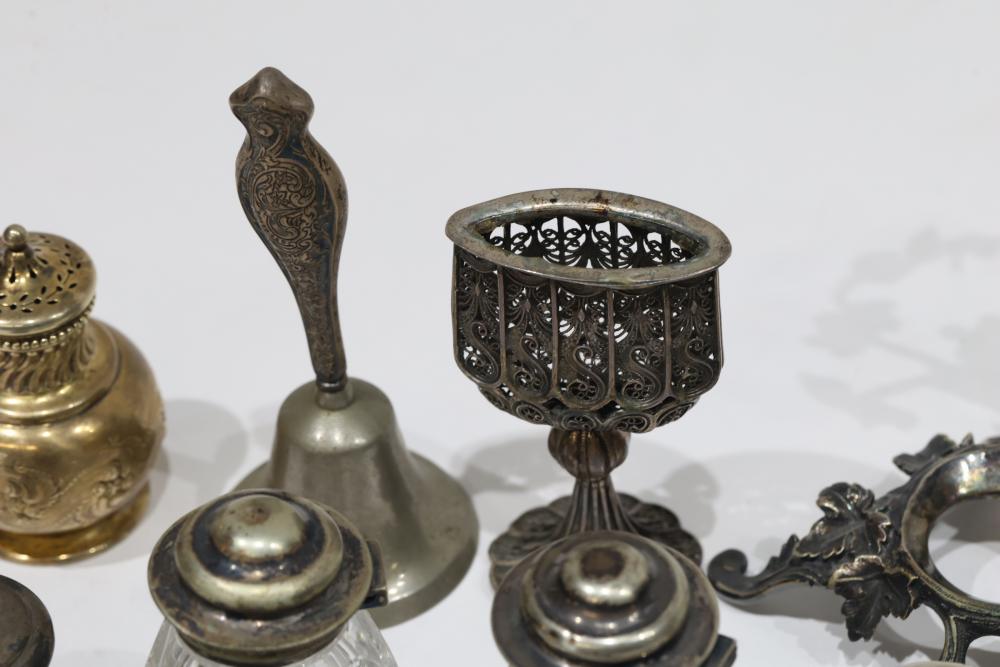 Silver, Metalware, and Utensils With Decorative Elements. Includes a variety of items such as an ornate cruet set, various utensils with decorative handles, a pierced server, salt and pepper shakers, a silver thimble, a bell with engraved handle, and other similar small decorative items. Some items with sterling caps and handles. Pickup only.