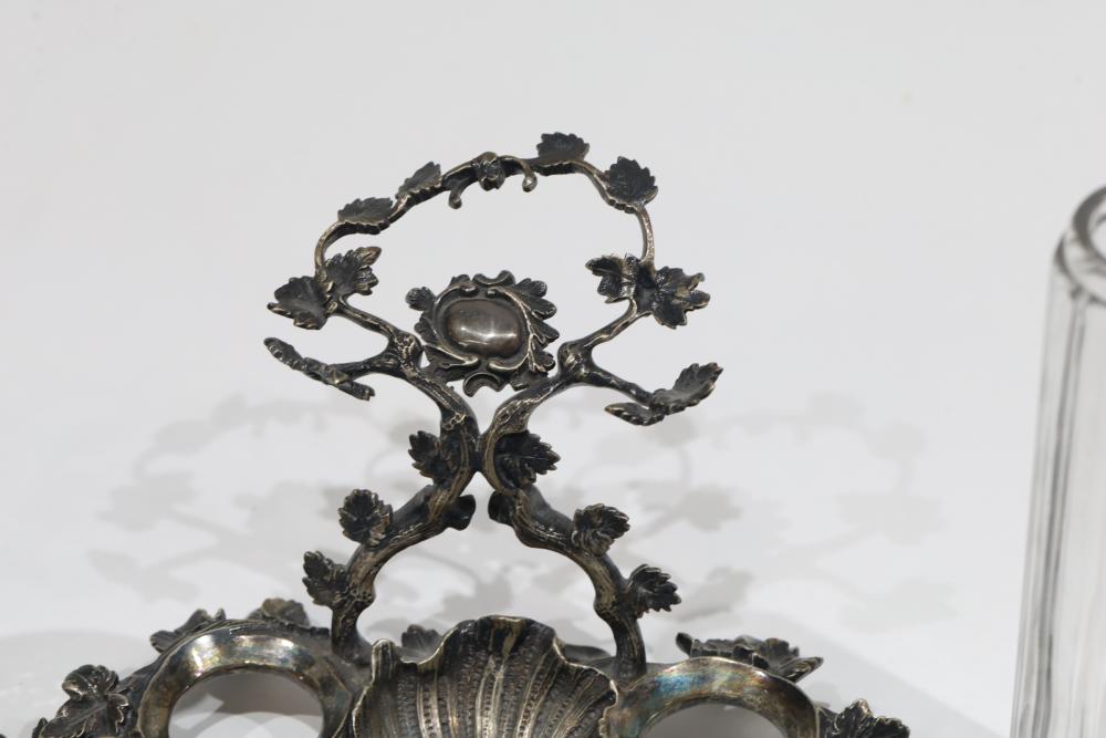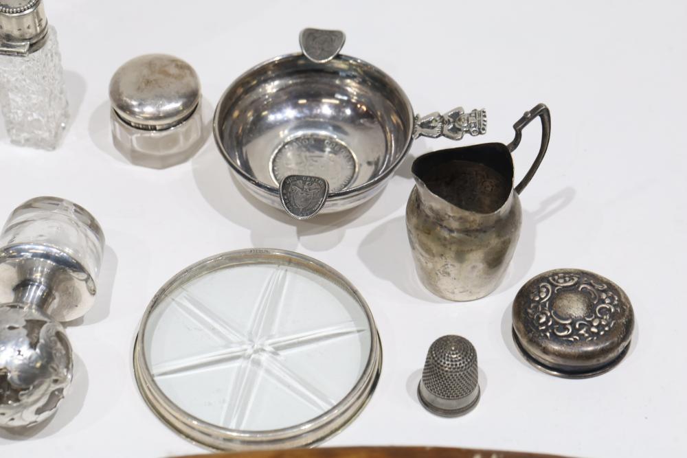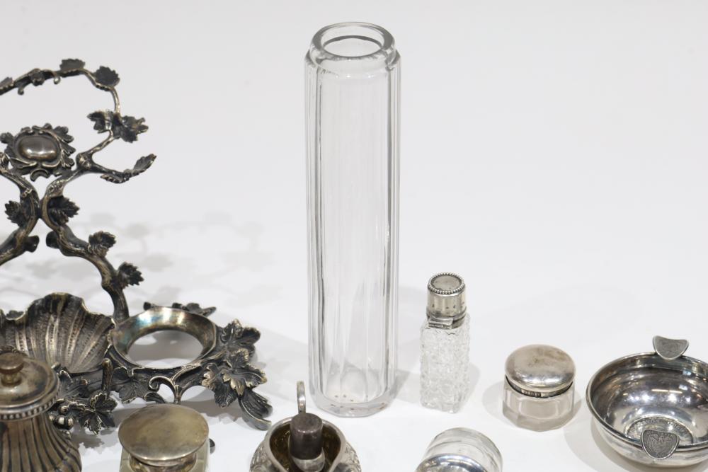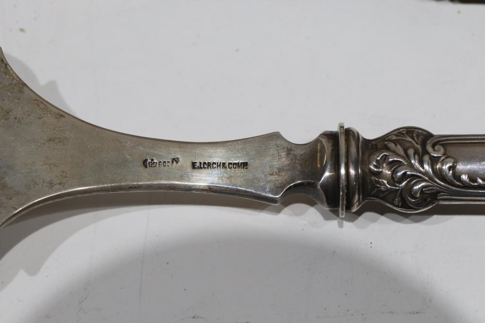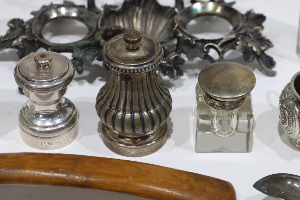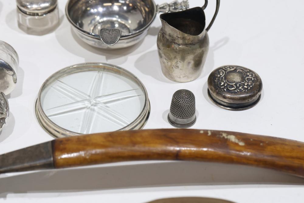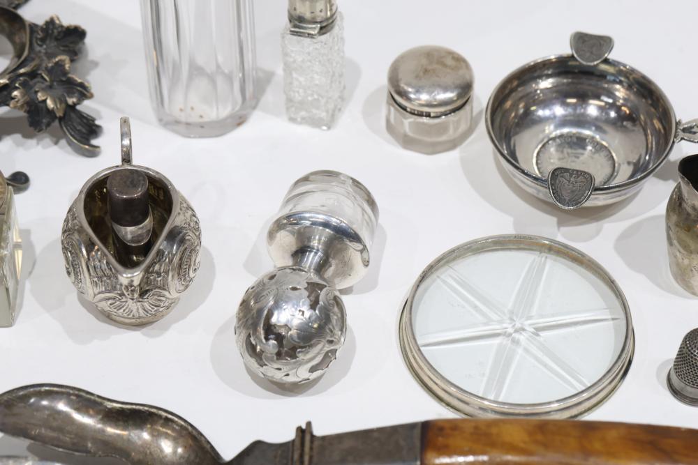 Silver, Metalware, and Utensils With Decorative Elements. Includes a variety of items such as an ornate cruet set, various utensils with decorative handles, a pierced server, salt and pepper shakers, a silver thimble, a bell with engraved handle, and other similar small decorative items. Some items with sterling caps and handles. Pickup only.