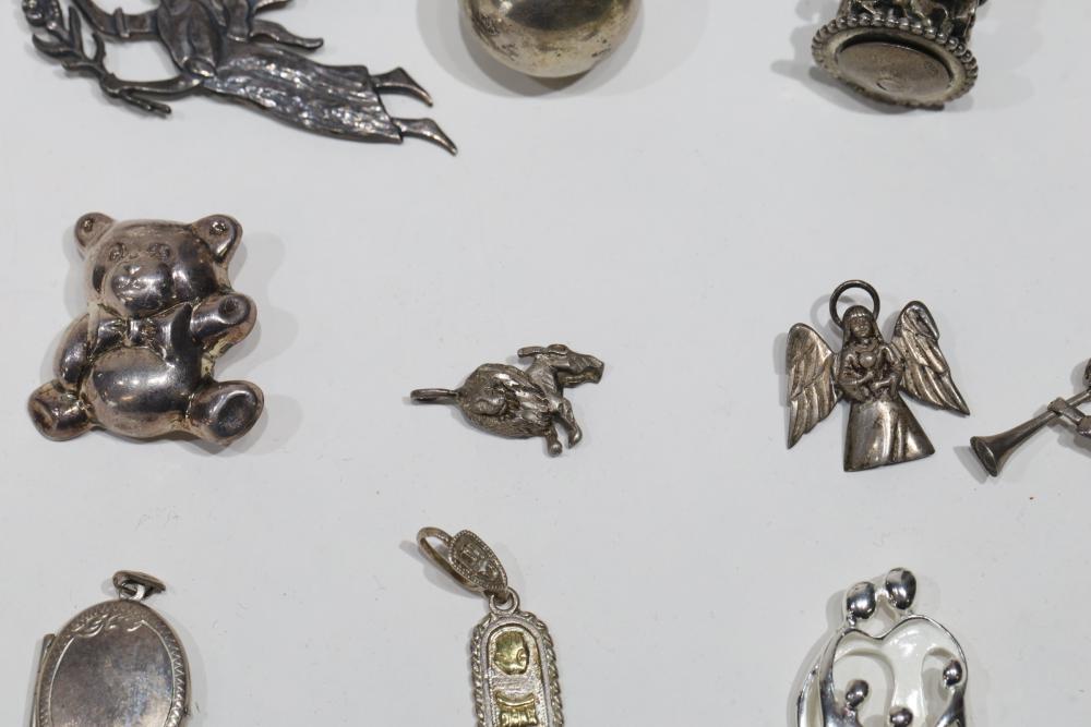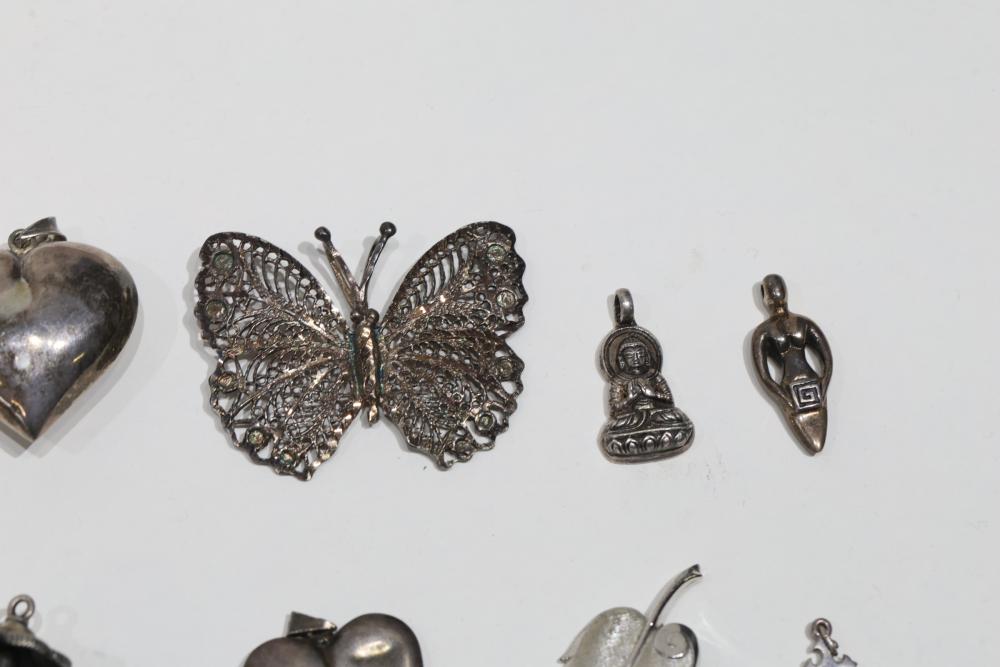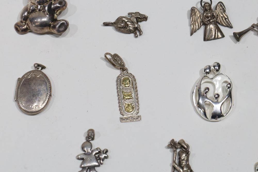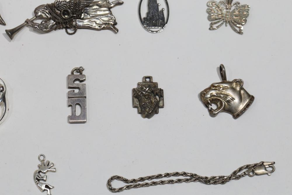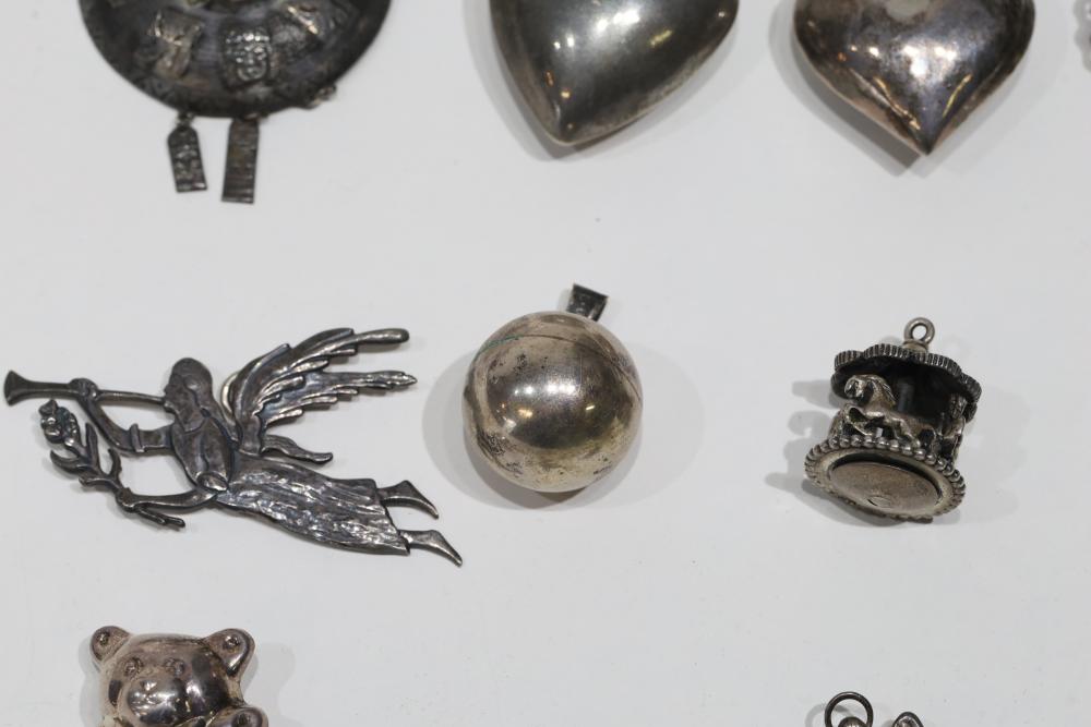 Sterling Silver Jewelry Including Pendants and Charms, with many stamped 925 or sterling. Designs range from hearts, animals, angels, and ornate patterns to abstract figures and symbols. Total weight being 208 grams.