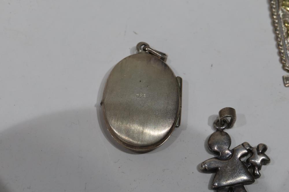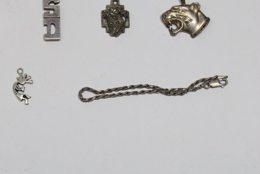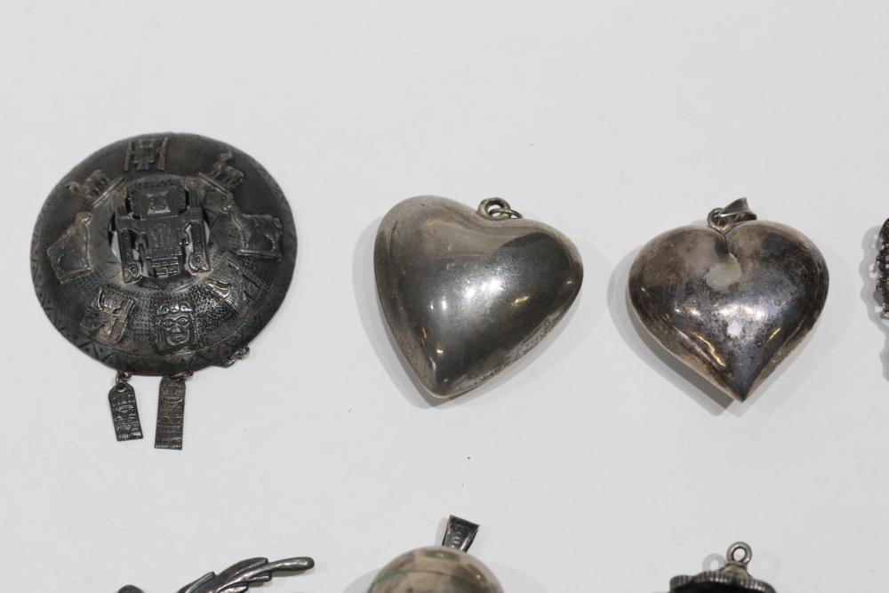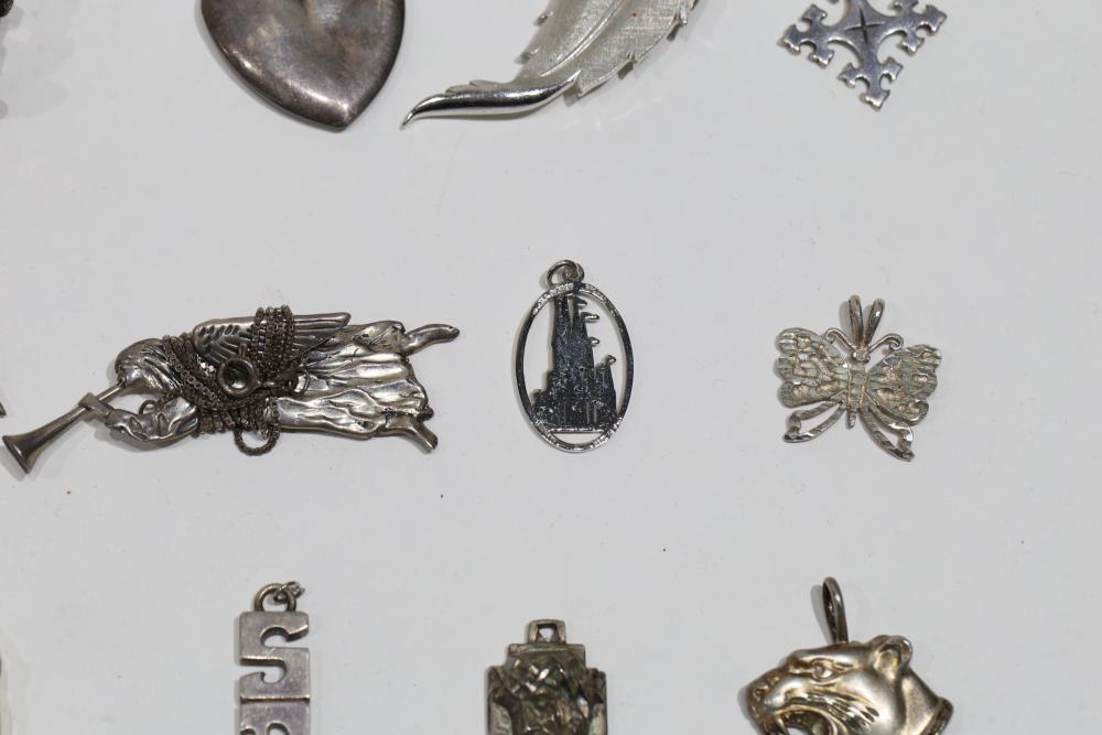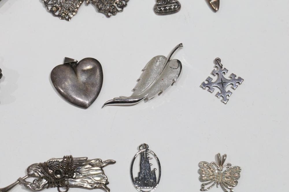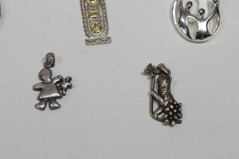 Sterling Silver Jewelry Including Pendants and Charms, with many stamped 925 or sterling. Designs range from hearts, animals, angels, and ornate patterns to abstract figures and symbols. Total weight being 208 grams.