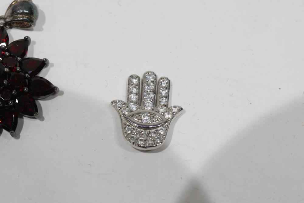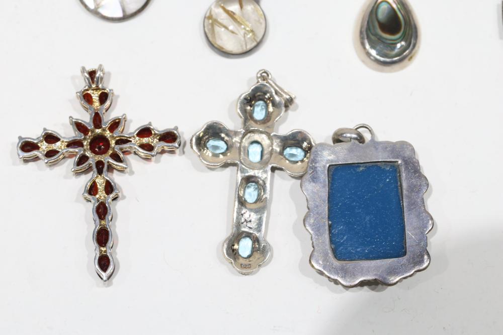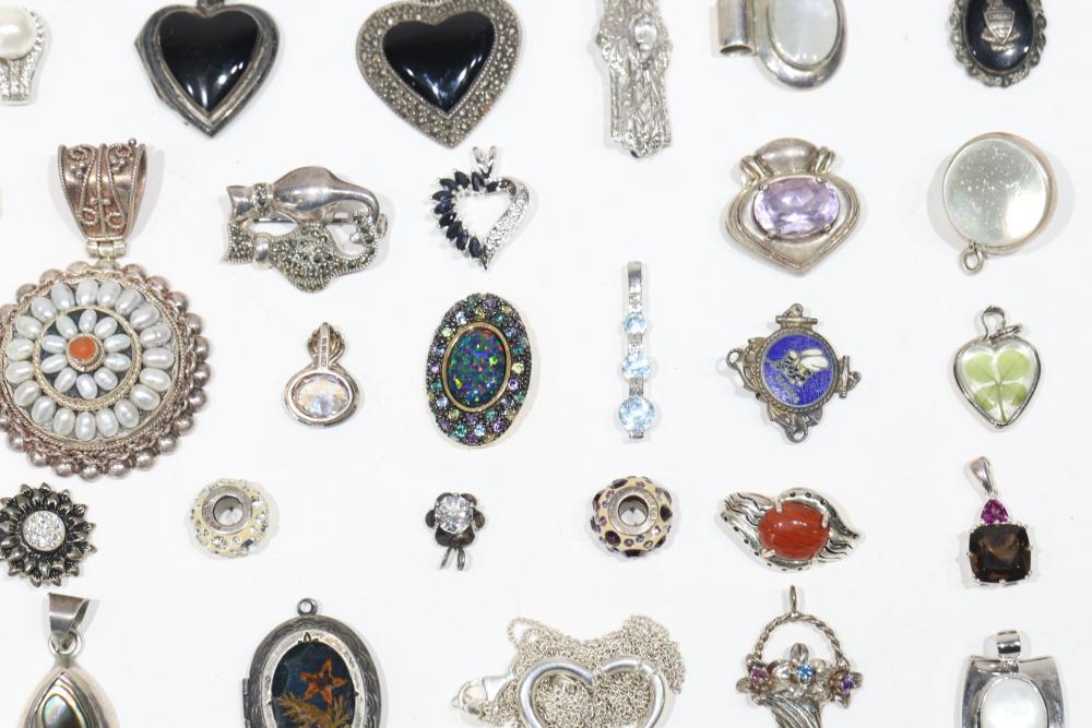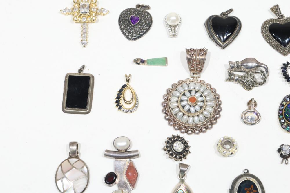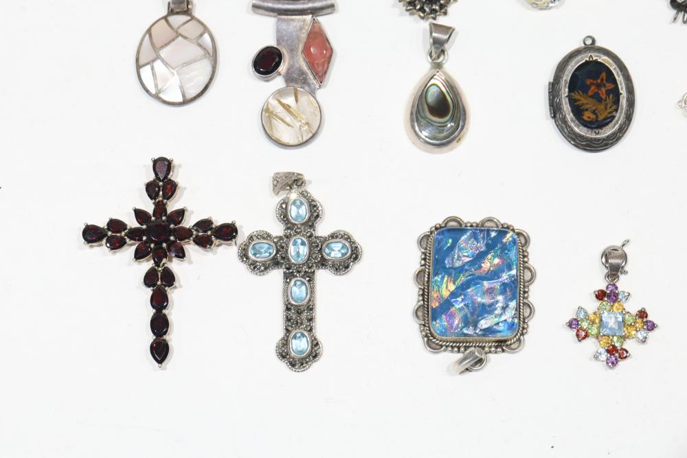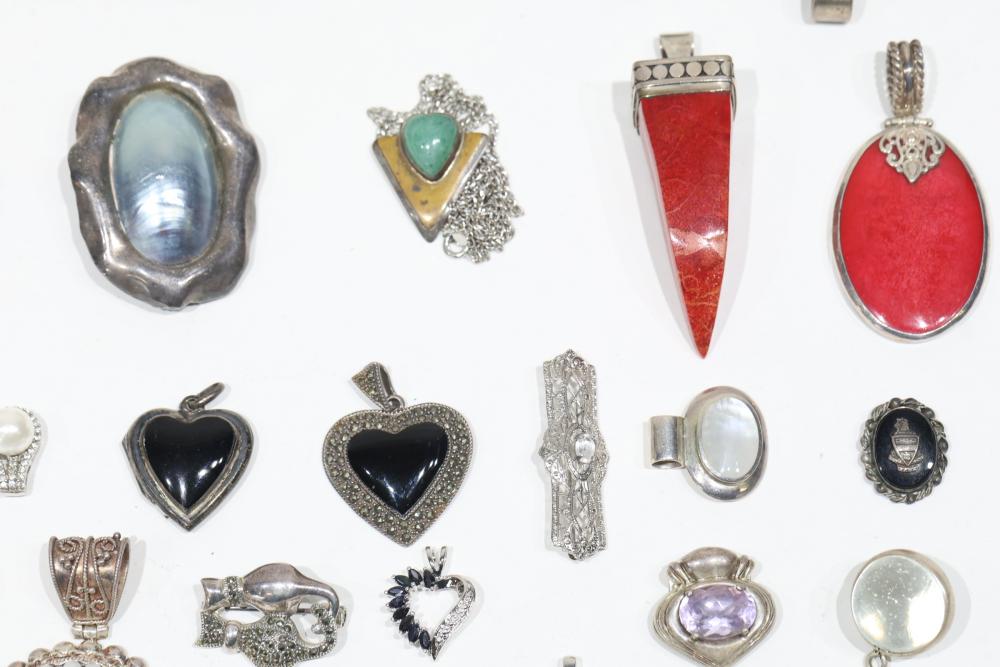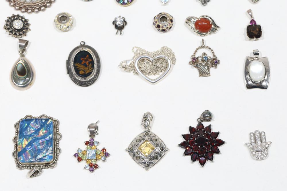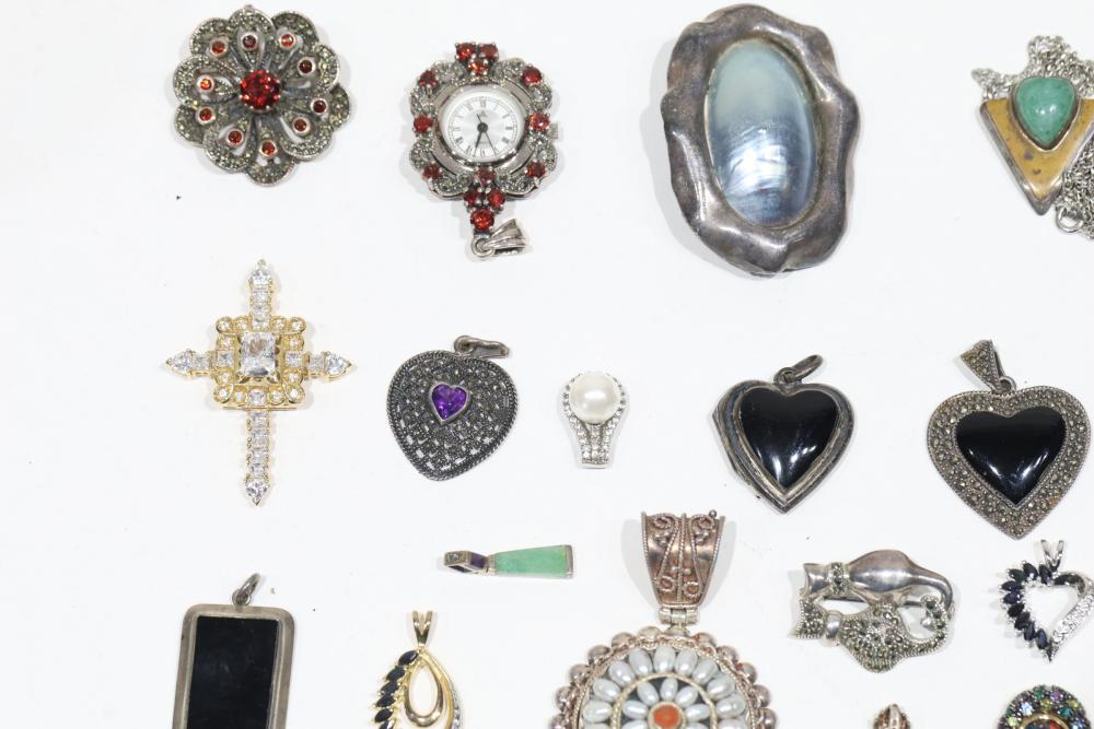 Sterling Silver Jewelry Including Pendants and Brooches. This group includes pendants, brooches, and necklaces. Many items are stamped 925, indicating sterling silver content. Includes a variety of designs and accents, as well as gemstones and decorative elements. Total weight being 412 grams.
